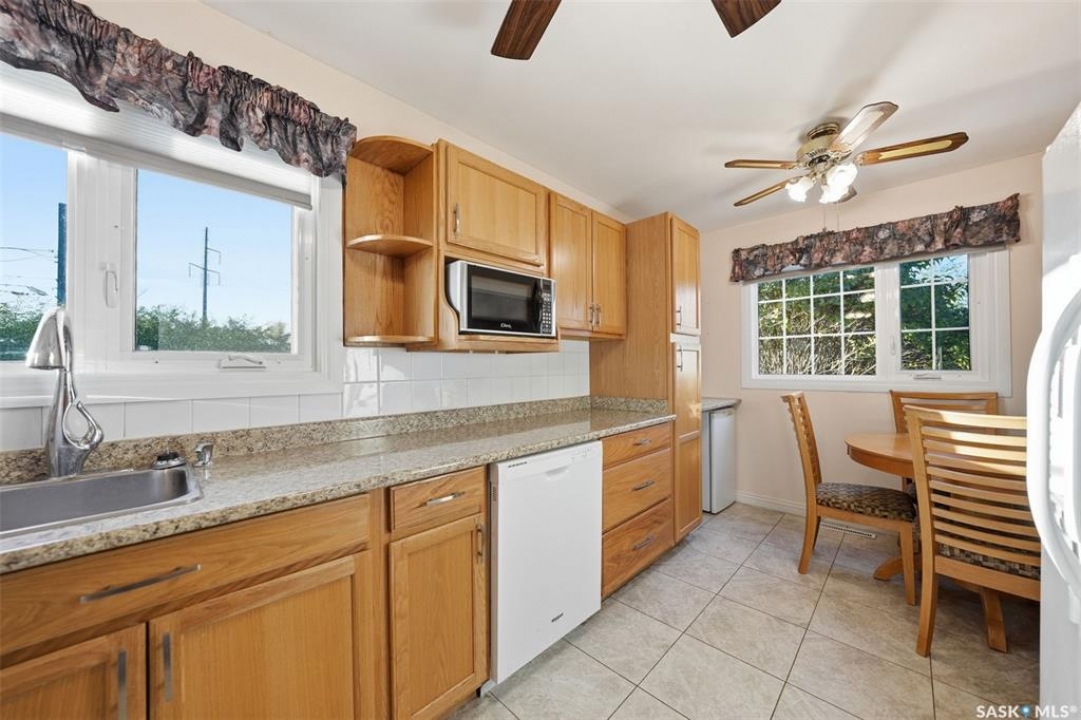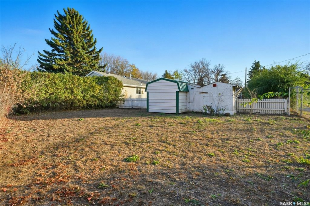 Welcome to 915 Avenue X North in Saskatoon! This charming 1060sqft bungalow offers a comfortable and functional layout, all conveniently situated on a slab—no basement to worry about. The home features three spacious bedrooms, a 4-piece bathroom, a bright living area, and a well-appointed kitchen with updated cabinets, countertops, taps and dining area. Practical touches include a handy laundry, utility closet, plus a separate storage room with shelving and stand up freezer. Numerous updates over the years make this home move-in ready, including a furnace (2006), windows, siding, soffit, fascia, and eaves (2009), water heater (2020), shingles (2020), and bathroom vanity and toilet (2015). The large irregularly shaped, oversized, 9,647 sq. ft. lot is a true standout, offering mature trees, shrubs, garden space, sheds, and plenty of room to build your dream garage. With green space directly behind, you'll enjoy a private and tranquil yard perfect for relaxing or entertaining. This well-cared-for home shows great and is ready for its next owners to move right in and enjoy!