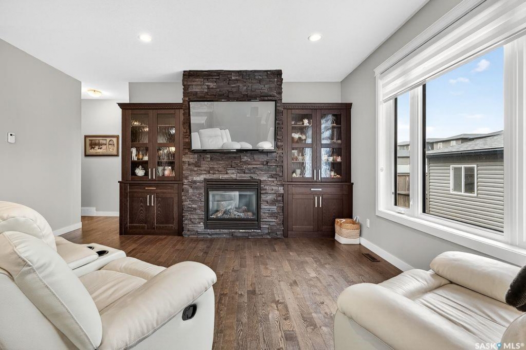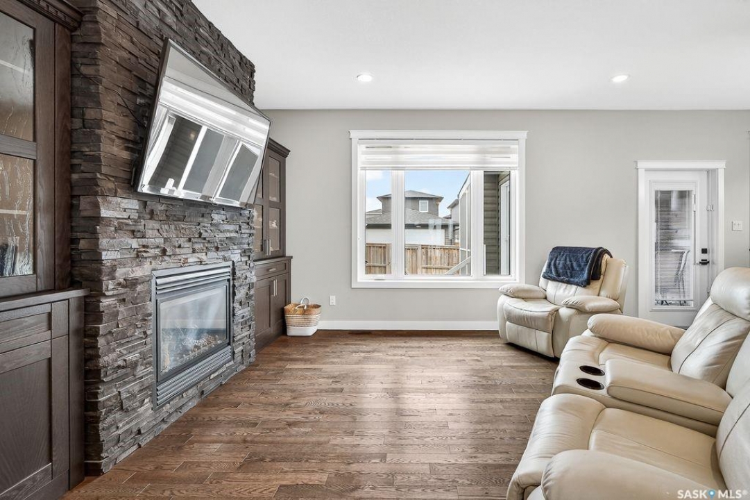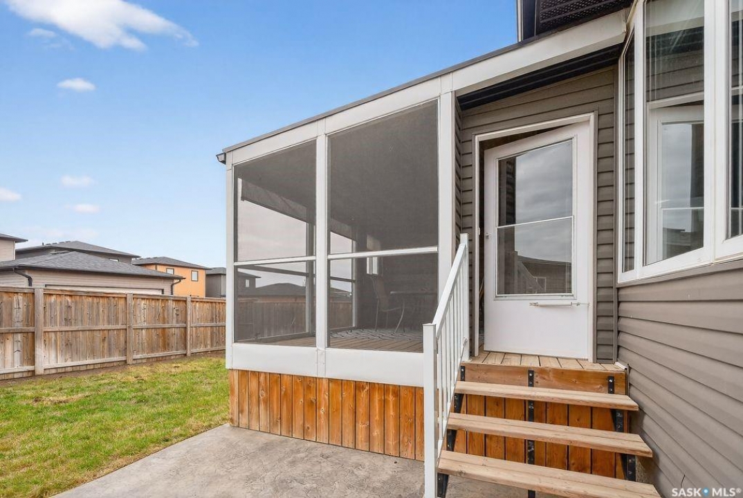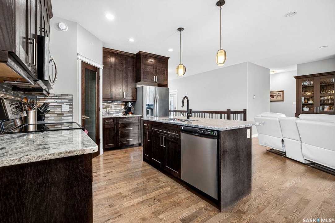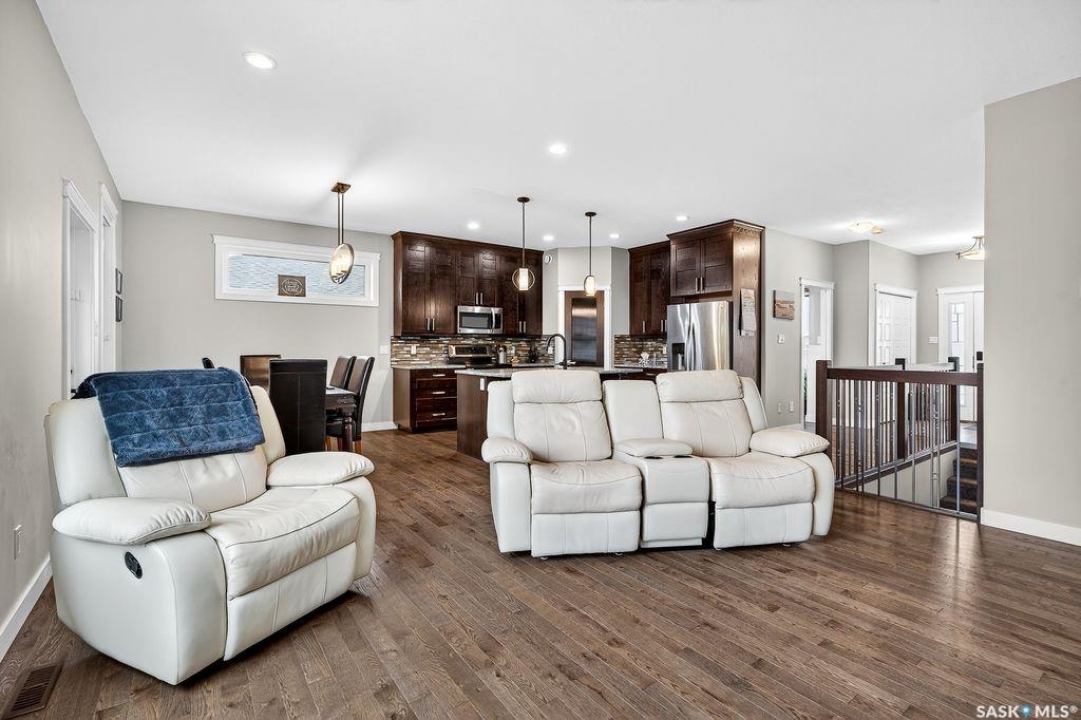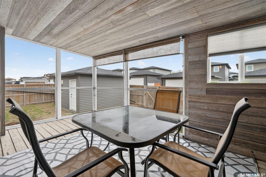 Welcome to 171 Wellington Drive! This beautiful 5-bedroom, 3-bathroom home, built in 2015, offers all the modern conveniences of newer construction. As you enter, you're greeted by 9-foot ceilings and a spacious foyer with direct access to the heated and insulated double attached garage. The main floor features hardwood flooring, stylish tiled bathrooms, and solid surface granite countertops throughout. The open-concept kitchen includes an oversized walk-in pantry, perfect for storage and organization. The living room boasts built-in cabinetry and a cozy gas fireplace, ideal for those chilly Saskatchewan winters. You'll also find main floor laundry for added convenience. The master bedroom includes a built-in window bench with cabinetry, a full 4-piece ensuite bath, and a walk-in closet. Two additional main floor bedrooms provide ample space for family or guests, along with another full 4-piece bathroom. The fully developed lower level offers a spacious family room, two more bedrooms, another 4-piece bath, a utility room, and a dedicated storage area. This home comes with all appliances included, as well as central air, central vac, a high-efficiency furnace, and hot water on demand. Outside, the property is fully landscaped and fenced, with underground sprinklers, a large shed (14' x 14' ) on a concrete pad, enclosed screened-in deck off the dining area—finished with authentic barnboard and privacy walls, making it perfect for three-season enjoyment. Located just around the corner from a newly opened school, this home is ideal for families seeking comfort, convenience, and quality. If this sounds like what you're looking for, don't miss your chance to take a peek!