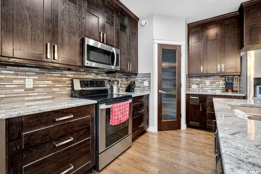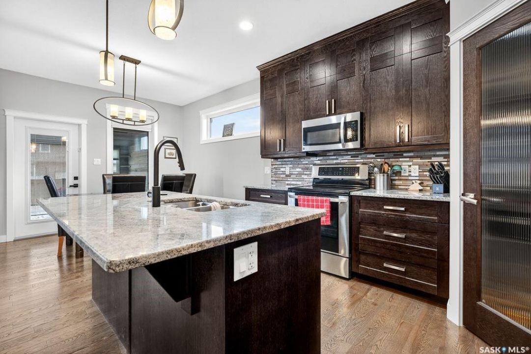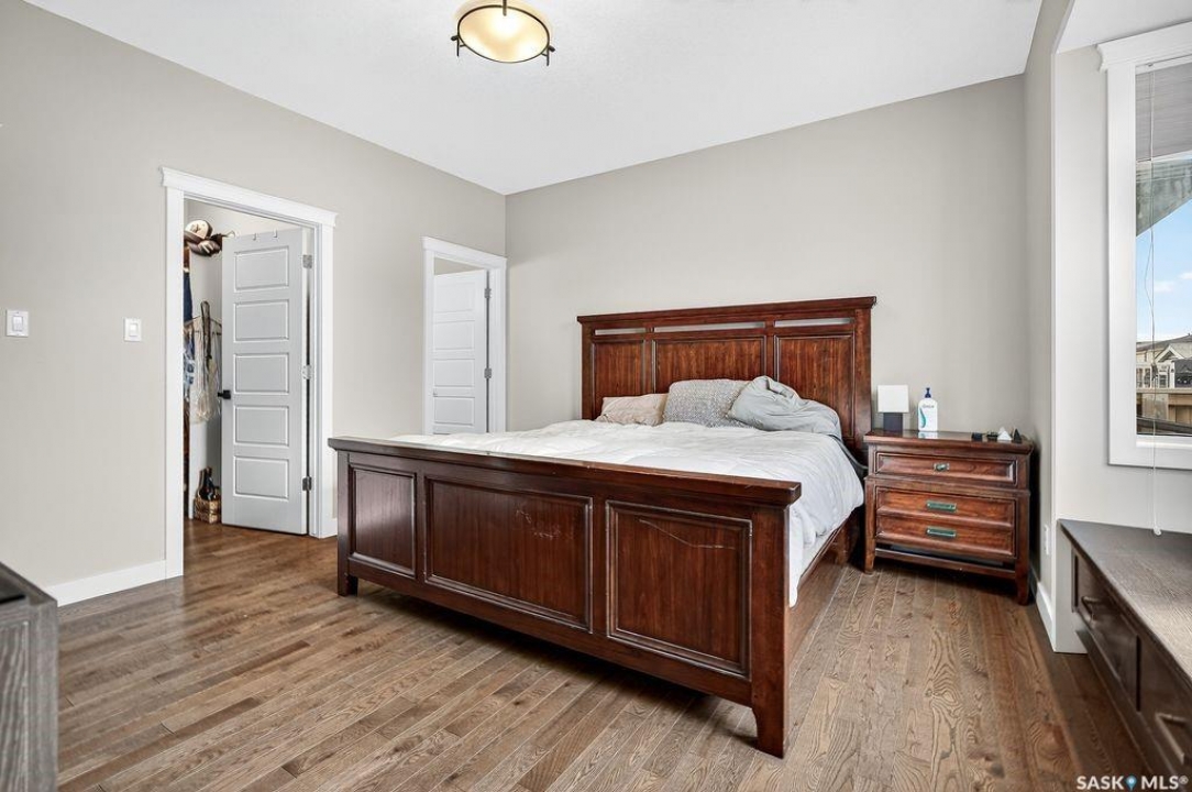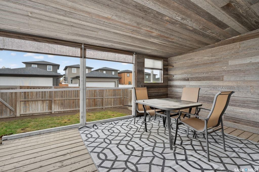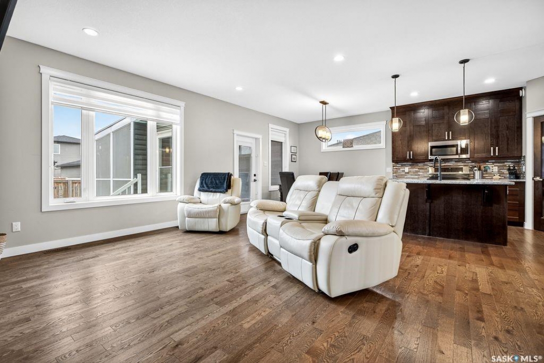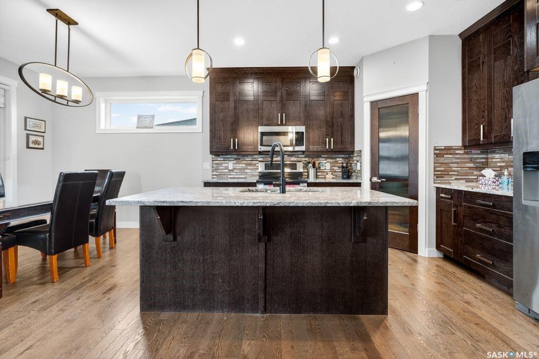Welcome to 171 Wellington Drive! This beautiful 5-bedroom, 3-bathroom home, built in 2015, offers all the modern conveniences of newer construction. As you enter, you're greeted by 9-foot ceilings and a spacious foyer with direct access to the heated and insulated double attached garage. The main floor features hardwood flooring, stylish tiled bathrooms, and solid surface granite countertops throughout. The open-concept kitchen includes an oversized walk-in pantry, perfect for storage and organization. The living room boasts built-in cabinetry and a cozy gas fireplace, ideal for those chilly Saskatchewan winters. You'll also find main floor laundry for added convenience. The master bedroom includes a built-in window bench with cabinetry, a full 4-piece ensuite bath, and a walk-in closet. Two additional main floor bedrooms provide ample space for family or guests, along with another full 4-piece bathroom. The fully developed lower level offers a spacious family room, two more bedrooms, another 4-piece bath, a utility room, and a dedicated storage area. This home comes with all appliances included, as well as central air, central vac, a high-efficiency furnace, and hot water on demand. Outside, the property is fully landscaped and fenced, with underground sprinklers, a large shed (14' x 14' ) on a concrete pad, enclosed screened-in deck off the dining area—finished with authentic barnboard and privacy walls, making it perfect for three-season enjoyment. Located just around the corner from a newly opened school, this home is ideal for families seeking comfort, convenience, and quality. If this sounds like what you're looking for, don't miss your chance to take a peek!