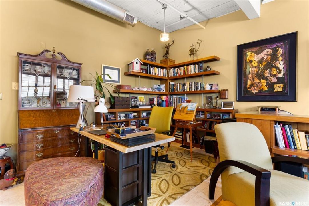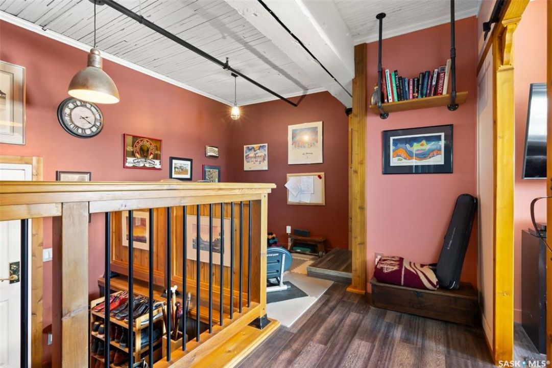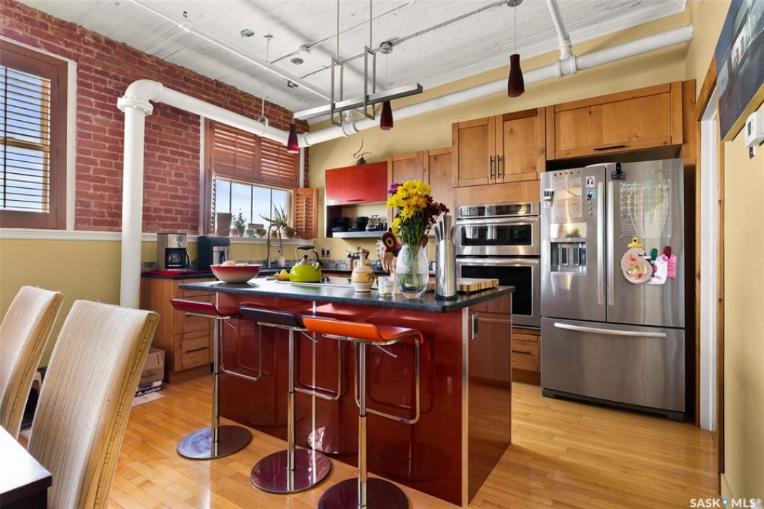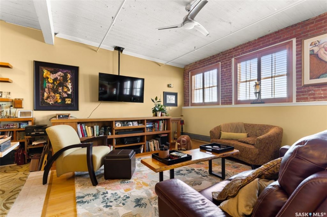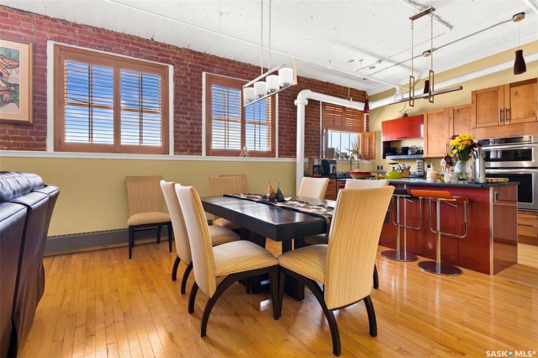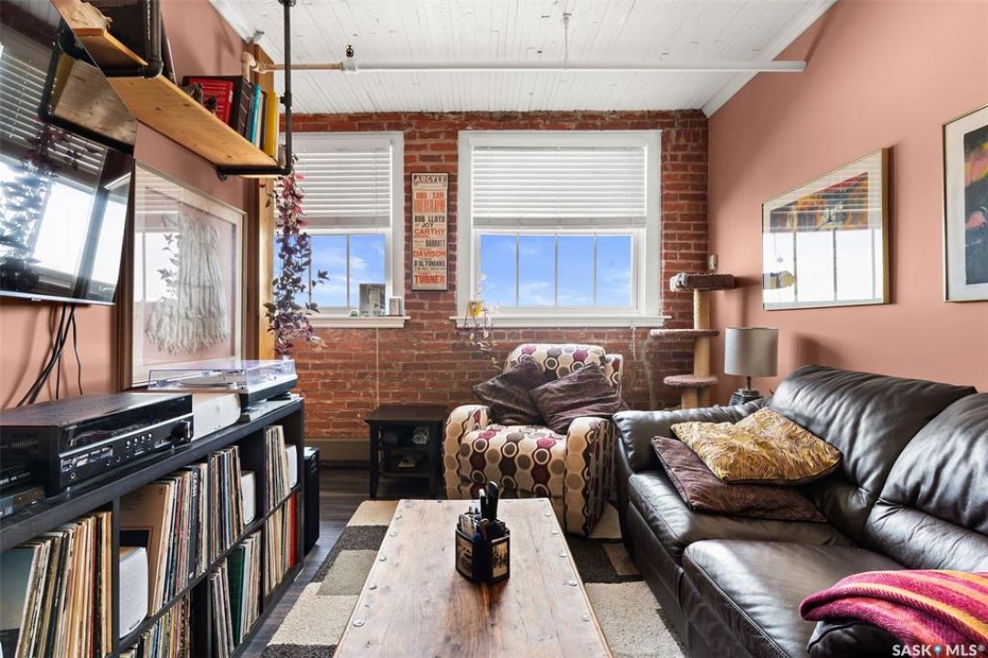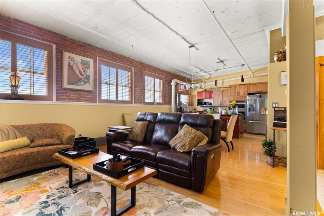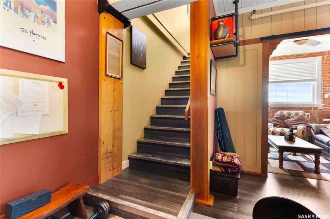 Ready to live where Regina's energy is at its peak? Welcome to the Warehouse District—where craft breweries, late-night bites, boutique gyms, and live music venues are all part of your backyard. Say hello to 508–1275 Broad Street, a seriously cool two-storey loft in the historic Brownstone Plaza (The former John Deere Plow Company building from 1913—now a registered Canadian Historic Site). This 1,704 sq. ft. condo nails that industrial-meets-modern vibe, with exposed piping, reclaimed 100-year-old wood accents including the custom bookshelves and thoughtful design details that give a nod to the building's roots. The main level flows effortlessly with a bright living area where you can catch the Blue Jays win the 2025 World Series, a dining space perfect for hosting dinner parties and sleek kitchen, plus a walk-in pantry and half bath. Downstairs, you'll find a den (or second bedroom), a corner at home gym space, a full bath that was recently renovated and a dreamy primary suite with a walk-in closet and laundry setup. You'll also score a single garage with the option for extra parking nearby. And when it's time to unwind? Head up to the rooftop patio, your own bird's-eye hangout with a designated space to build out your perfect deck and soak in those epic Warehouse District views with the infamous Saskatchewan sunsets as your backdrop.