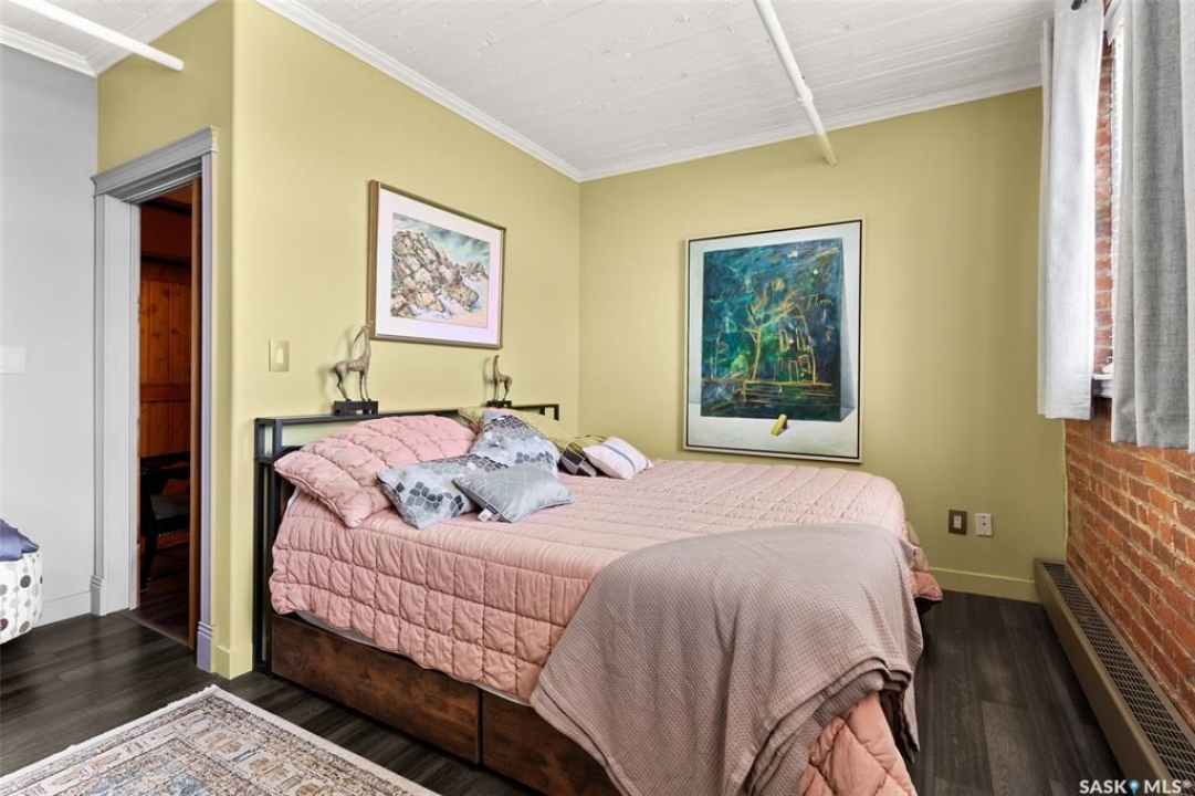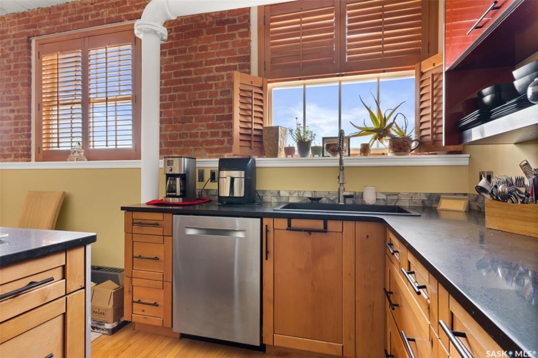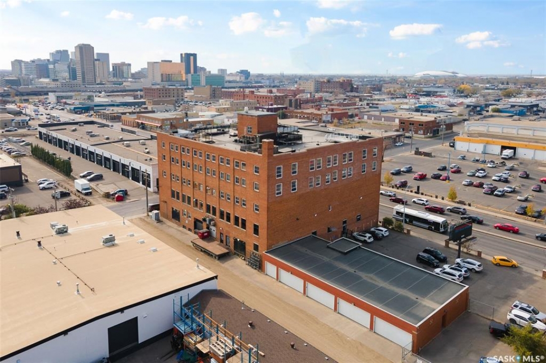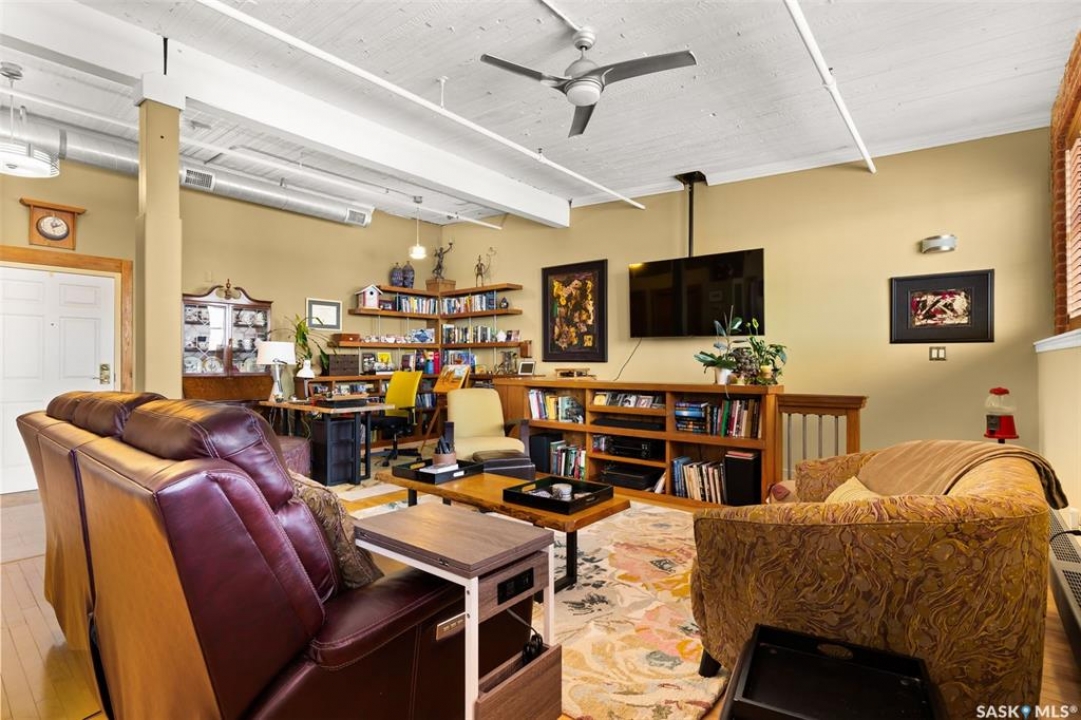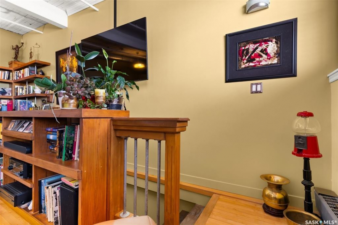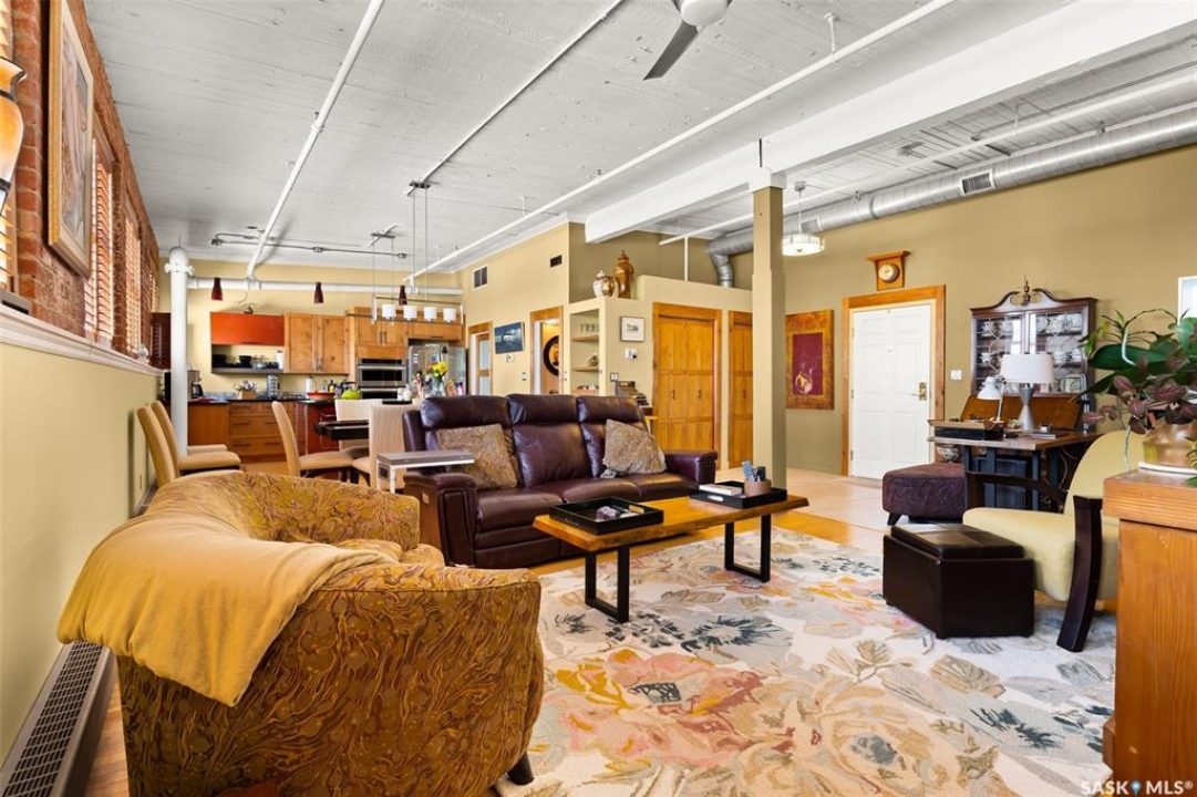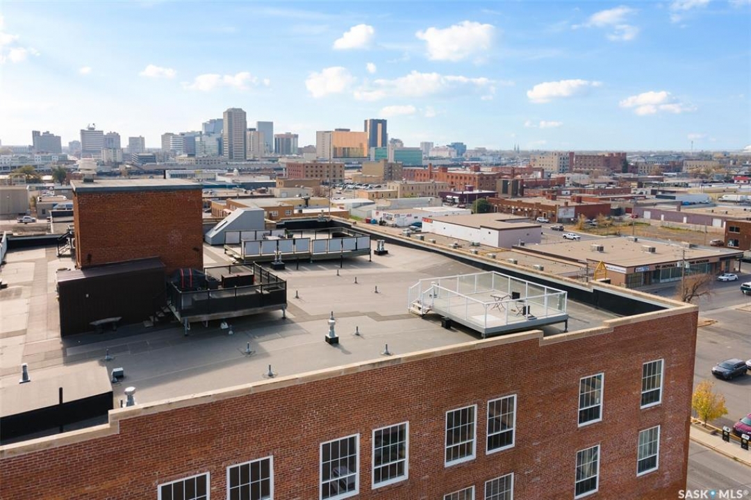 Ready to live where Regina's energy is at its peak? Welcome to the Warehouse District—where craft breweries, late-night bites, boutique gyms, and live music venues are all part of your backyard. Say hello to 508–1275 Broad Street, a seriously cool two-storey loft in the historic Brownstone Plaza (The former John Deere Plow Company building from 1913—now a registered Canadian Historic Site). This 1,704 sq. ft. condo nails that industrial-meets-modern vibe, with exposed piping, reclaimed 100-year-old wood accents including the custom bookshelves and thoughtful design details that give a nod to the building's roots. The main level flows effortlessly with a bright living area where you can catch the Blue Jays win the 2025 World Series, a dining space perfect for hosting dinner parties and sleek kitchen, plus a walk-in pantry and half bath. Downstairs, you'll find a den (or second bedroom), a corner at home gym space, a full bath that was recently renovated and a dreamy primary suite with a walk-in closet and laundry setup. You'll also score a single garage with the option for extra parking nearby. And when it's time to unwind? Head up to the rooftop patio, your own bird's-eye hangout with a designated space to build out your perfect deck and soak in those epic Warehouse District views with the infamous Saskatchewan sunsets as your backdrop.