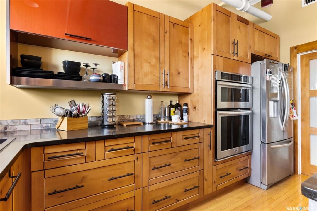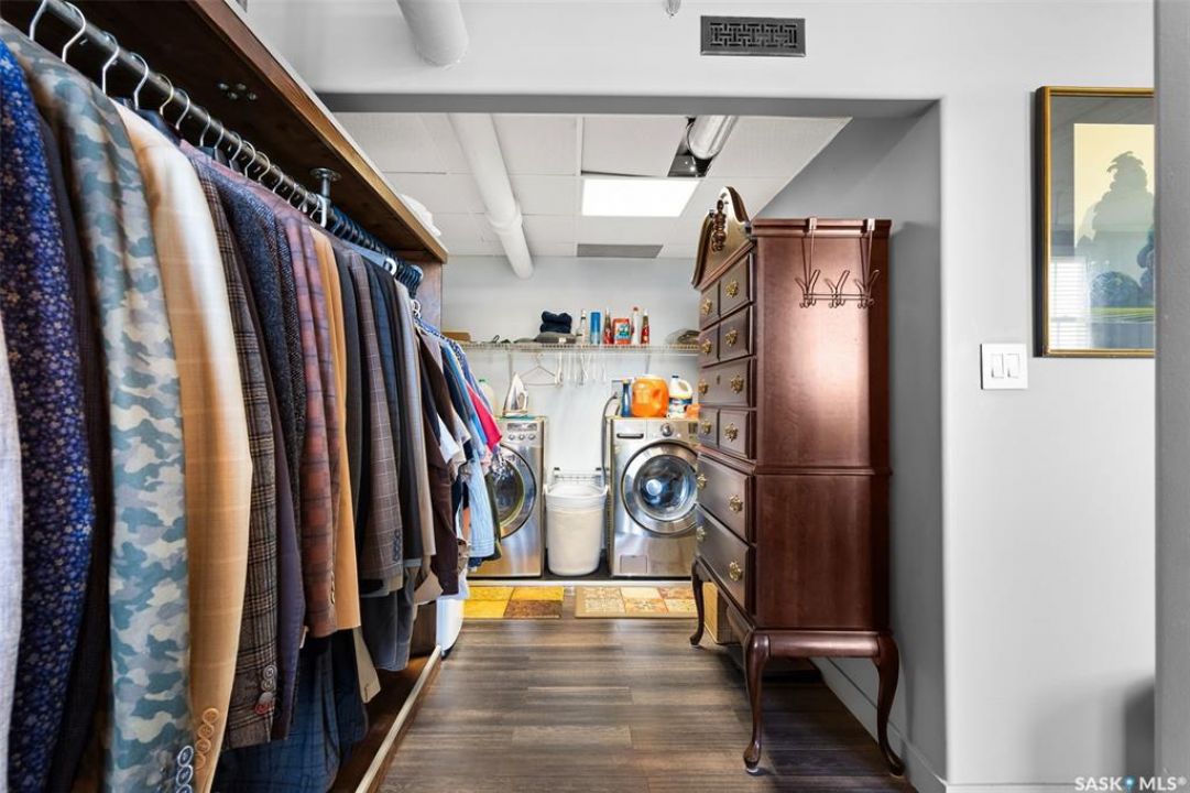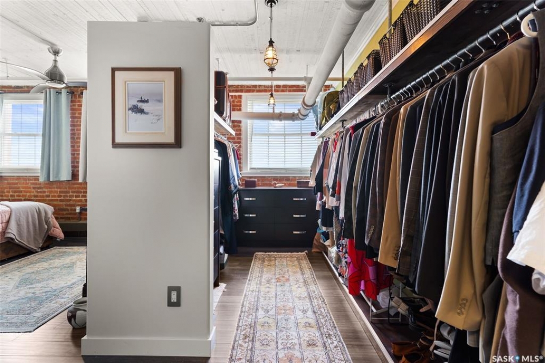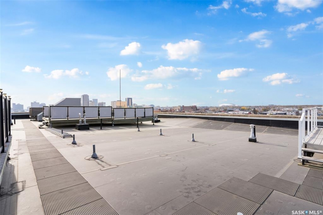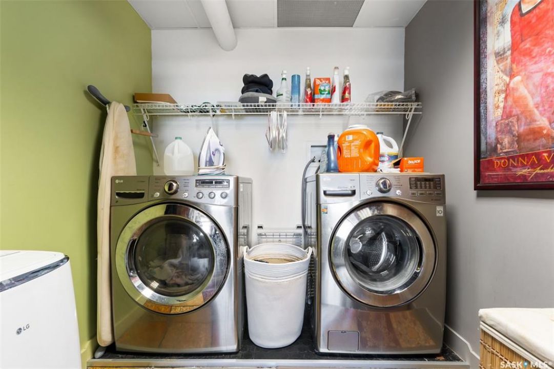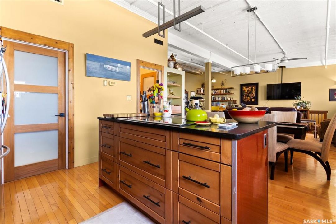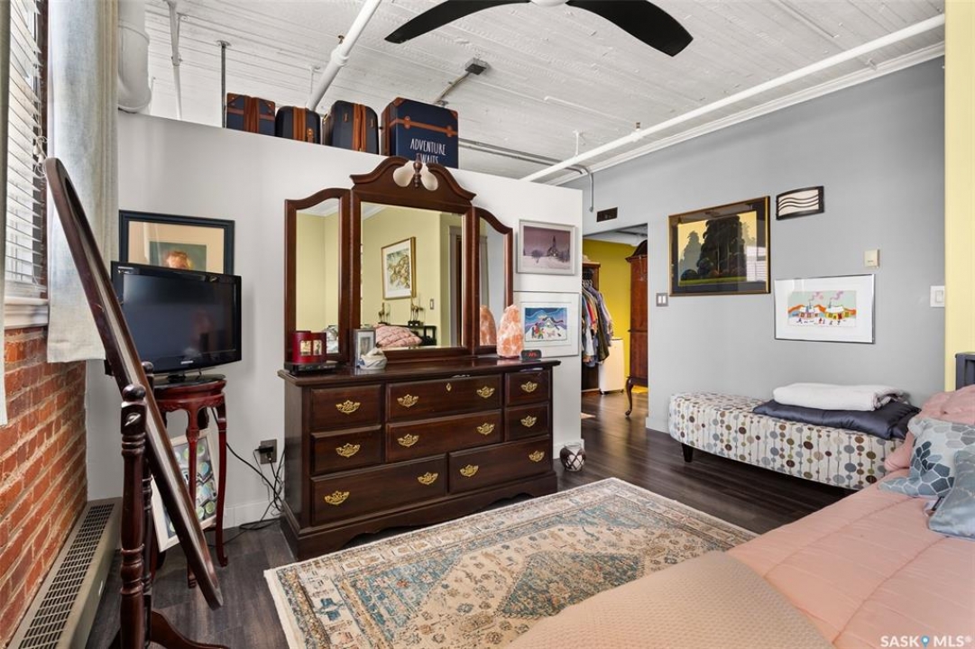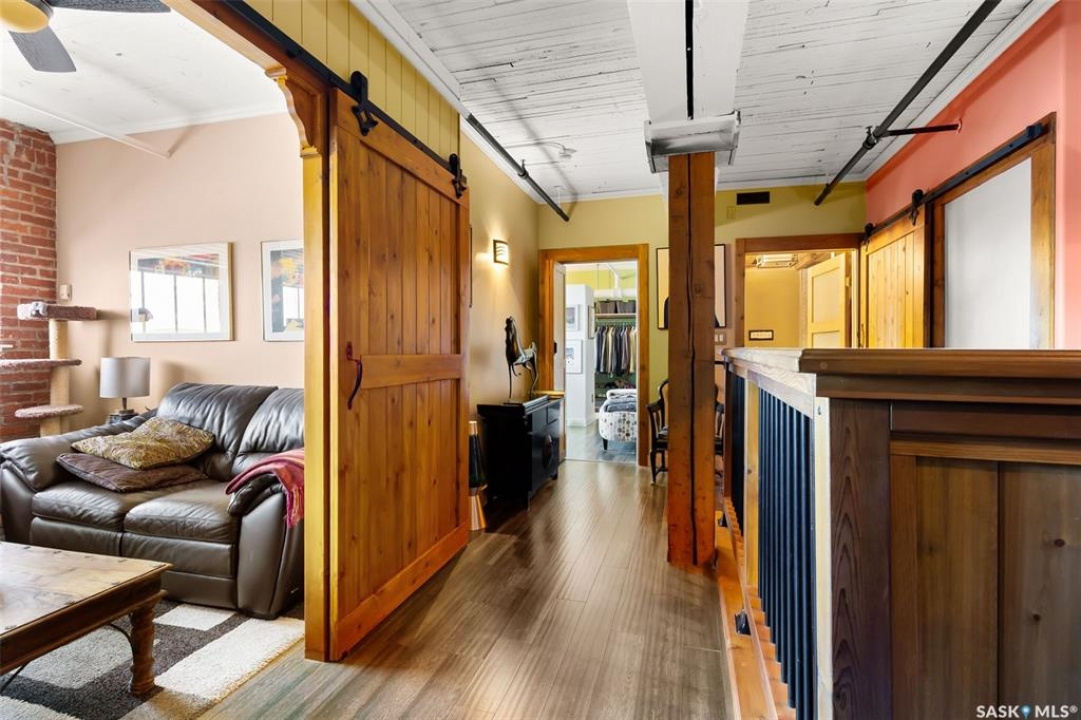 Ready to live where Regina's energy is at its peak? Welcome to the Warehouse District—where craft breweries, late-night bites, boutique gyms, and live music venues are all part of your backyard. Say hello to 508–1275 Broad Street, a seriously cool two-storey loft in the historic Brownstone Plaza (The former John Deere Plow Company building from 1913—now a registered Canadian Historic Site). This 1,704 sq. ft. condo nails that industrial-meets-modern vibe, with exposed piping, reclaimed 100-year-old wood accents including the custom bookshelves and thoughtful design details that give a nod to the building's roots. The main level flows effortlessly with a bright living area where you can catch the Blue Jays win the 2025 World Series, a dining space perfect for hosting dinner parties and sleek kitchen, plus a walk-in pantry and half bath. Downstairs, you'll find a den (or second bedroom), a corner at home gym space, a full bath that was recently renovated and a dreamy primary suite with a walk-in closet and laundry setup. You'll also score a single garage with the option for extra parking nearby. And when it's time to unwind? Head up to the rooftop patio, your own bird's-eye hangout with a designated space to build out your perfect deck and soak in those epic Warehouse District views with the infamous Saskatchewan sunsets as your backdrop.