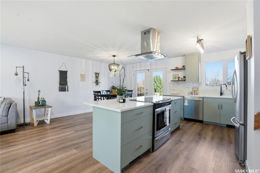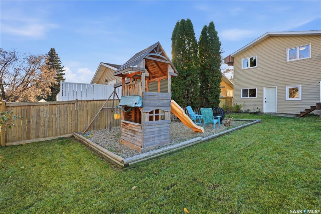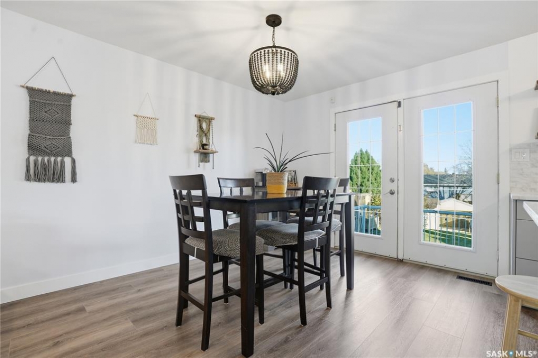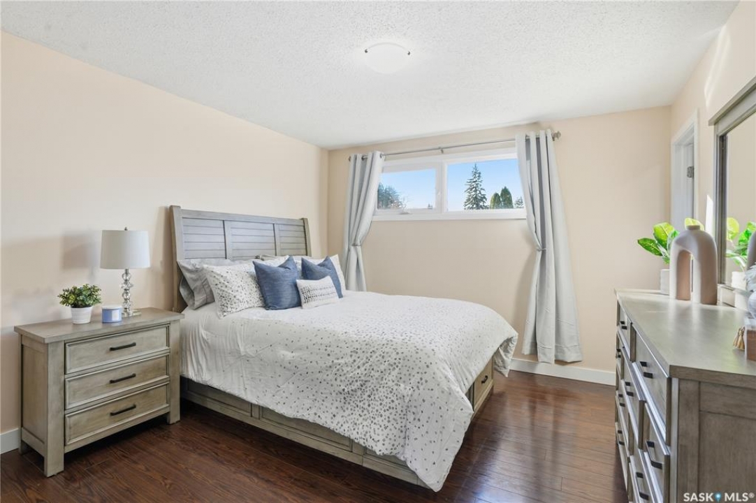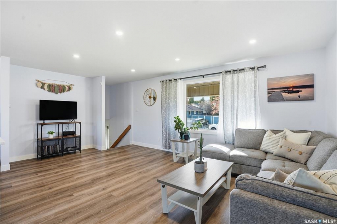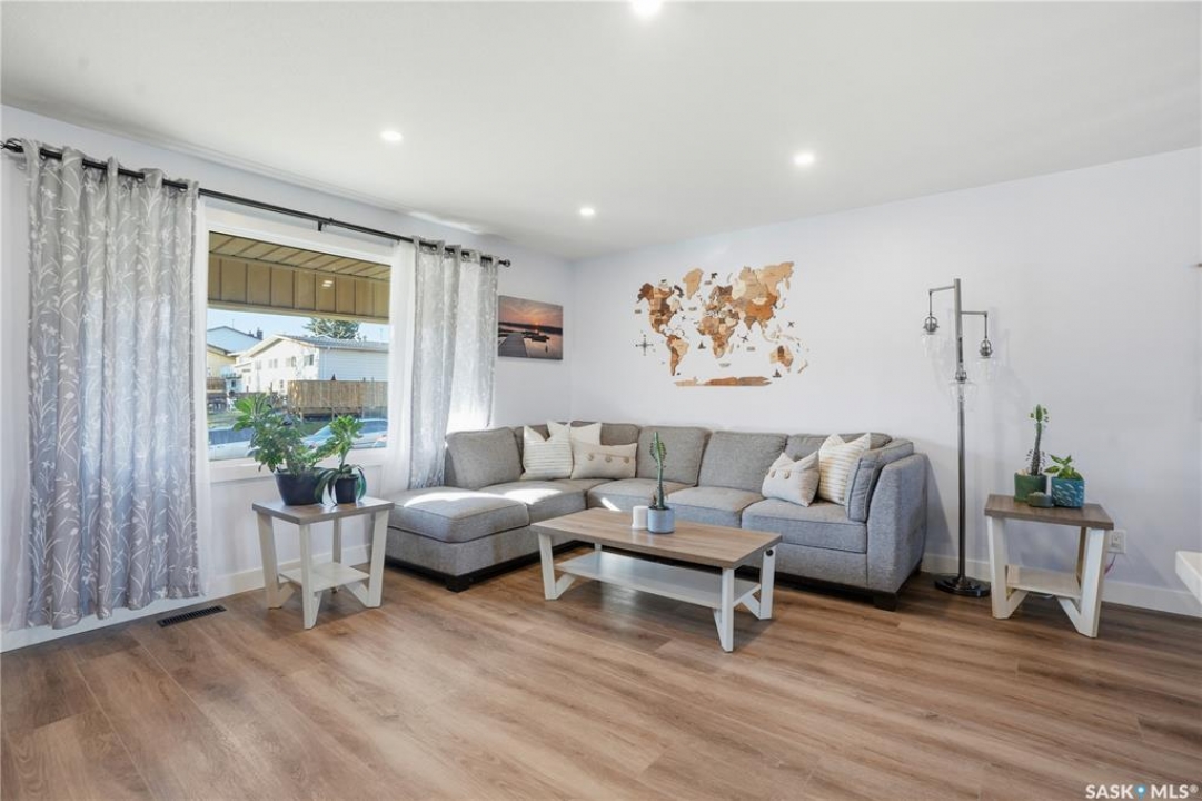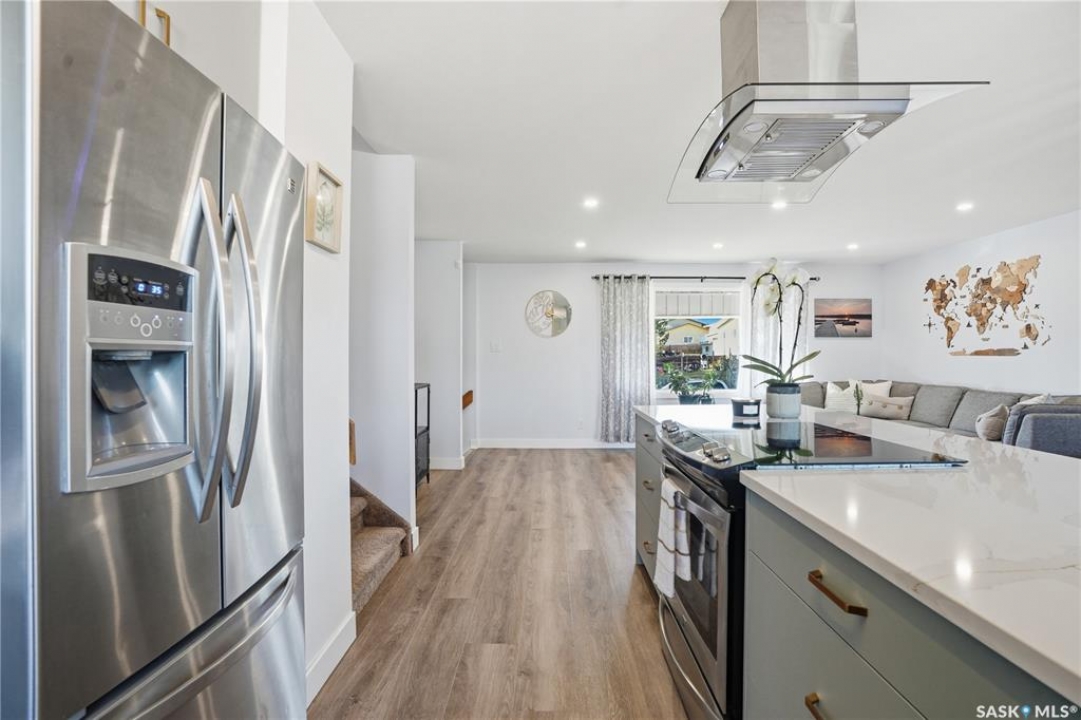 Welcome to 415 Wathaman Crescent, a stylishly updated split-level home nestled in one of Saskatoon's most desirable north-end neighborhoods. The main level showcases a stunning renovation featuring a brand-new custom kitchen with quartz countertops, a large sit-up island with cooktop and built-in oven, and sleek stainless steel appliances. The kitchen opens seamlessly to the dining and spacious living areas, highlighted by premium water-resistant laminate flooring and a new ceiling with recessed lighting. Upstairs, you'll find a comfortable primary suite complete with a walk-in closet and a private 2-piece ensuite. Two additional bedrooms and a modern 4-piece bathroom complete this level. The third level, situated at ground level, offers a welcoming foyer and a fourth bedroom. The single attached garage provides direct entry and is equipped with cabinetry, a workspace, and convenient parking. On the fourth level, you'll find another full 4-piece bathroom, a cozy family room with a Murphy bed for guests, and a utility/laundry room with additional storage space. Outside, the home features a durable rubber asphalt driveway, a private, fully fenced backyard with an attached deck, garden boxes,play structure, raspberry bushes, and apple trees—perfect for outdoor living. This move-in-ready home combines thoughtful updates, functional design, and a prime location—ideal for families or anyone seeking comfort and style in Saskatoon's north end. Very close to schools, parks, the river and all northend amenities. A true north end gem at a great price!