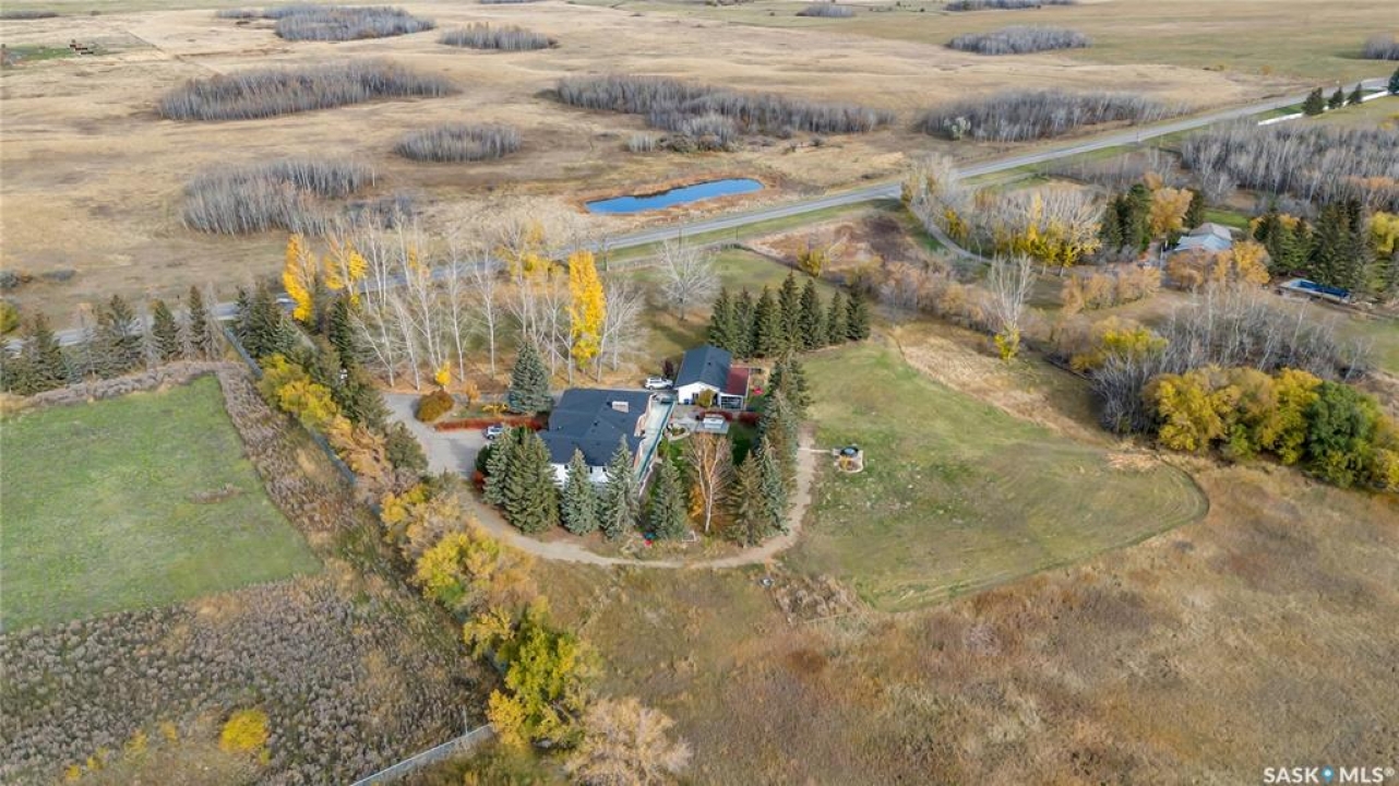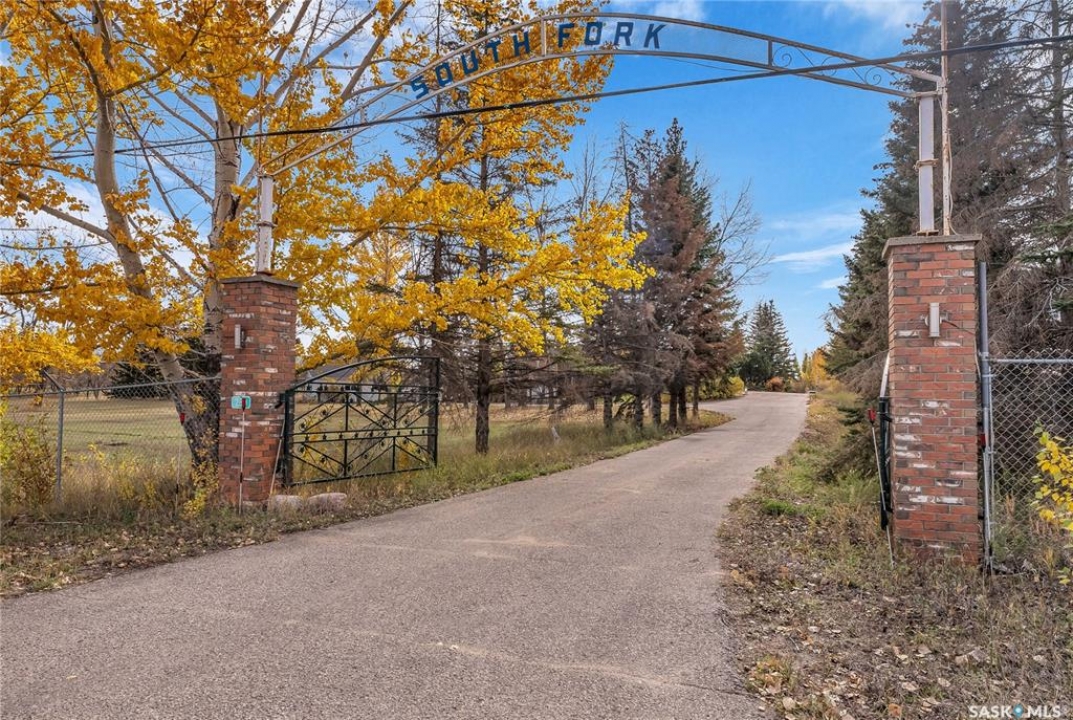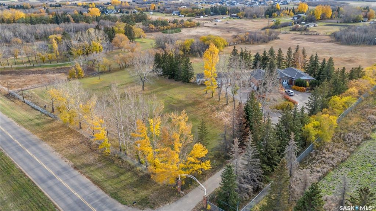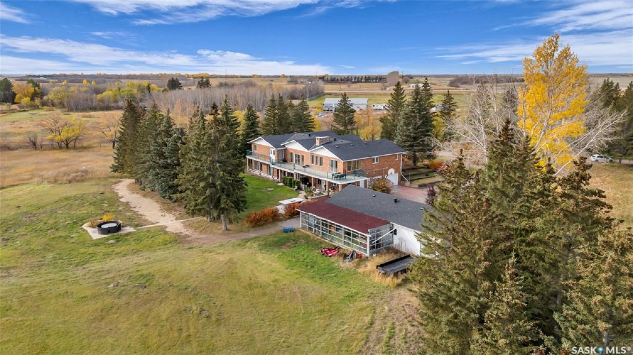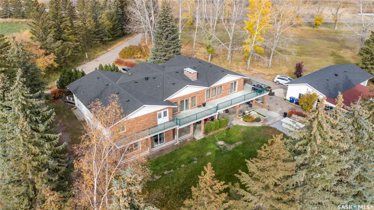 This remarkable estate combines luxurious residential living with expansive potential, offering a total of 9.06 acres. The property includes a 4.6-acre developed residential area with mature landscaping and a 3,447-square-foot walk-out bungalow (excluding the lower level) featuring five bedrooms and five bathrooms. With an open floor plan and formal spaces such as a 16' x 13.9' dining room, a 17' x 22' living room, and a gracious foyer, this home is designed for both comfort and elegance. Additional highlights include two wood-burning fireplaces, a spacious kitchen with an eating area, balconies, covered patio spaces, a double attached garage, a double detached garage, and a greenhouse. The remaining land is a natural lot, adding privacy and beautiful green space surrounding the residence. Additionally, this property offers potential for a zoning shift to commercial use, supported by nearby properties that have successfully made this transition. For those interested in expansion, an additional 5-acre parcel adjacent to the west side of the backyard is available for potential acquisition. This unique 9.06-acre estate, minutes from Saskatoon, offers an ideal blend of private, luxurious living with flexible zoning possibilities.