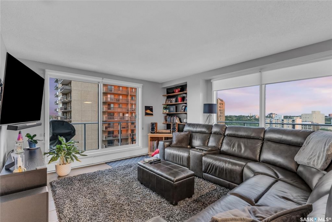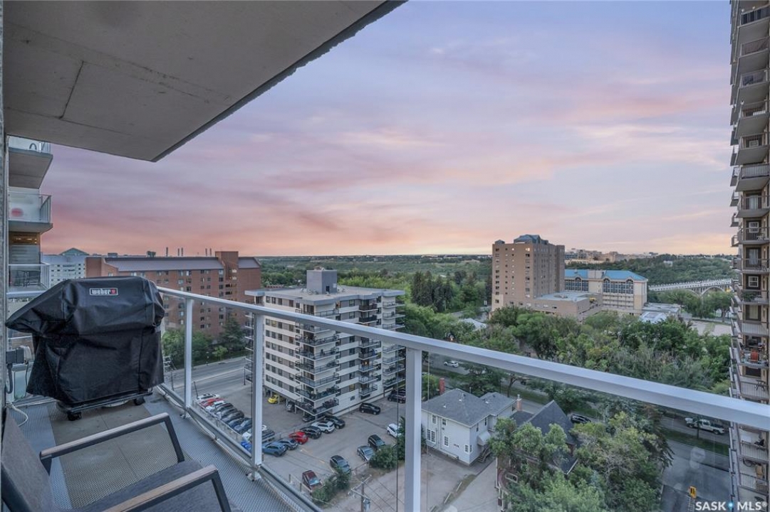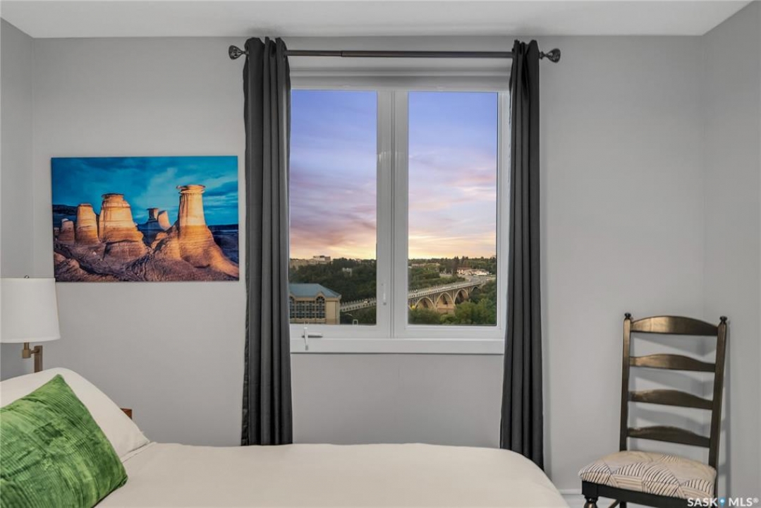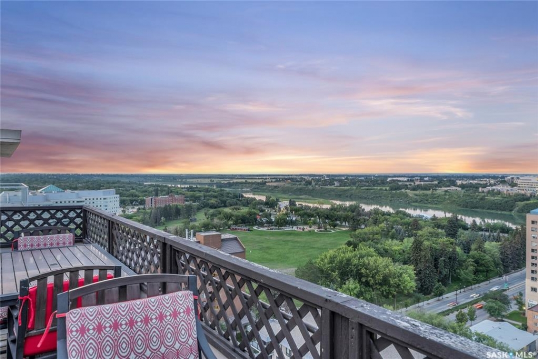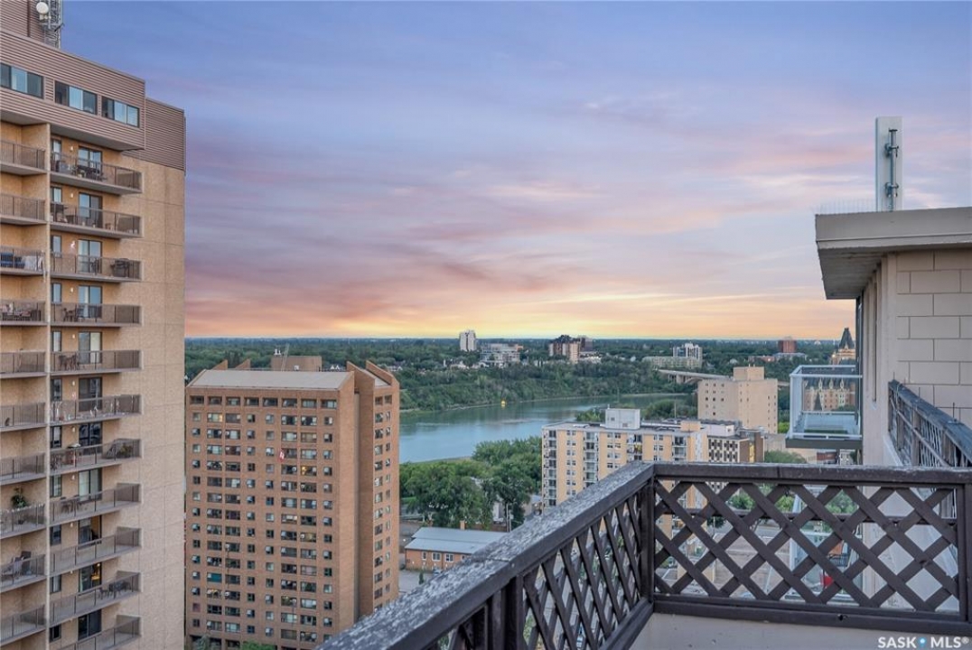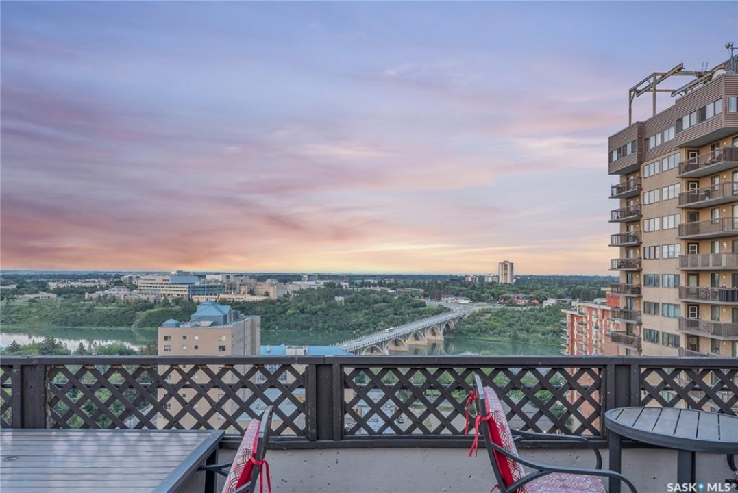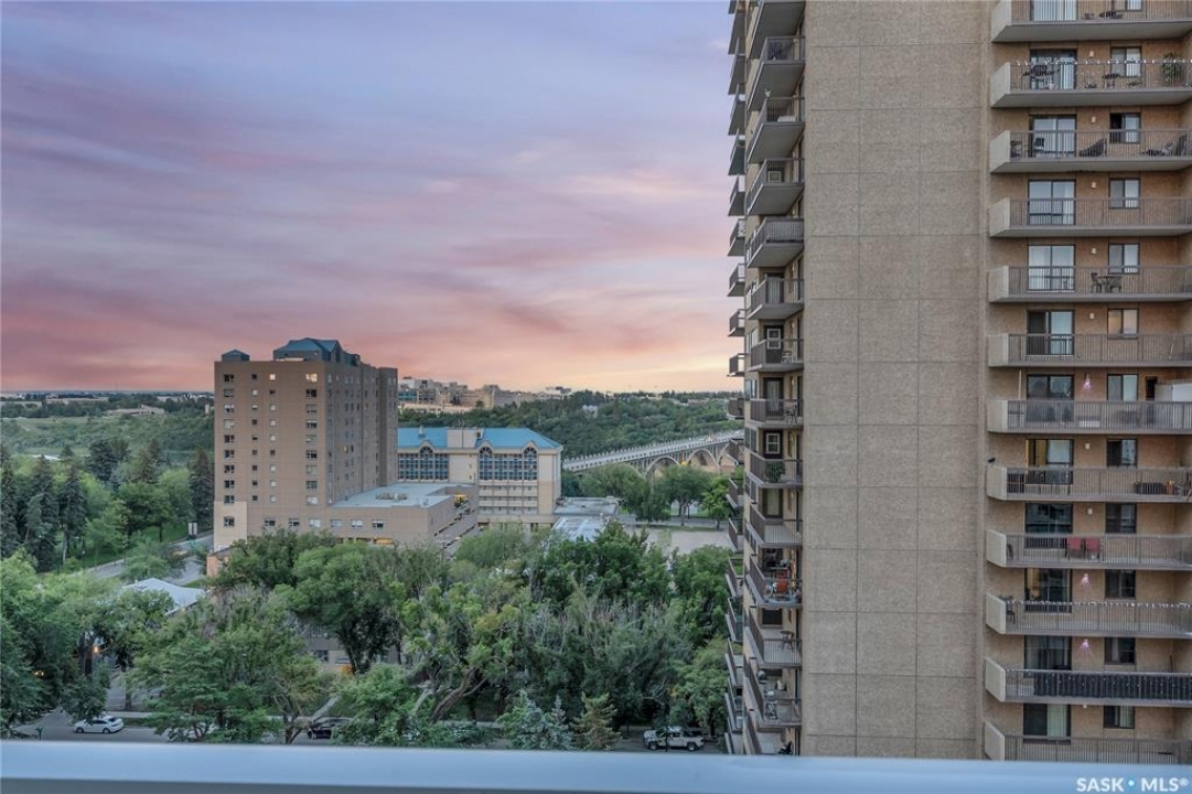 Corner Condo Unit with excellent River, Bessborough, and Saskatoon's city Skyline views from your 14th floor. Renovated Kitchen with quartz countertops & island, Stainless steel appliances included, spacious dining, open concept floor plan, 2-bedrooms, 4-piece bath & in-suite laundry. Floor-to-ceiling windows in the living room create a classy, bright corner unit with a balcony. Exclusive rooftop patio for residents, amenities and exercise room, close to downtown's best riverside paths, dining and entertainment and the UofS. Condo fees of $550/month include common area & exterior building maintenance, common insurance, heat, water, power, sewer, garbage, reserve fund, and snow removal. Don't miss your opportunity to experience some of the finest views in the city. Just listed MLS ONLY $284,000. Call your favourite realtor for a private viewing today!!! Quick Possession Available.