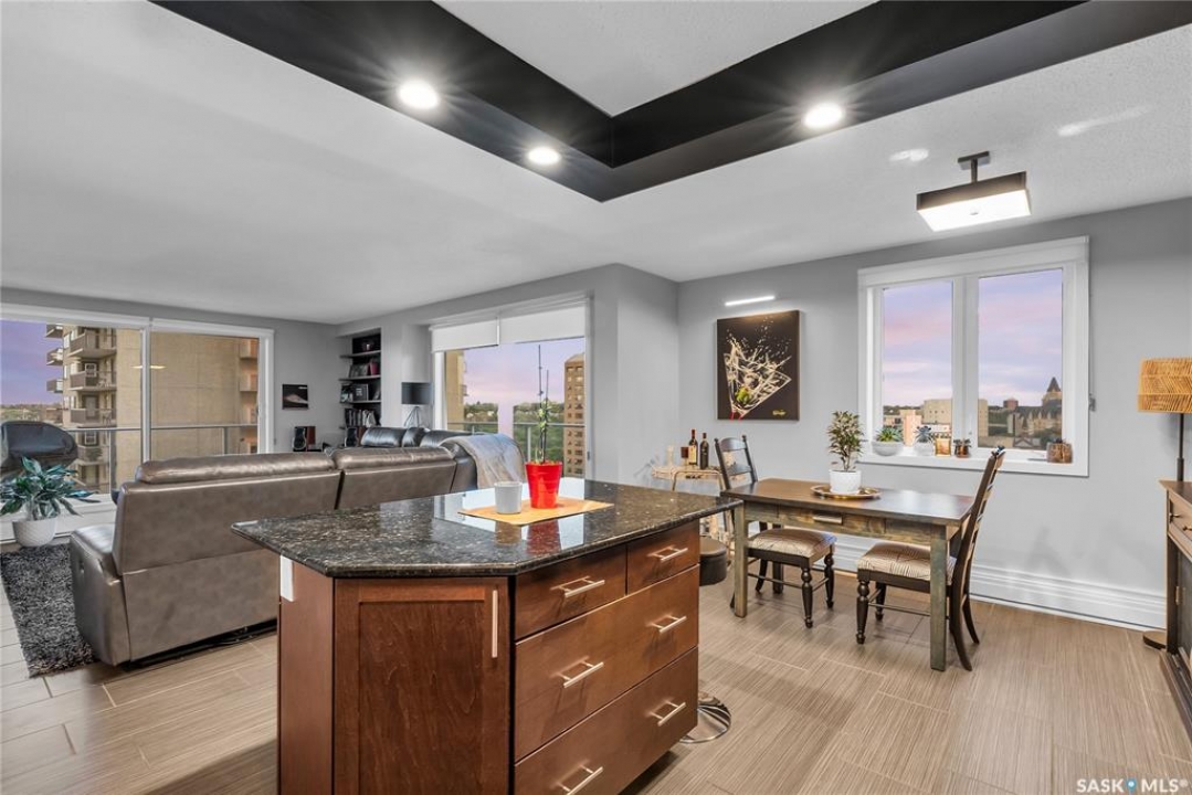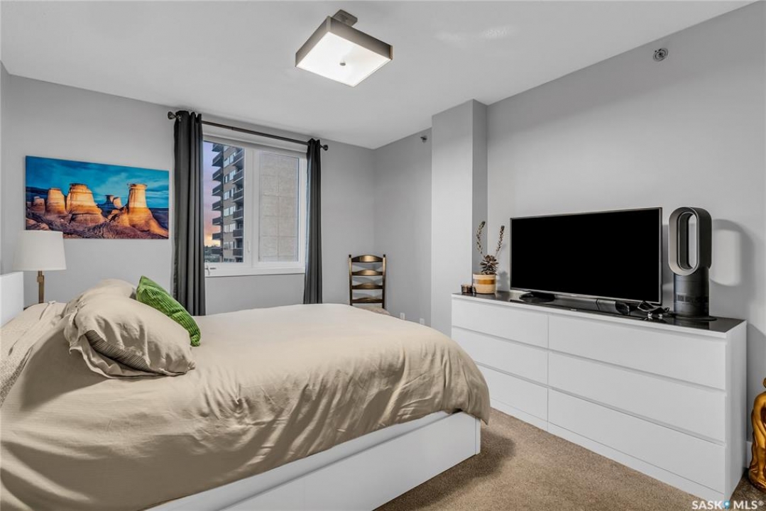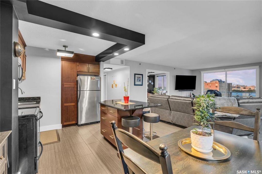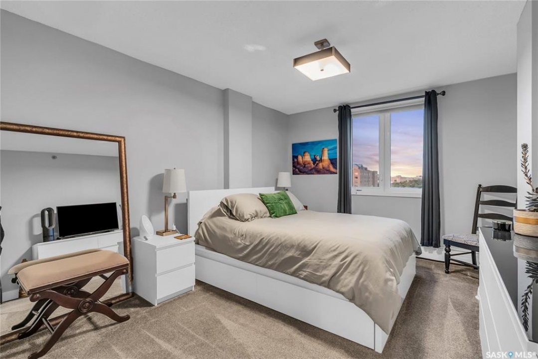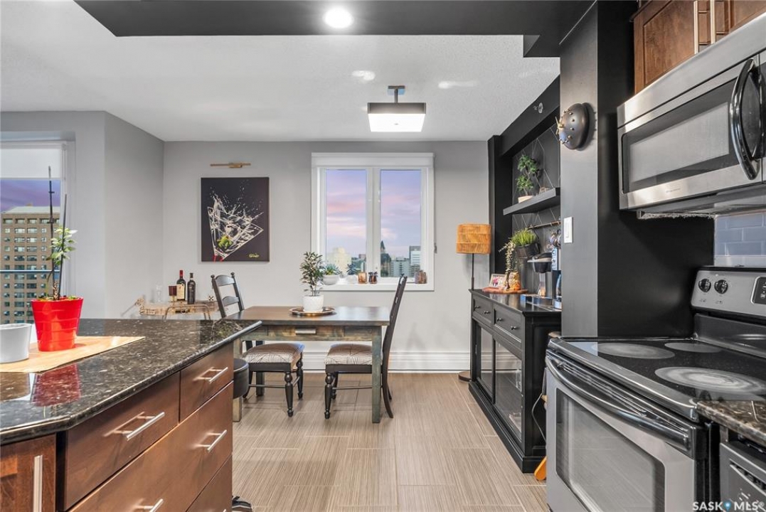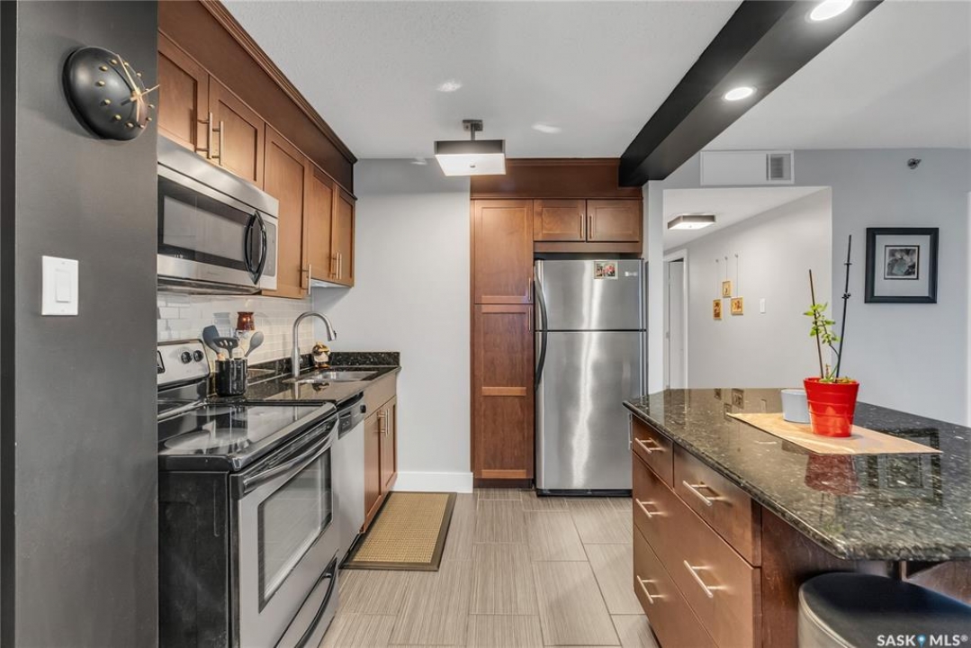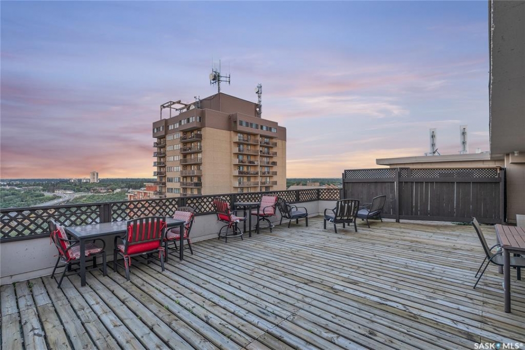 Corner Condo Unit with excellent River, Bessborough, and Saskatoon's city Skyline views from your 14th floor. Renovated Kitchen with quartz countertops & island, Stainless steel appliances included, spacious dining, open concept floor plan, 2-bedrooms, 4-piece bath & in-suite laundry. Floor-to-ceiling windows in the living room create a classy, bright corner unit with a balcony. Exclusive rooftop patio for residents, amenities and exercise room, close to downtown's best riverside paths, dining and entertainment and the UofS. Condo fees of $550/month include common area & exterior building maintenance, common insurance, heat, water, power, sewer, garbage, reserve fund, and snow removal. Don't miss your opportunity to experience some of the finest views in the city. Just listed MLS ONLY $284,000. Call your favourite realtor for a private viewing today!!! Quick Possession Available.