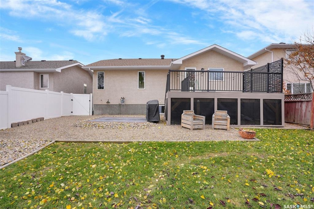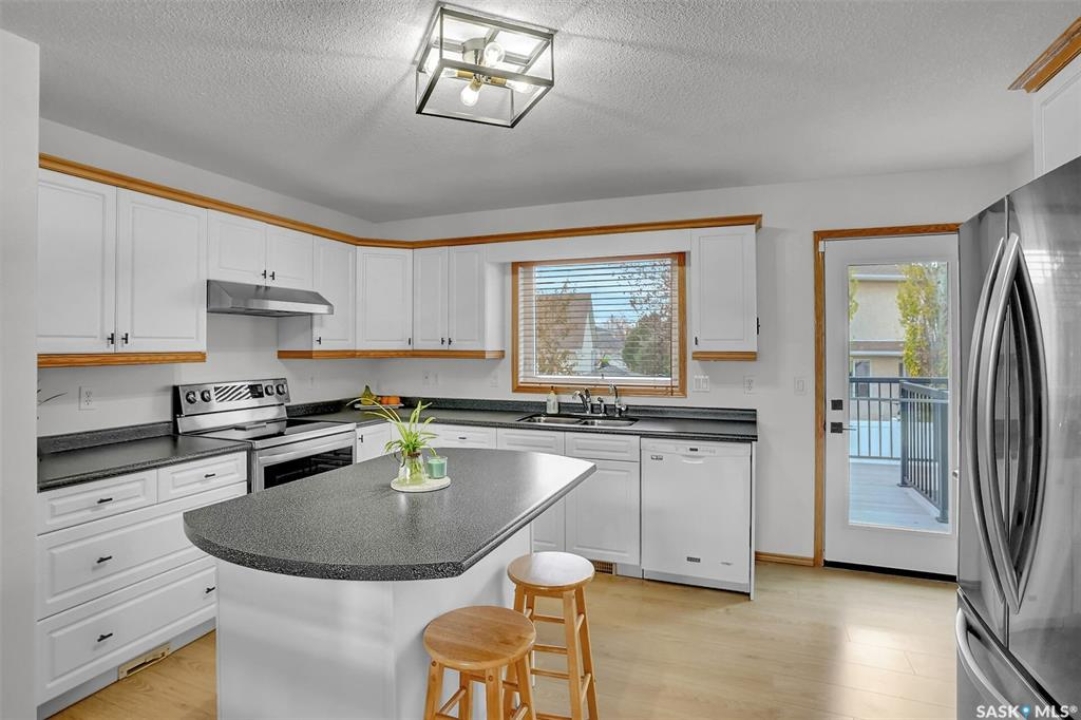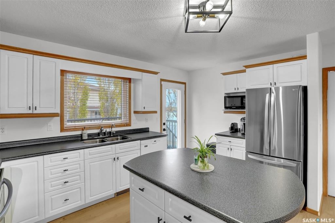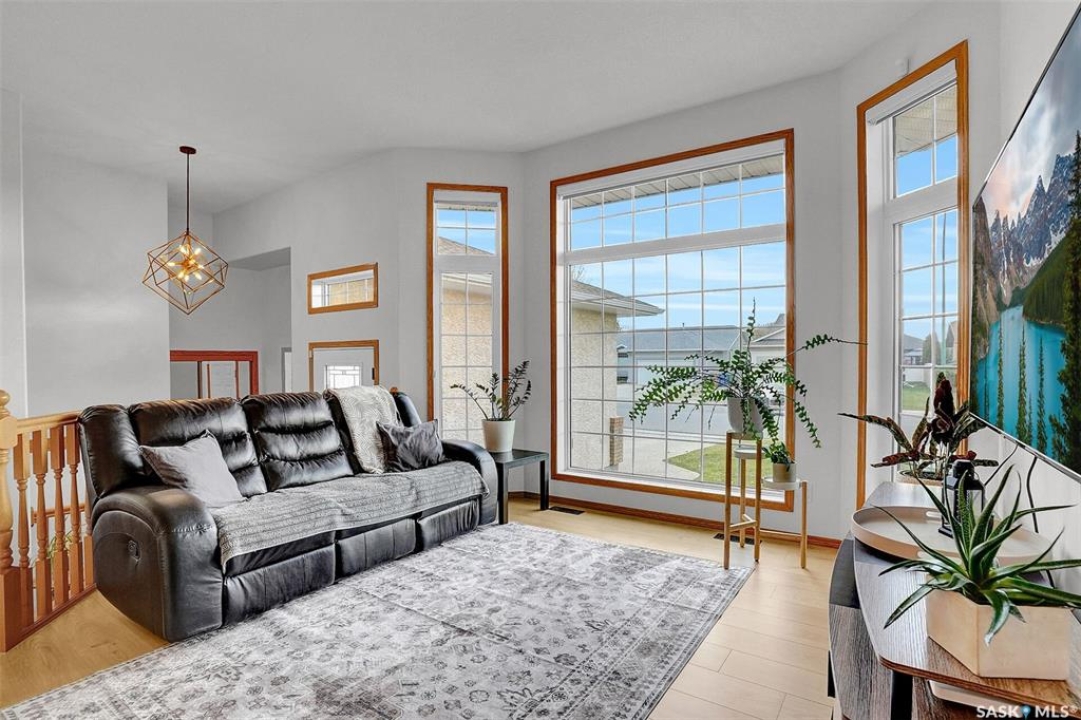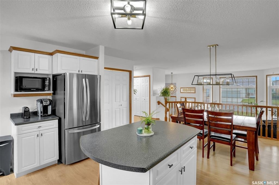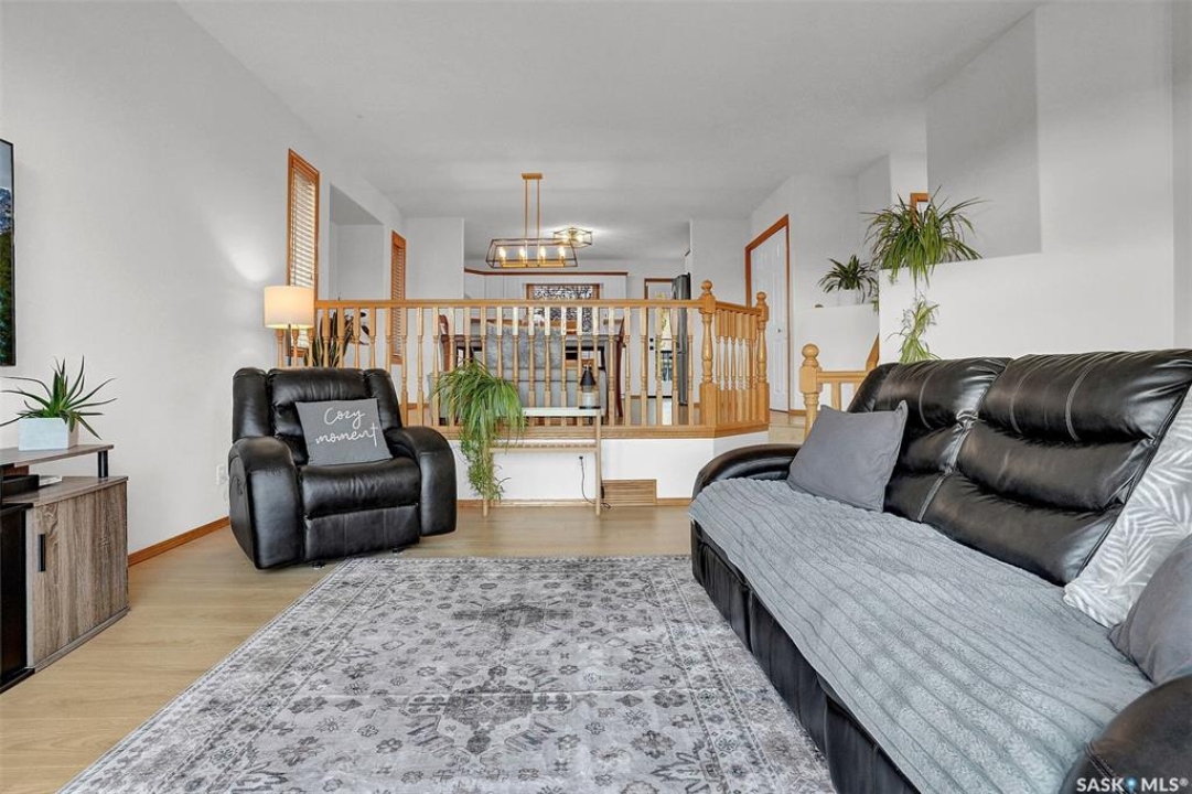 This home has great street appeal and an inviting design that sets it apart from the typical bi-level layout. The thoughtfully designed plan features a spacious front foyer allowing for a bright and open entrance. The staircase to the main level is set back into the home, creating an impressive main level that flows nicely. From the foyer, a few steps lead up to the living room with 9'8” ceilings and a floor-to-ceiling east facing picture window. The open concept continues upward to the dining area and kitchen, separated by a short flight of a few steps, an architectural feature that adds character and dimension to the space. The white kitchen is both stylish and functional with stainless steel appliances (fridge and stove December 2024), an overhead hood fan, a central vac floor sweep, large island and adjacent double door pantry. The dining area includes a built-in niche for a hutch and south-facing windows. Convenient main floor laundry with upper cabinets adds extra practicality. The primary bedroom comfortably accommodates a king sized bed and includes a walk-in closet and 3 piece ensuite. A second upstairs bedroom is generously sized and located near the main 4 piece bathroom. The basement offers excellent additional living space with a rec room, bedroom and a renovated 3 piece bathroom. There's also a large storage area and both the rec room and bedroom have Rockwool insulation in the ceiling for added soundproofing and comfort. The attached garage has radiant heat & an 11' ceiling, ideal for additional storage. The backyard is beautifully landscaped with a new composite deck, privacy wall and screened in under deck storage, a custom built patio & PVC fencing on 3 sides (one side wood). Additional highlights include: Constructed with a floor truss system, New furnace and water heater (October 2025), New washer and dryer (June 2023), New front and back doors (2023), New flooring throughout the main level (2023), New light fixtures throughout the main level.