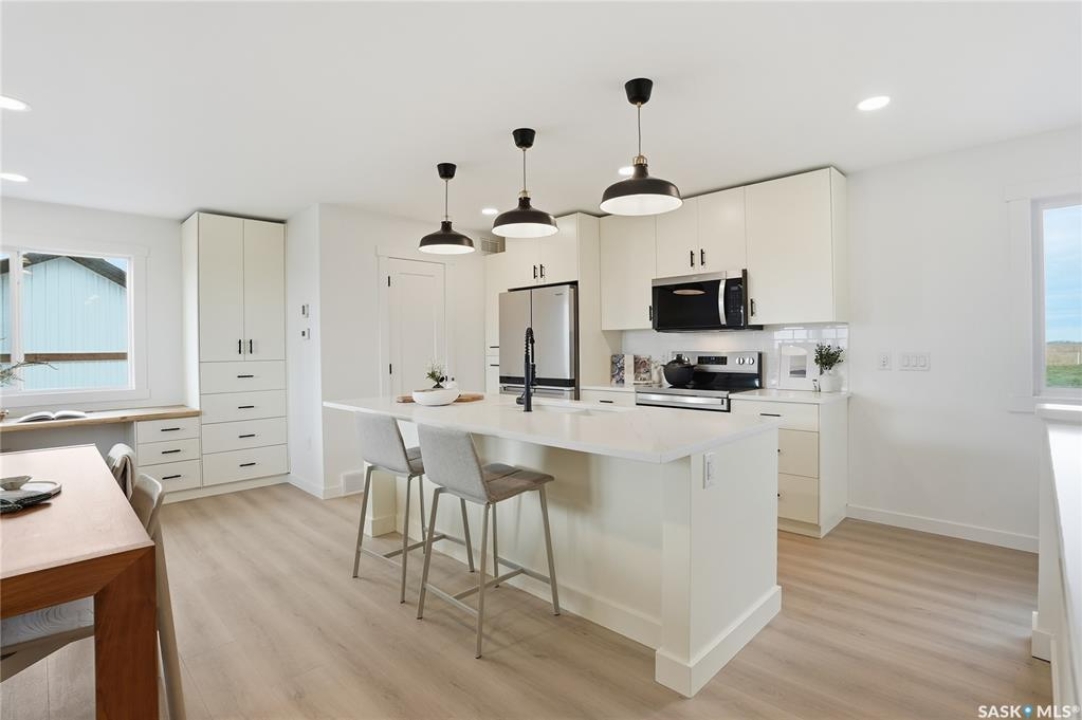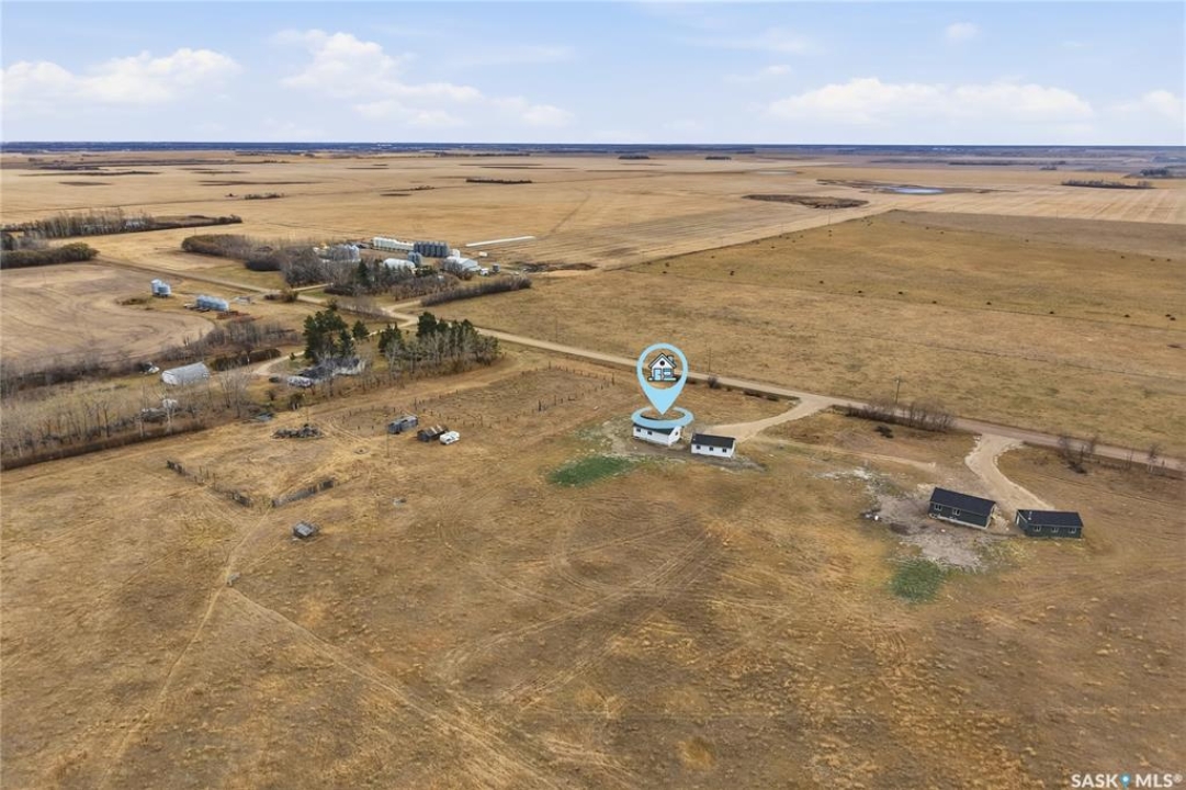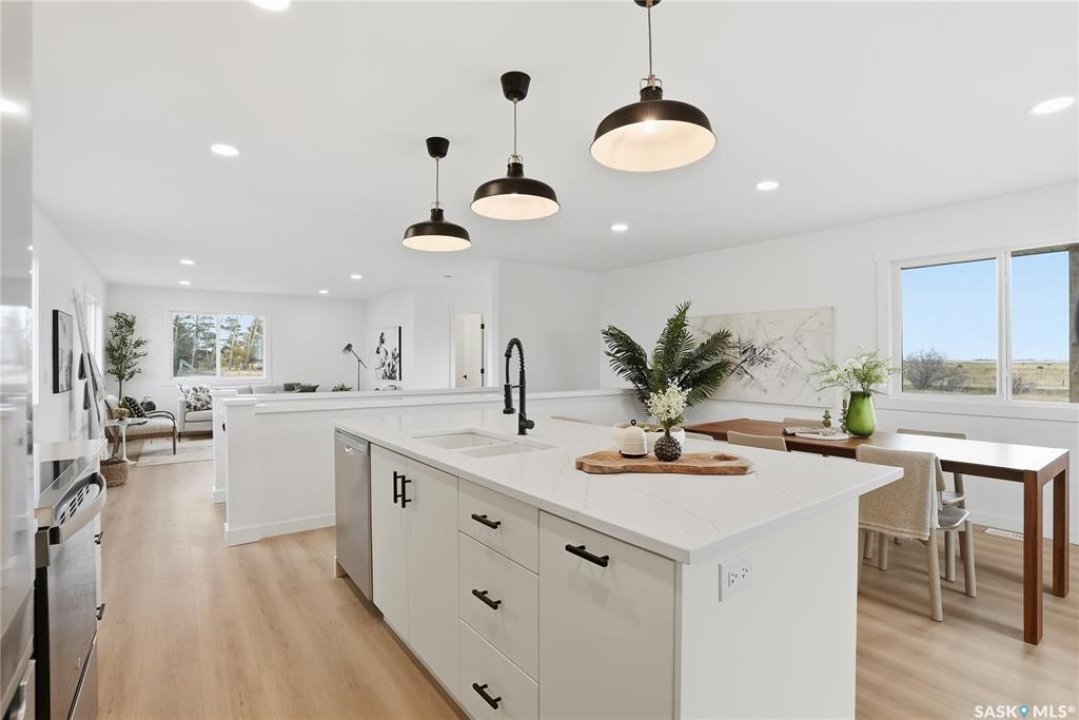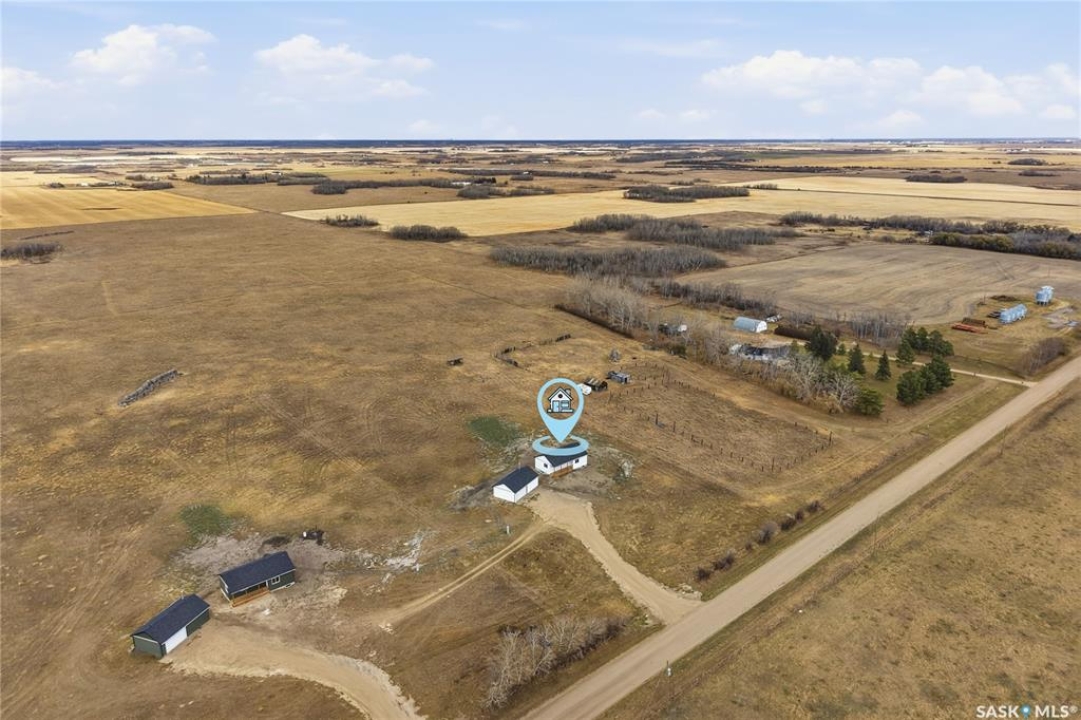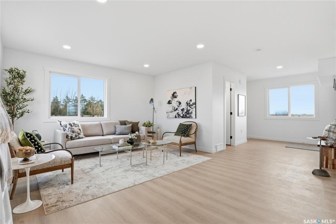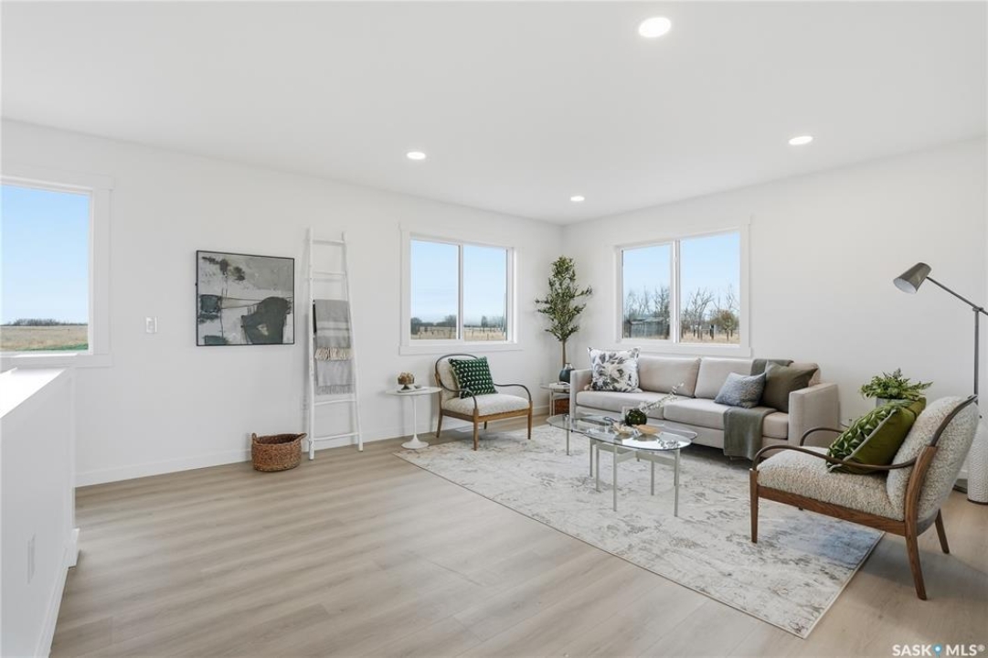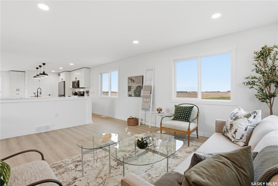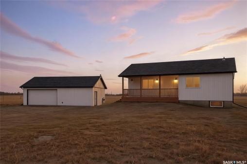 What an Opportunity! Just minutes west of Saskatoon—enjoy peaceful acreage living with city convenience! This newly constructed property sits on 3 acres and offers just over 1,700 sq. ft. of developed space (856 sq. ft. on the main level), featuring 4 beds, two baths, a fully developed basement, and an impressive heated triple detached garage (36' wide with a double overhead door). The home welcomes you home with a charming covered front porch and a functional large foyer complete with a built-in bench and a separate boot room area with floor-to-ceiling wardrobes. The open-concept main floor connects a spacious living room, dining area, and kitchen. The kitchen is a standout, showcasing an abundance of custom lacquer cabinetry, full-height pantry storage, quartz countertops, stainless steel appliances including a microwave hood fan, subway tile backsplash, and an oversized island ideal for large gatherings. The adjacent dining room easily accommodates a large table for the entire family! A convenient two-piece bath completes the main level. An open staircase leads to the bright lower level, which offers four bedrooms (one smaller—ideal as a nursery, office, or den), a spacious family-style 4-piece bathroom, and a large walk-in closet in the primary bedroom. Outside, the detached 36' heated and insulated garage is a dream setup—complete with a workshop area and a double overhead door. The yard is unlandscaped but cleared and ready for your personal design—bring your garden plans and your green thumb. Property is built by a reputable experience Saskatoon builder.