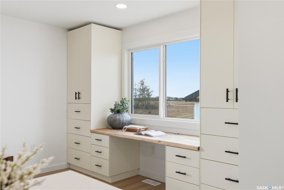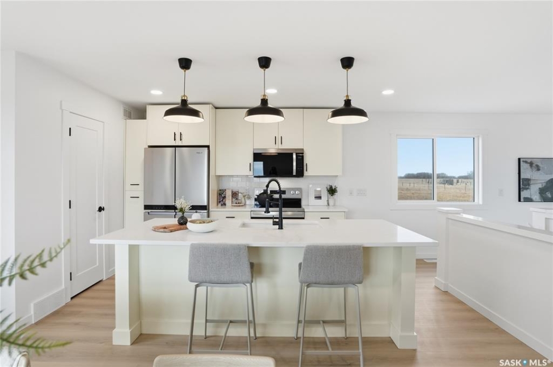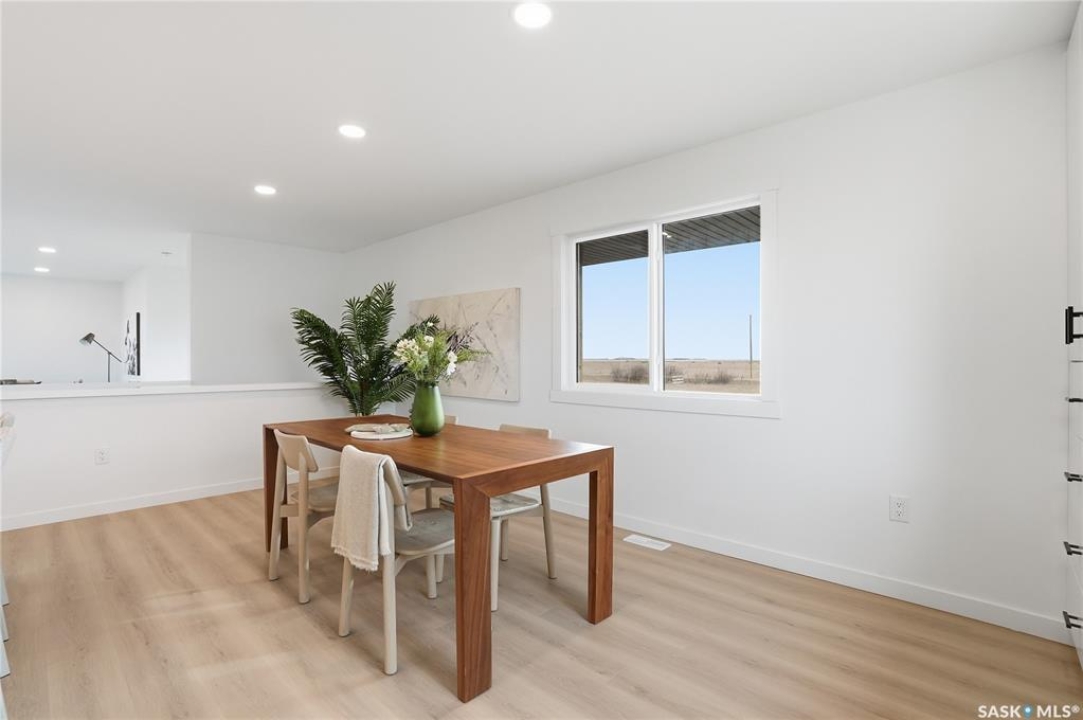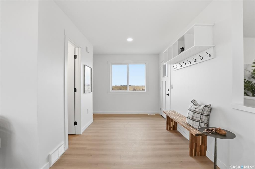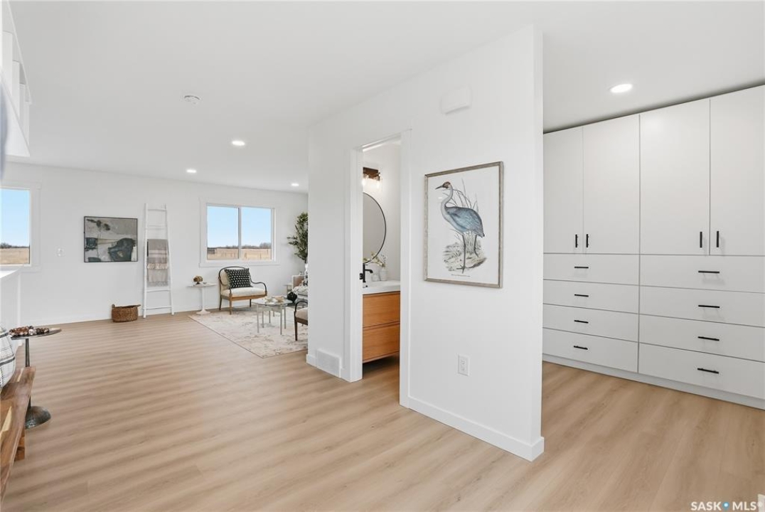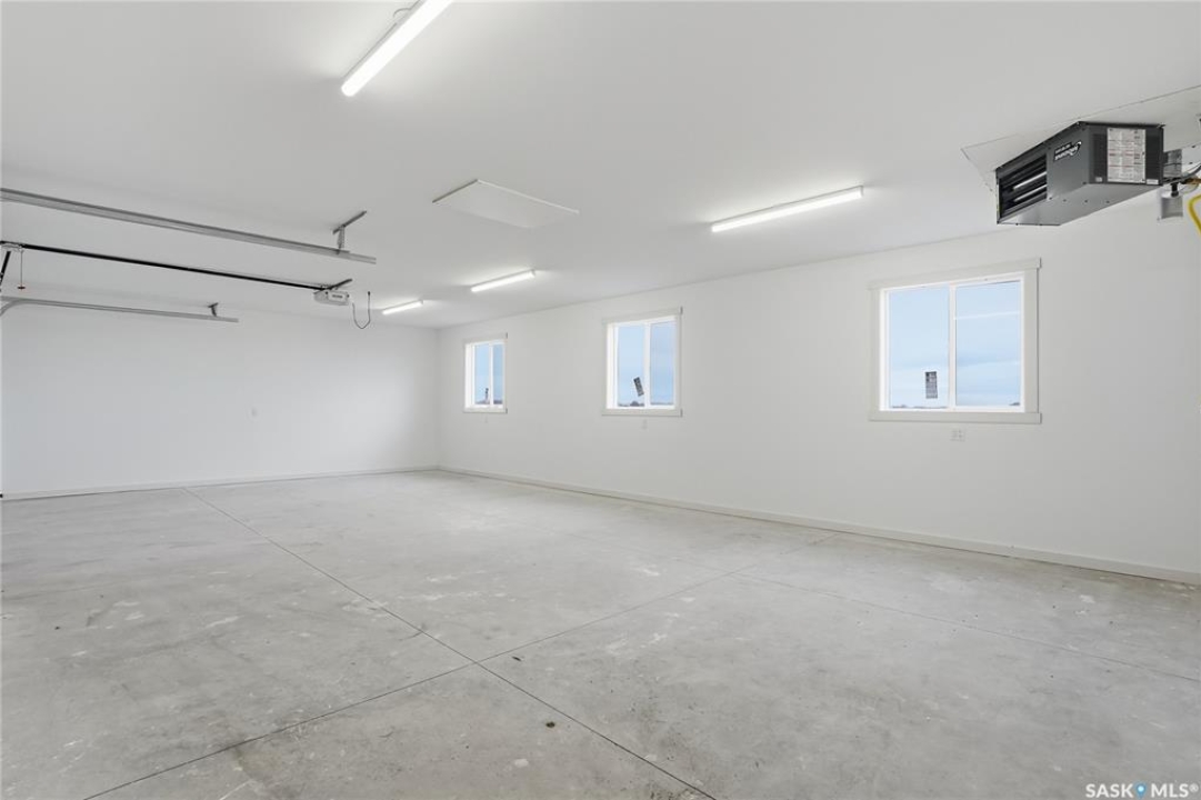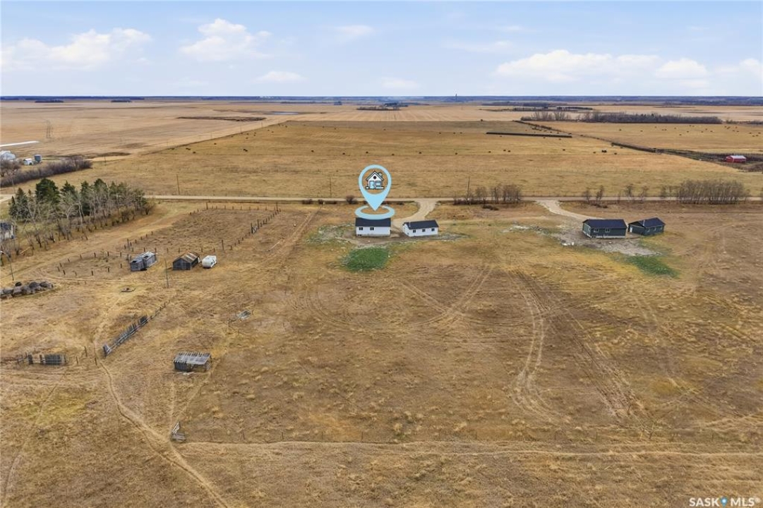 What an Opportunity! Just minutes west of Saskatoon—enjoy peaceful acreage living with city convenience! This newly constructed property sits on 3 acres and offers just over 1,700 sq. ft. of developed space (856 sq. ft. on the main level), featuring 4 beds, two baths, a fully developed basement, and an impressive heated triple detached garage (36' wide with a double overhead door). The home welcomes you home with a charming covered front porch and a functional large foyer complete with a built-in bench and a separate boot room area with floor-to-ceiling wardrobes. The open-concept main floor connects a spacious living room, dining area, and kitchen. The kitchen is a standout, showcasing an abundance of custom lacquer cabinetry, full-height pantry storage, quartz countertops, stainless steel appliances including a microwave hood fan, subway tile backsplash, and an oversized island ideal for large gatherings. The adjacent dining room easily accommodates a large table for the entire family! A convenient two-piece bath completes the main level. An open staircase leads to the bright lower level, which offers four bedrooms (one smaller—ideal as a nursery, office, or den), a spacious family-style 4-piece bathroom, and a large walk-in closet in the primary bedroom. Outside, the detached 36' heated and insulated garage is a dream setup—complete with a workshop area and a double overhead door. The yard is unlandscaped but cleared and ready for your personal design—bring your garden plans and your green thumb. Property is built by a reputable experience Saskatoon builder.