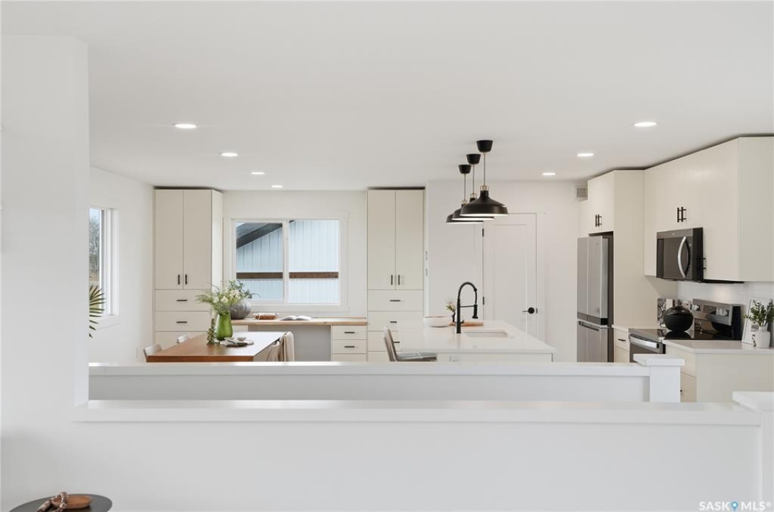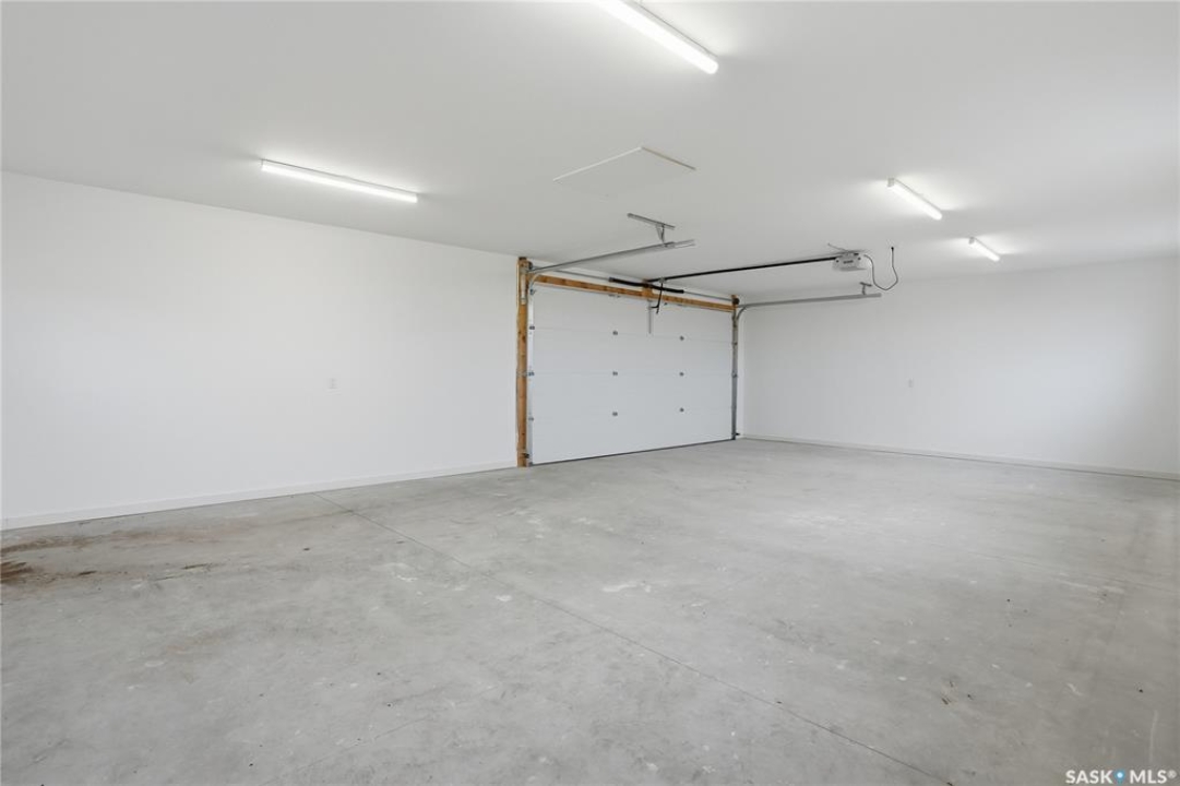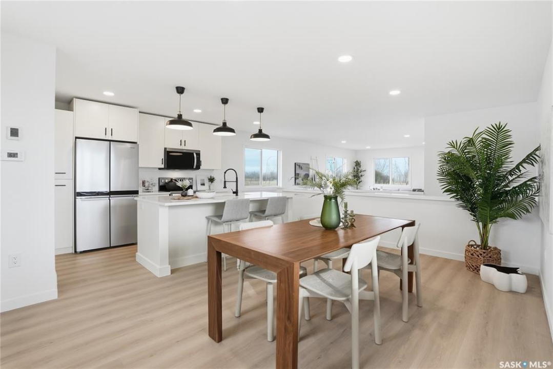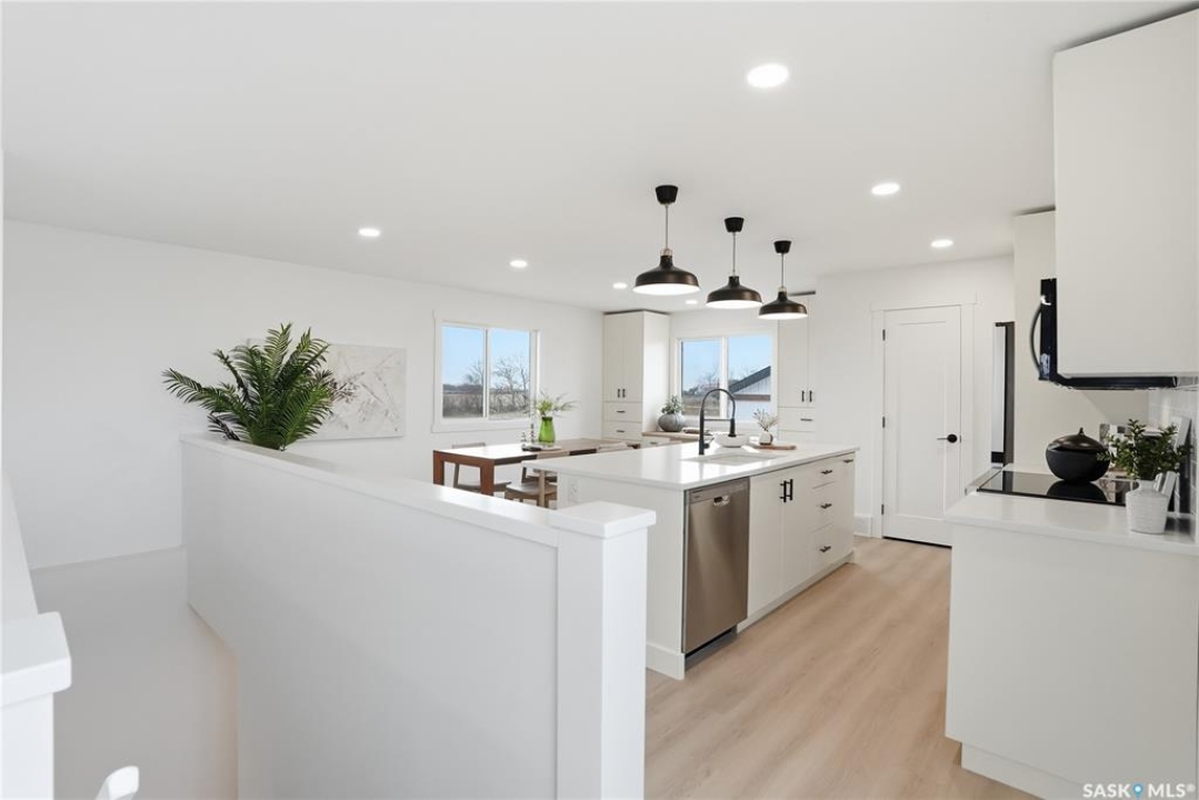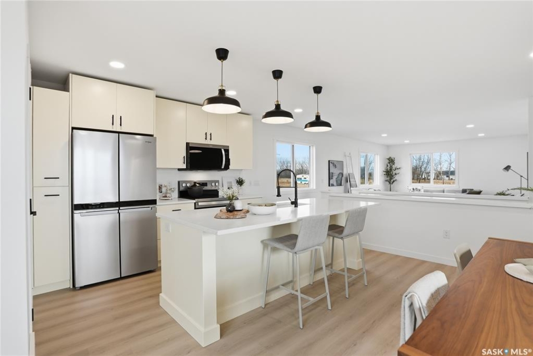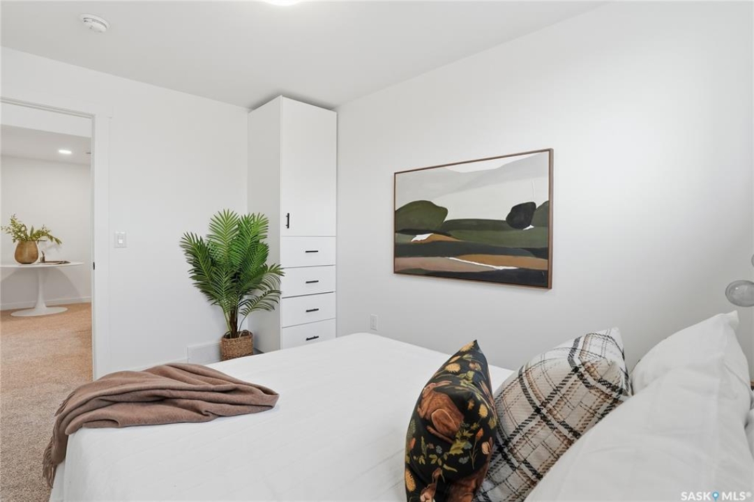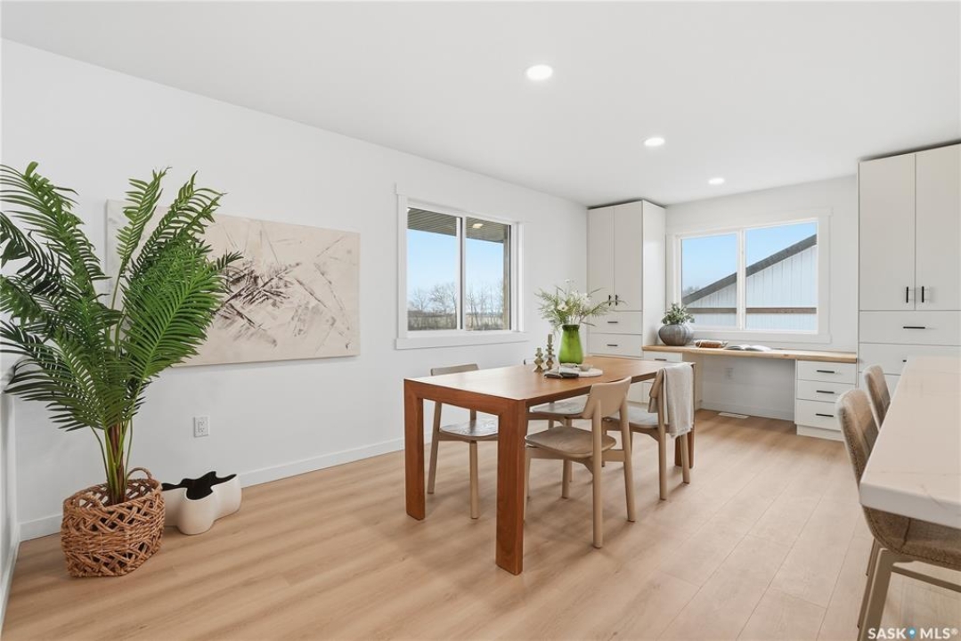 What an Opportunity! Just minutes west of Saskatoon—enjoy peaceful acreage living with city convenience! This newly constructed property sits on 3 acres and offers just over 1,700 sq. ft. of developed space (856 sq. ft. on the main level), featuring 4 beds, two baths, a fully developed basement, and an impressive heated triple detached garage (36' wide with a double overhead door). The home welcomes you home with a charming covered front porch and a functional large foyer complete with a built-in bench and a separate boot room area with floor-to-ceiling wardrobes. The open-concept main floor connects a spacious living room, dining area, and kitchen. The kitchen is a standout, showcasing an abundance of custom lacquer cabinetry, full-height pantry storage, quartz countertops, stainless steel appliances including a microwave hood fan, subway tile backsplash, and an oversized island ideal for large gatherings. The adjacent dining room easily accommodates a large table for the entire family! A convenient two-piece bath completes the main level. An open staircase leads to the bright lower level, which offers four bedrooms (one smaller—ideal as a nursery, office, or den), a spacious family-style 4-piece bathroom, and a large walk-in closet in the primary bedroom. Outside, the detached 36' heated and insulated garage is a dream setup—complete with a workshop area and a double overhead door. The yard is unlandscaped but cleared and ready for your personal design—bring your garden plans and your green thumb. Property is built by a reputable experience Saskatoon builder.