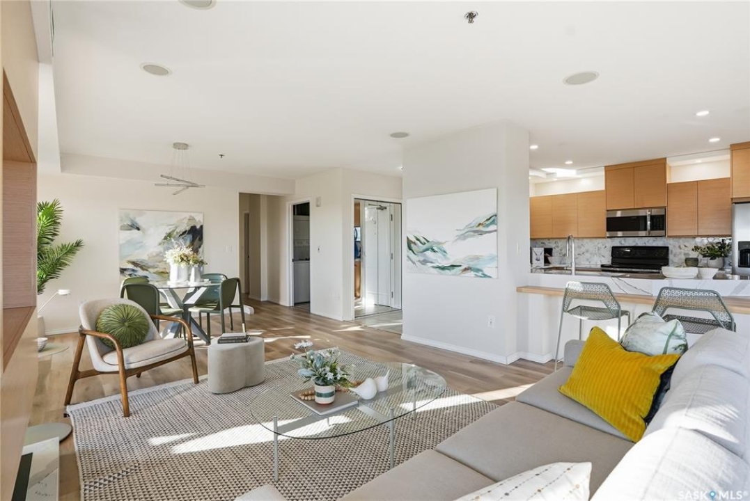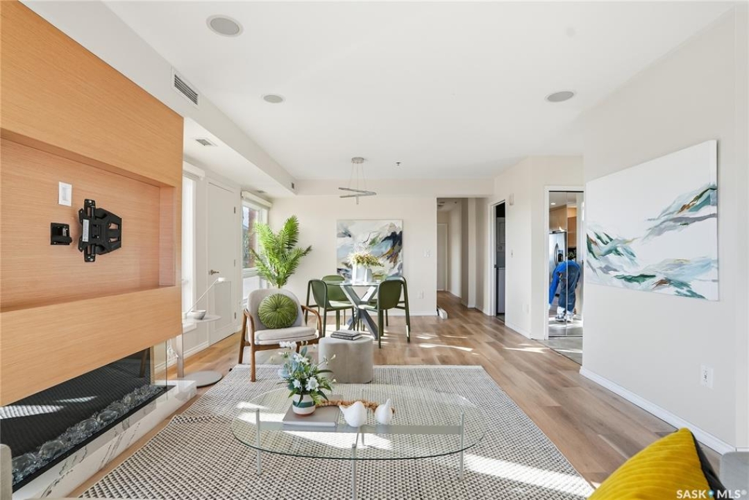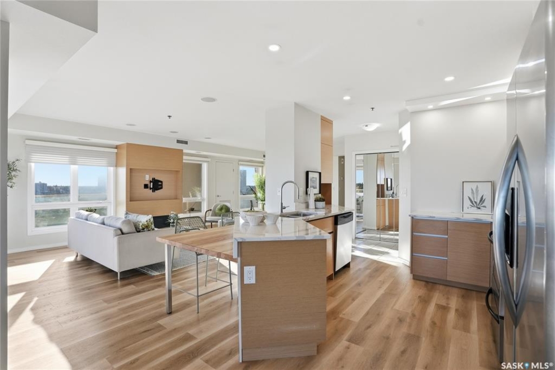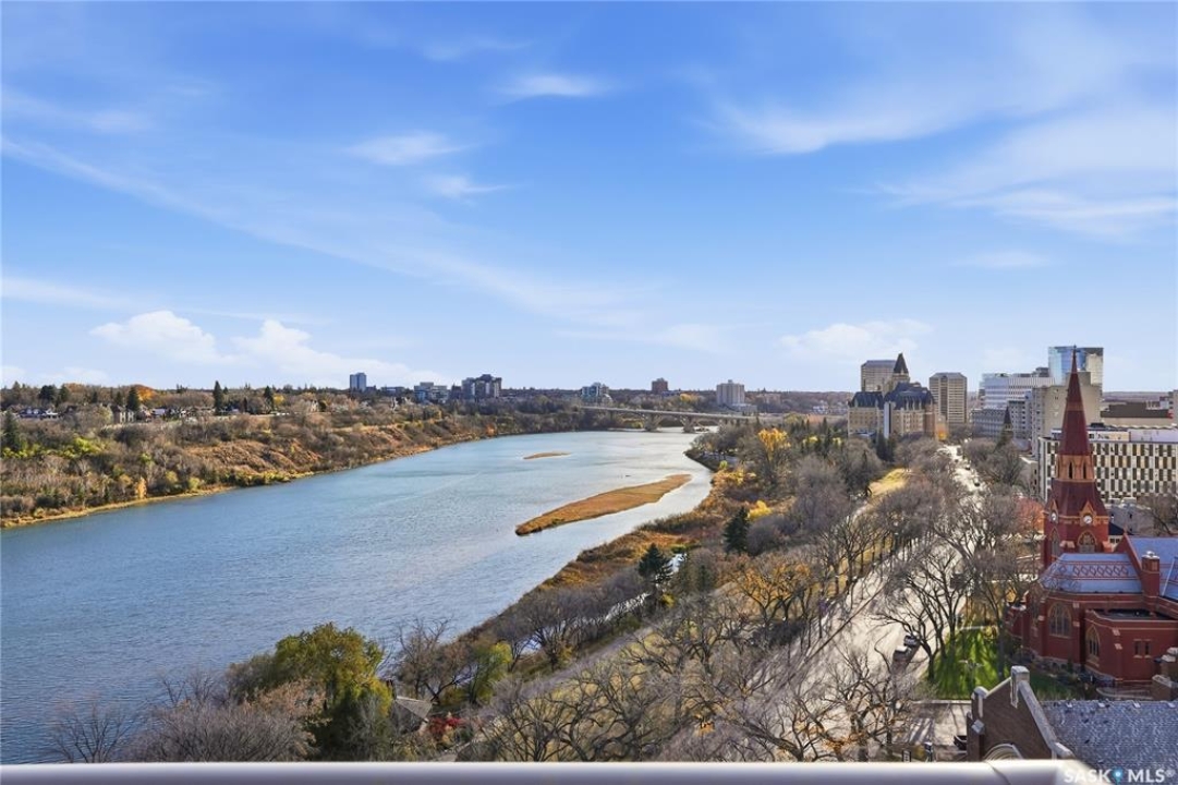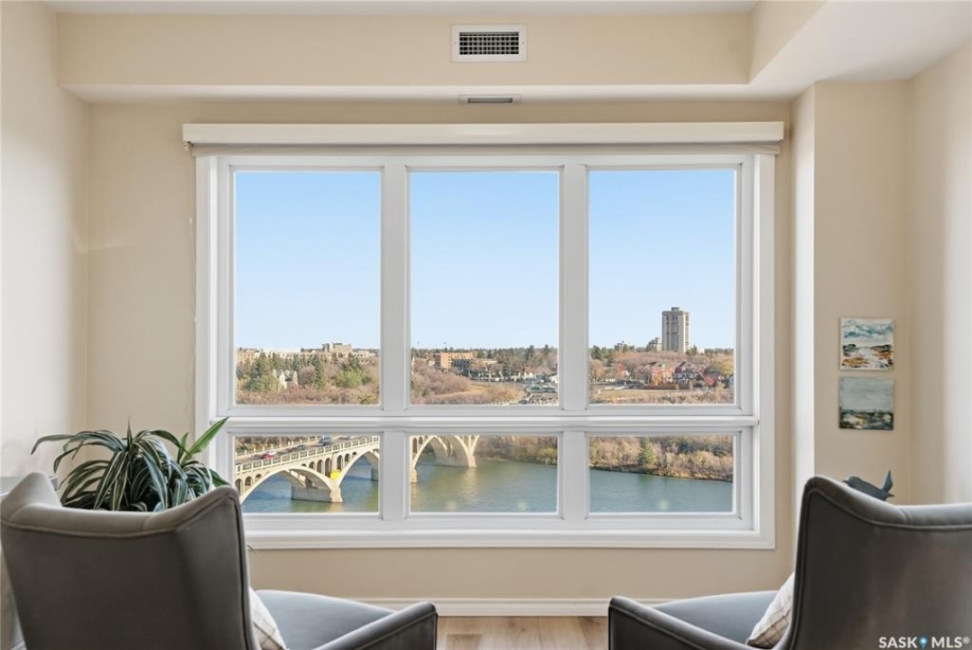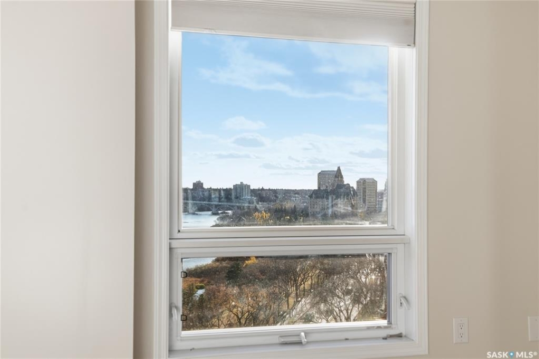 Wow! Truly a rare find! This beautiful luxury condo has it all: a million dollar view, premium upgrades, and impressive size. Since its purchase in 2018 over $140,000 in renovations have been invested. Updates include a custom kitchen, a redesigned living room with fireplace feature wall, and modern bathroom cabinetry, lighting, blinds, built in shelving in the closets, luxury vinyl floors. Enjoy unmatched south and east-facing panoramic views from the wraparound deck, complete with upgraded tile flooring and a natural gas BBQ hookup. The gorgeous living room showcases sweeping views of the South Saskatchewan River from every angle, creating a bright and peaceful atmosphere. The modern kitchen features contemporary cabinetry, stylish countertops, a functional island, and stainless steel appliances,perfectly designed for both cooking and entertaining. Every room offers breathtaking views: use the sunny corner as your home office or a relaxing sitting area.The master bedroom includes a spacious walk-in closet and a stunning three-piece ensuite with a steam shower and heated tile floors for ultimate comfort. The second bedroom features a smart built-in desk within the closet, ideal for a work-from-home setup.Additional highlights include a built-in sound system throughout the unit and balcony, one underground parking stall, and a storage unit. The fireplace, originally gas, is now electric but can easily be reconnected to gas. This well-managed, quiet concrete building is pet-friendly (with Board approval) and offers top-tier amenities: a gym, amenities/meeting room, guest suites, on-site maintenance, and garbage chutes on every floor. Located in the heart of Downtown Saskatoon, you'll enjoy front-row views of the city skyline, with walking access to the University of Saskatchewan, restaurants, hospitals, and river trails.Large windows throughout create a scenic, light-filled living experience the perfect blend of luxury, comfort, and location.