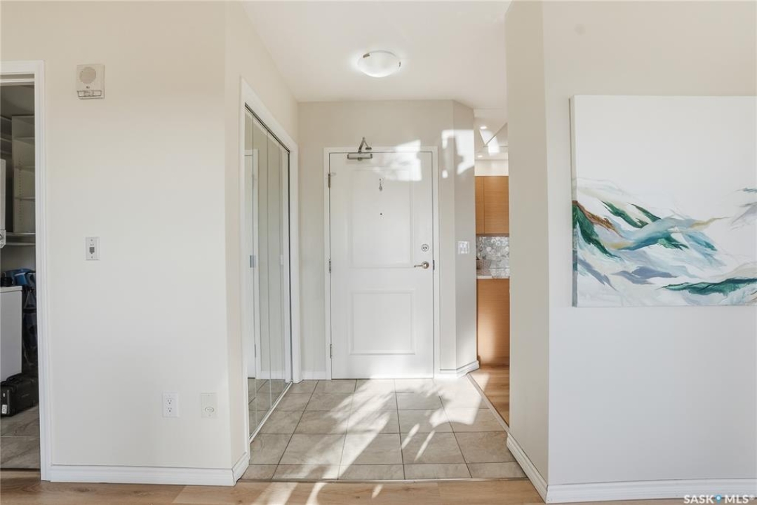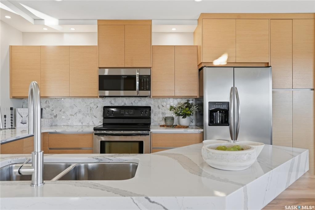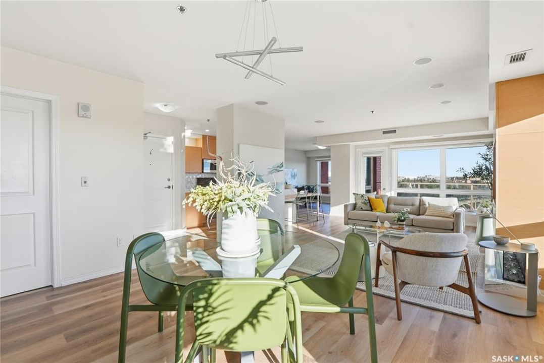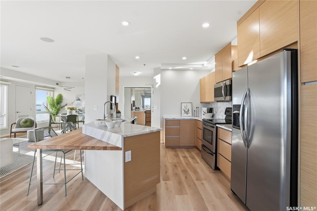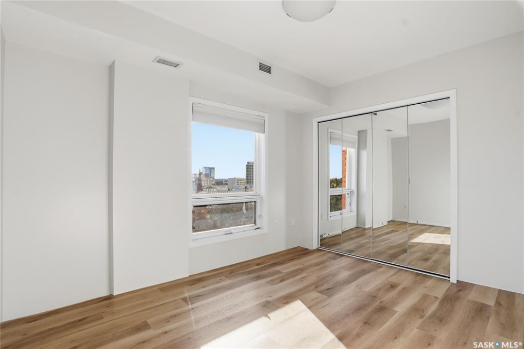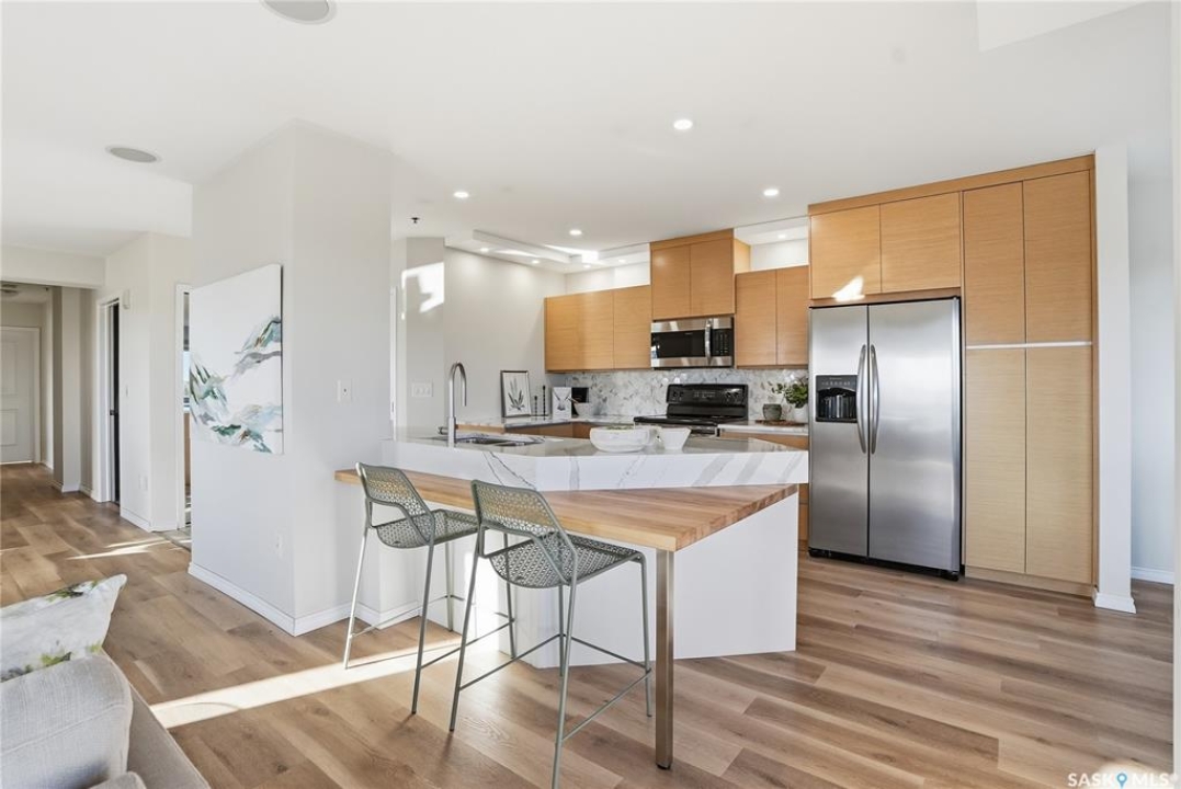 Wow! Truly a rare find! This beautiful luxury condo has it all: a million dollar view, premium upgrades, and impressive size. Since its purchase in 2018 over $140,000 in renovations have been invested. Updates include a custom kitchen, a redesigned living room with fireplace feature wall, and modern bathroom cabinetry, lighting, blinds, built in shelving in the closets, luxury vinyl floors. Enjoy unmatched south and east-facing panoramic views from the wraparound deck, complete with upgraded tile flooring and a natural gas BBQ hookup. The gorgeous living room showcases sweeping views of the South Saskatchewan River from every angle, creating a bright and peaceful atmosphere. The modern kitchen features contemporary cabinetry, stylish countertops, a functional island, and stainless steel appliances,perfectly designed for both cooking and entertaining. Every room offers breathtaking views: use the sunny corner as your home office or a relaxing sitting area.The master bedroom includes a spacious walk-in closet and a stunning three-piece ensuite with a steam shower and heated tile floors for ultimate comfort. The second bedroom features a smart built-in desk within the closet, ideal for a work-from-home setup.Additional highlights include a built-in sound system throughout the unit and balcony, one underground parking stall, and a storage unit. The fireplace, originally gas, is now electric but can easily be reconnected to gas. This well-managed, quiet concrete building is pet-friendly (with Board approval) and offers top-tier amenities: a gym, amenities/meeting room, guest suites, on-site maintenance, and garbage chutes on every floor. Located in the heart of Downtown Saskatoon, you'll enjoy front-row views of the city skyline, with walking access to the University of Saskatchewan, restaurants, hospitals, and river trails.Large windows throughout create a scenic, light-filled living experience the perfect blend of luxury, comfort, and location.