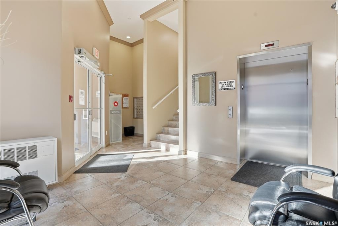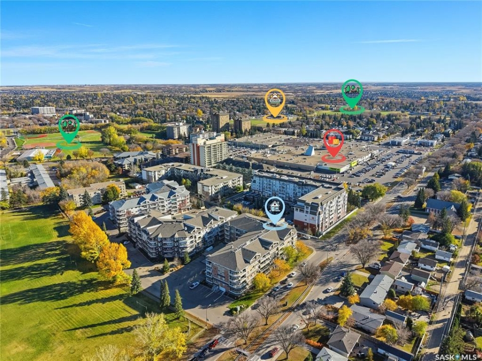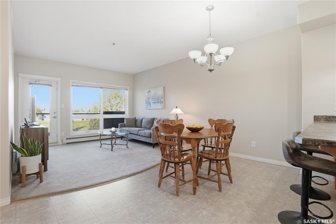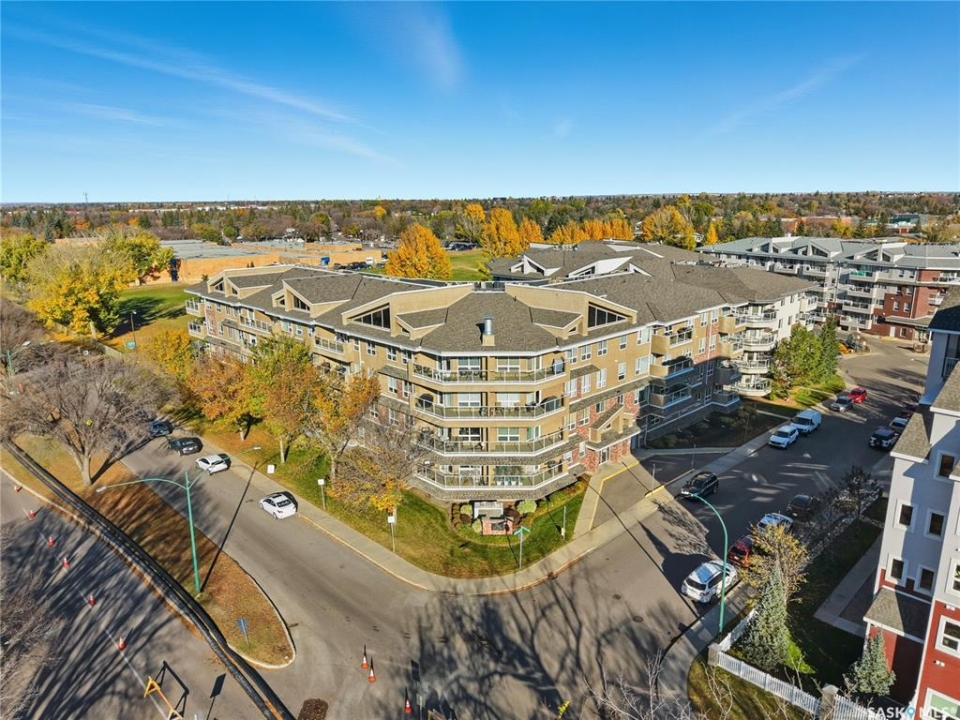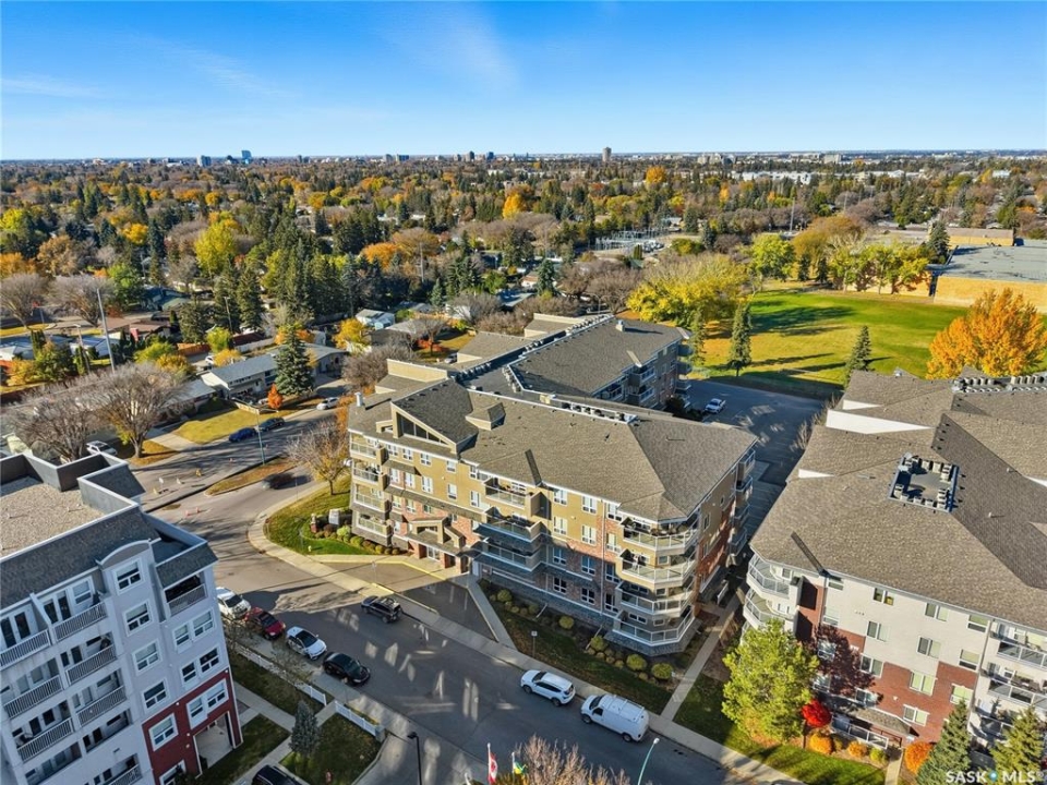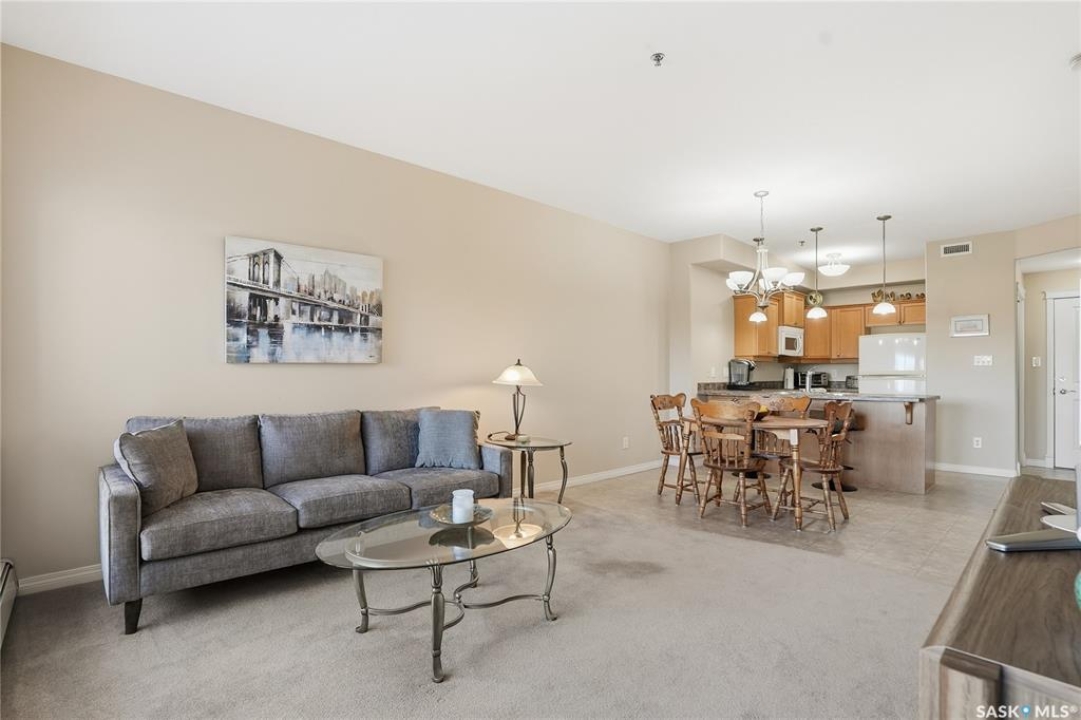 Excellent layout, location & pride of ownership with this 1 bed + den condo at Dover Heights with central A/C, in-suite laundry & storage, underground parking & close proximity to Market Mall & many amenities. This well-designed suite offers a bright & open feel with 9' ceilings, open-concept living room, dining space & kitchen with peninsula breakfast bar, natural wood-tone cabinetry with under-cabinet lighting. Efficient use of space with lots of room for entertaining guests & family. Generously-sized balcony facing trees & open park space, featuring a natural gas hookup for your BBQ. Spacious main bedroom along with a den that's amply sized for use as a home office or guest room. The underground parking stall features a generously-sized self-contained storage room for your convenience. Features of the condo commons include an amenities room, elevator service to all levels of the building, exercise area, visitor parking, & wheelchair-accessible entrances. Well-managed condo association & reserve fund with pride in the building amongst its residents. Heat, water, snow removal & exterior building maintenance included in the condo fees of approximately $394/month. An excellent & affordable condo perfect for those looking to downsize!