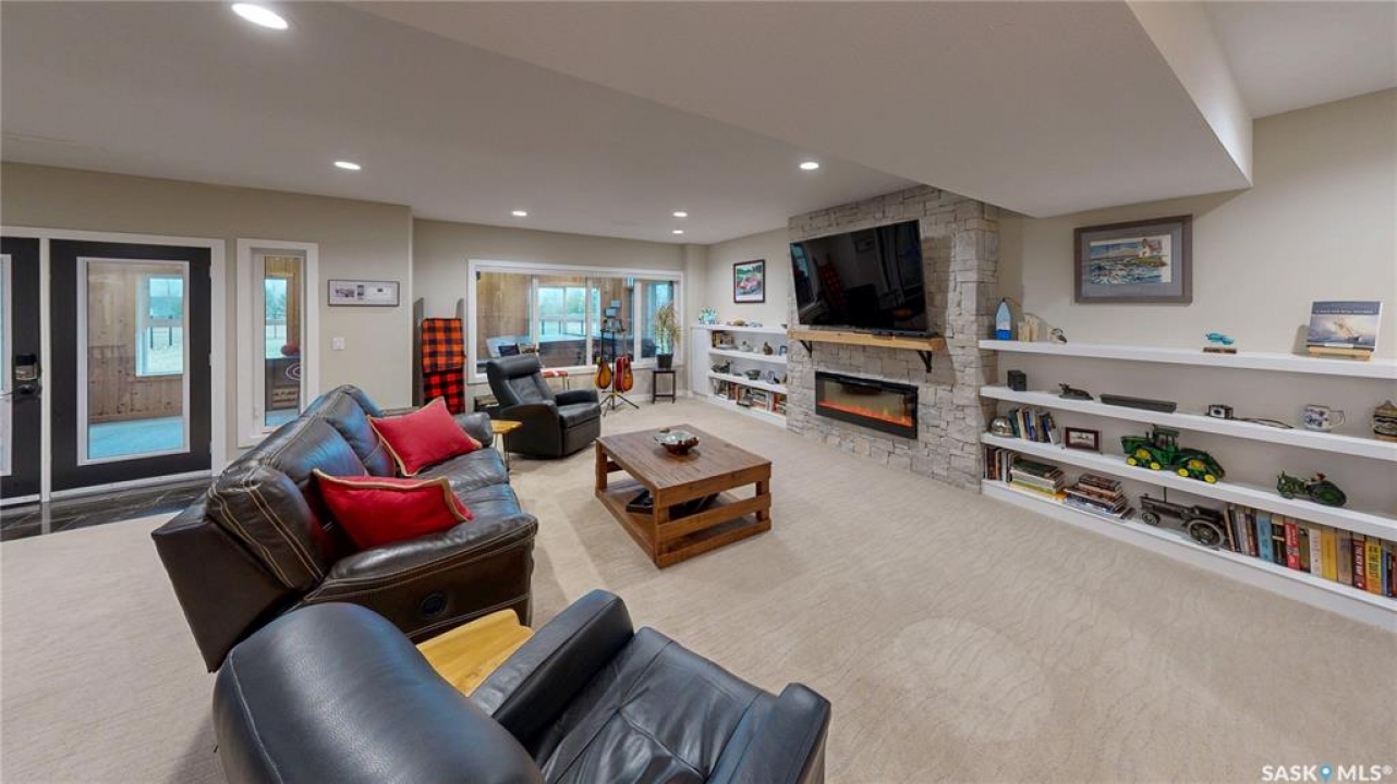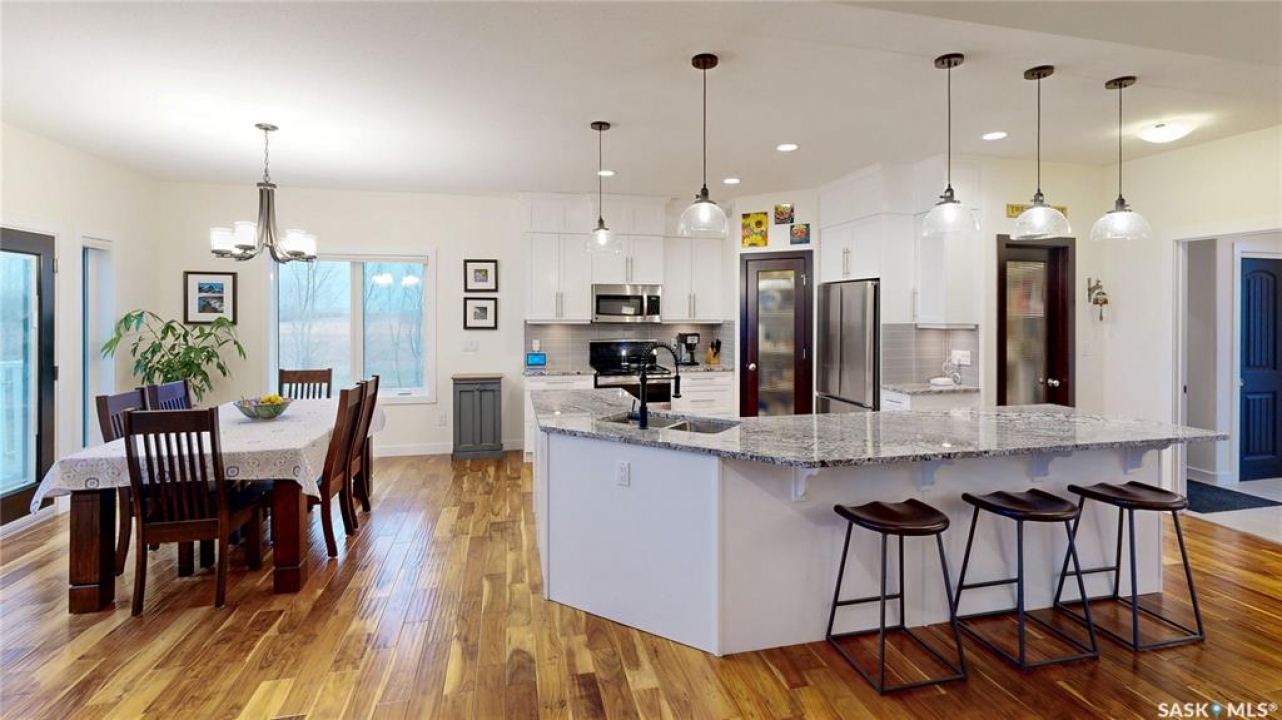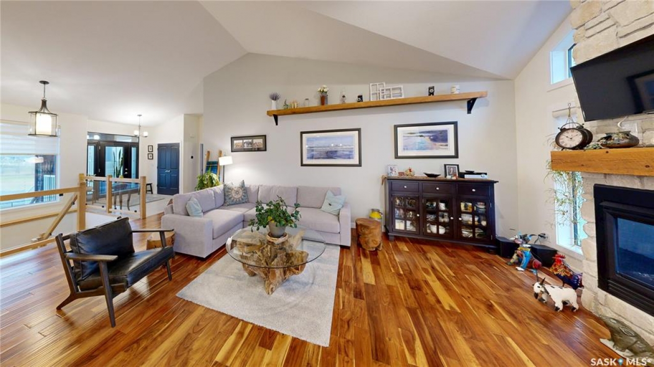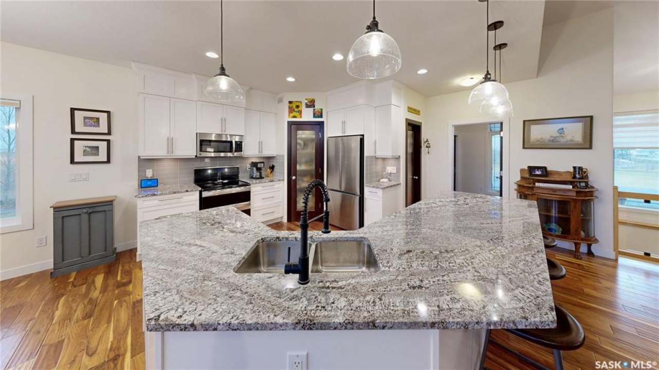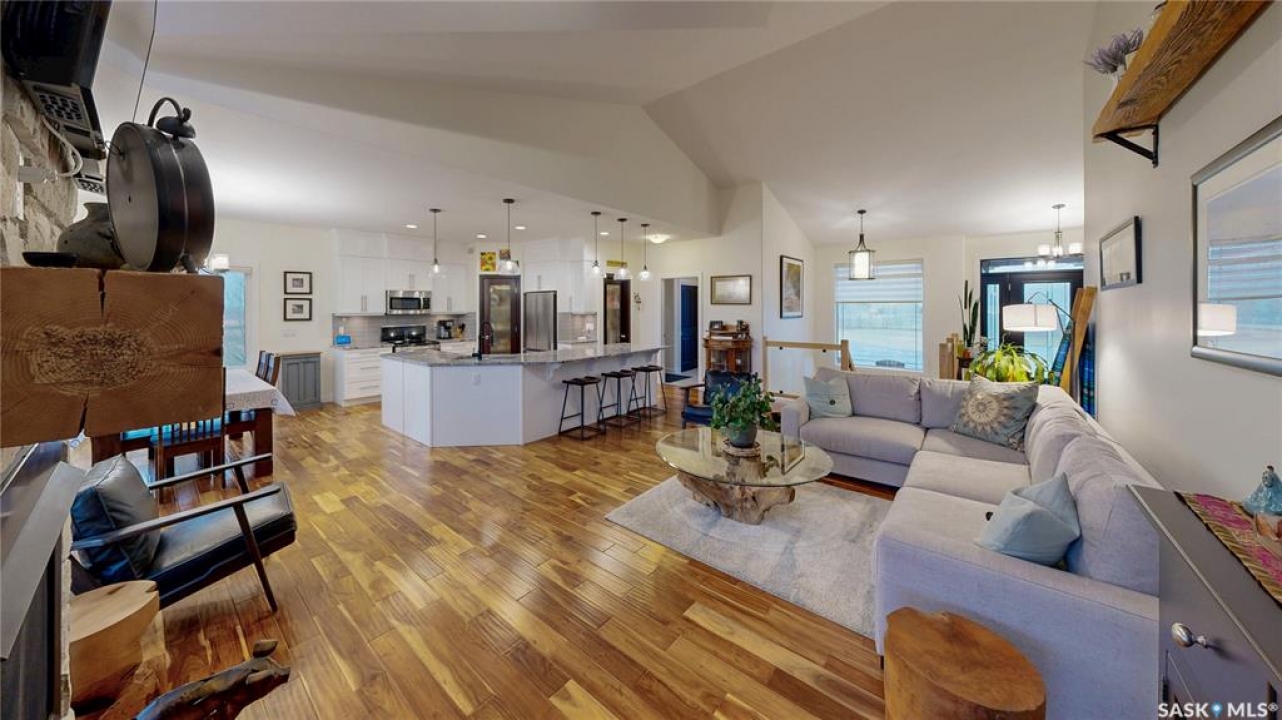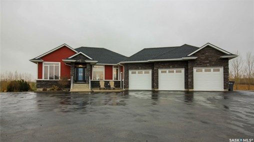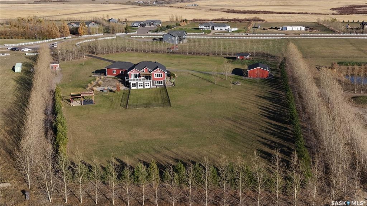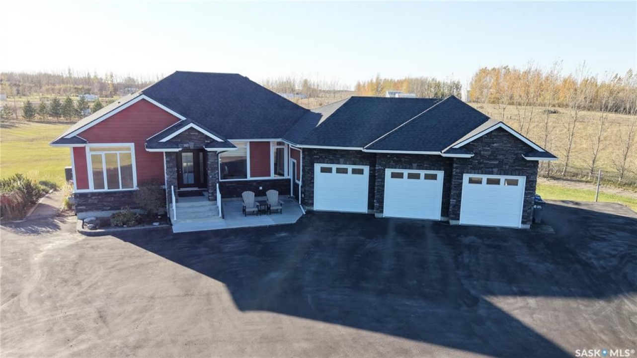 Welcome to 131 Rock Pointe Place in the Rock Pointe Estate community. This 2013 built, 1720 square foot, 4 bedroom 3 bathroom, walkout bungalow sits on a 4.86 acre lot. The huge three tiered garden beds are great for growing fresh produce and the stone patio below it makes another great place to gather. The large deck off the main level has ample room for outdoor furniture and opens up your hosting space beyond the dining room! You are also permitted to have 2 “livestock units” on the property excluding cows. There are two sheds on the property. One that is 17 x 20 with two roll up doors and another smaller one with power. The 30 x 40 heated and insulated shop is the ultimate handyman's dream. The living room has a 12' vaulted ceiling, engineered hardwood flooring that flows into the dining room and kitchen and a stone surround gas fireplace that is double sided and shared with the deck The kitchen has a huge walk through pantry, granite countertops, an island with bar seating and the stainless steel fridge, stove, dishwasher, microwave hood fan and stove are all included! The laundry room is next and leads through to the additional mudroom! The 36 x 40 triple attached, heated and insulated garage has extra storage shelves and a fridge. The first bedroom makes a great office and the main 4 piece bathroom follows. The primary suite a patio door to the deck and a 5 piece ensuite bathroom with dual sinks, a corner jet tub, a custom glass shower with tile surround and a walk in closet! The first stop downstairs is the wet bar! The rec room has built-in shelving, an electric fireplace with stone surround and LED pot lights The doors lead out to the enclosed hot tub room with a built in stereo system Next are two bedrooms and a 4 piece bathroom! Last is a den and the utility room that houses the high efficiency furnace, gas water heater on demand, HRV, and an stand up freezer! See the video for much more info!