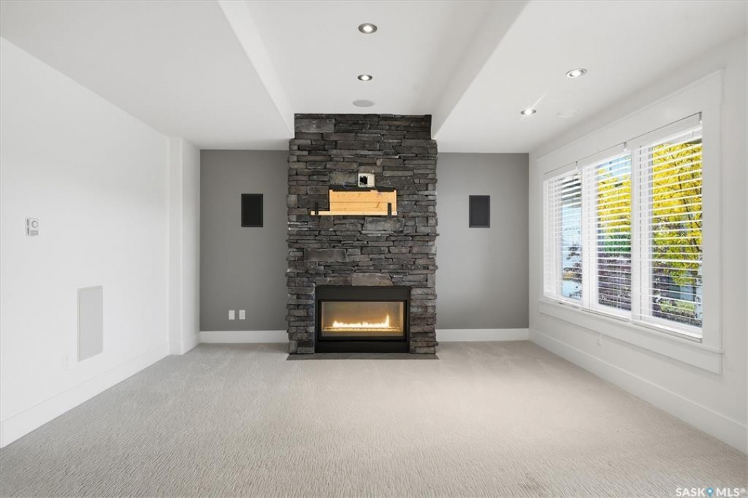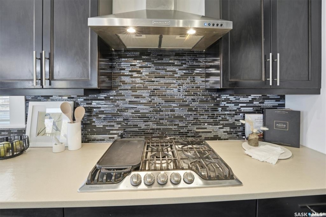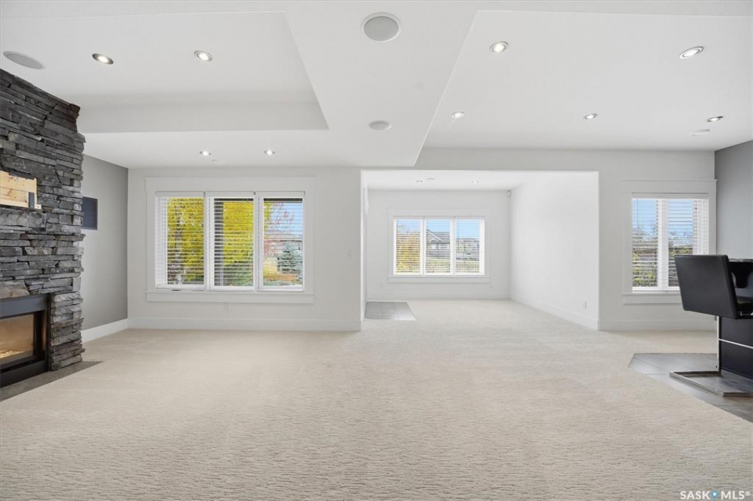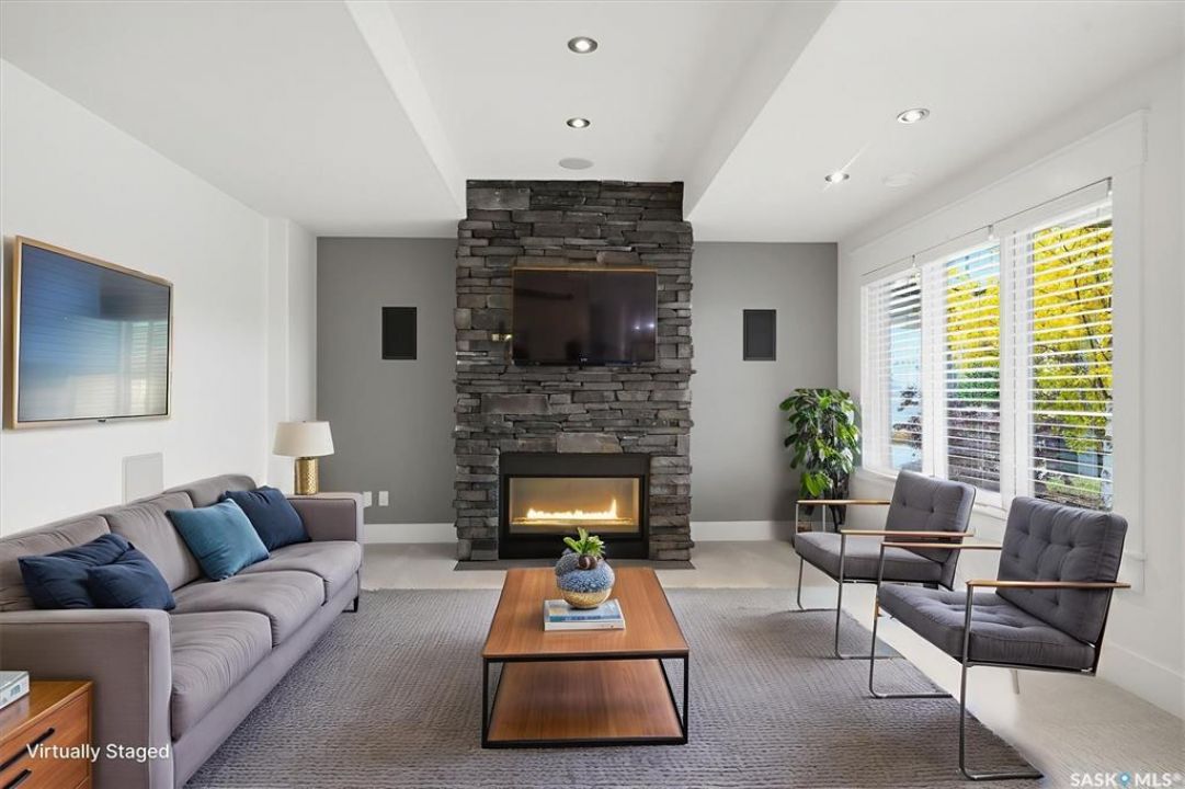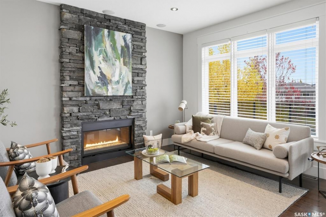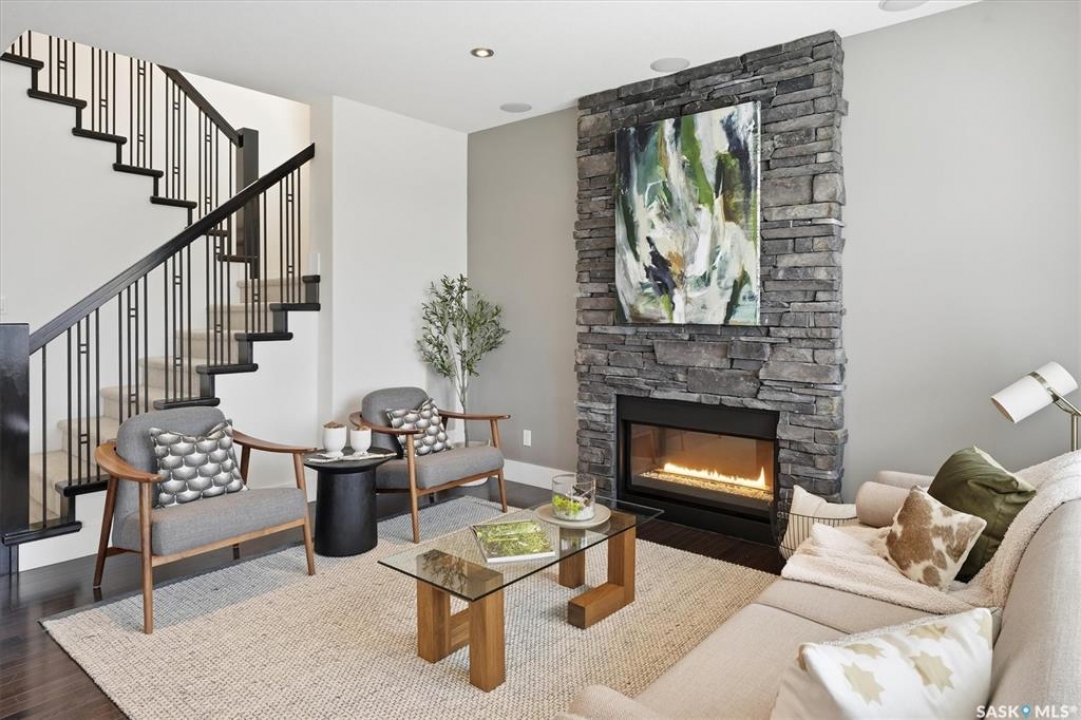 Stunning former lottery home in Stonebridge, backing onto a beautiful park and green space! This 2,114 sq ft two-storey offers a walkout basement with radiant in-floor heat, wet bar, fitness room, large windows, and a cozy gas fireplace overlooking the park. The main floor features a spacious office, an open-concept living, dining, and kitchen area with an angled island, maple cabinets, gas cooktop, and a park and lake view. Upstairs boasts 3 bedrooms including a luxurious primary suite with double sinks, stand-alone shower, and Jacuzzi tub. Enjoy two gas fireplaces (main & basement), triple-pane windows, under-cabinet lighting, heated garage, and professionally landscaped yard. In-slab patio lighting plus heated underground downspout drainage—great for spring melt. Exceptional craftsmanship built by D&S Homes and move-in ready — a truly one-of-a-kind park-backing home!