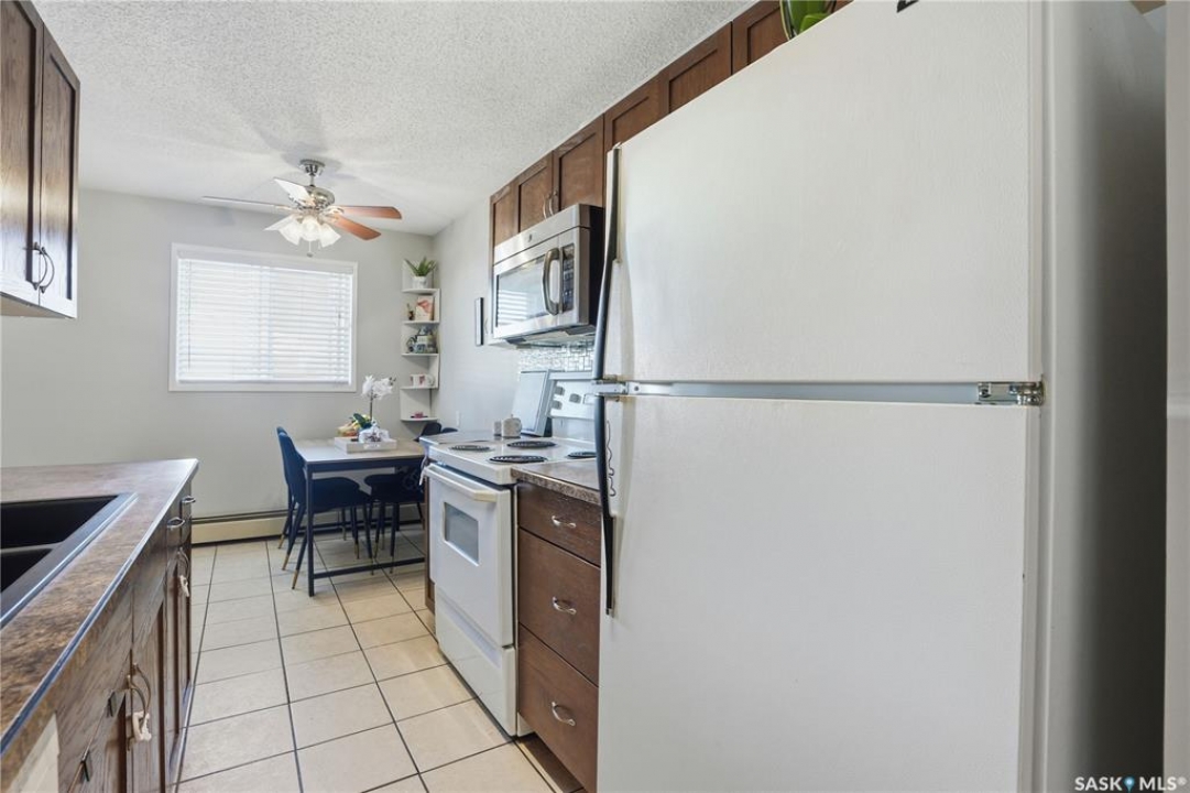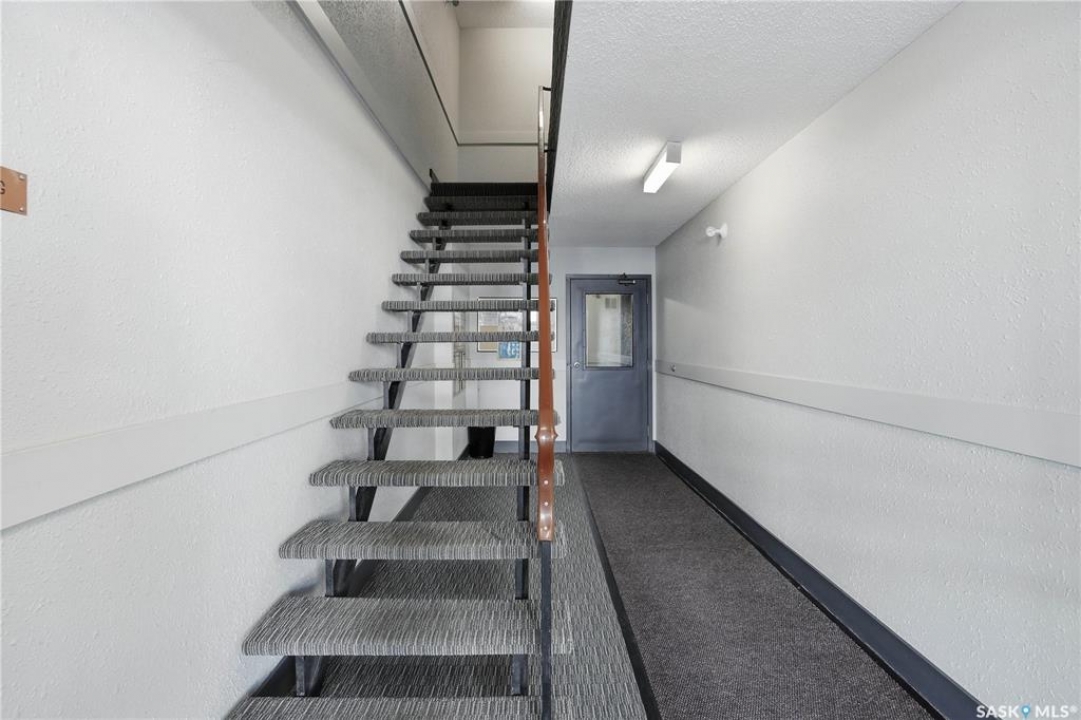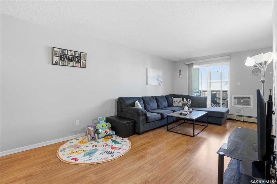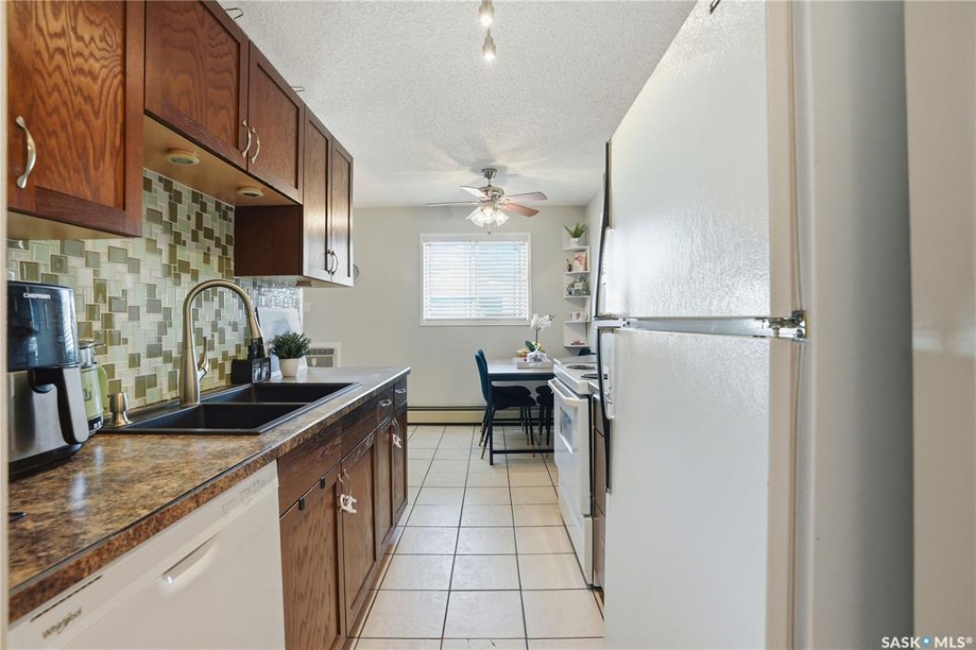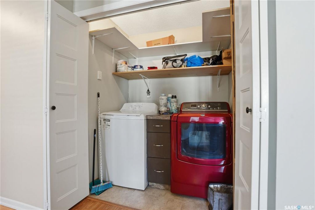 Location, location! This beautiful top floor unit is situated in a quiet and well managed building. This two bedroom unit has had many upgrades which include: kitchen, carpets, closet, doors, a dishwasher, a washer. This unit features a large living room, dining room, upgraded kitchen, two good size bedrooms, storage room, and the four piece bathroom. The balcony has a storage unit. Very affordable condo fees, for the size and the location. One surface parking stall included .Just move in and enjoy this mint unit.