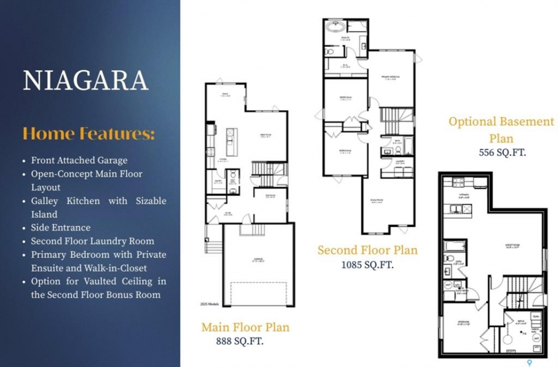 Welcome to the Niagara! With 1,973 sq. ft., this family home offers 3 bedrooms, 2.5 bathrooms, and a second-floor bonus room. Enjoy quartz countertops, Moen fixtures, and waterproof laminate flooring. The main floor features a spacious entry, a mudroom with coat hooks and room for a second fridge, an open-concept kitchen with a large pantry and oversized island, and a bright living area with deck access. A side entrance is included for optional basement development. Upstairs, the primary suite has a walk-through closet, ensuite with a soaker tub and walk-in shower, plus two additional bedrooms and a bonus room.