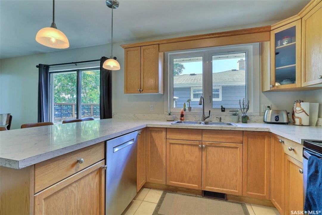 Location, location! Spacious well maintained bungalow on quiet Lakeview Street. Great street appeal with maintenance free lawn, rock border and front driveway. Open floor plan with gleaming hardwood flooring in spacious living room. Beautiful kitchen with an abundance of cabinets and counter space with tile flooring and patio doors off generous sized eating area to private deck. Large primary bedroom with huge closet and 2pc ensuite. 2nd bedroom has an exterior door and hookups for main floor laundry which could easily be moved downstairs. Large main floor family room addition (currently used as master) with fireplace and garden doors to rear yard. Basement has non-regulation basement suite with huge rec room, kitchenette, bedroom and 3/4 bath. Gorgeous, private well landscaped and maintenance free rear yard with stone patio and firepit area. Most appliances included. Call today!
