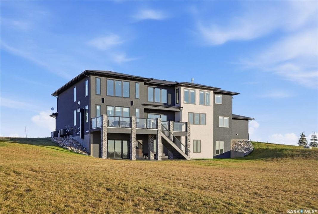 Located 30 minutes east of Saskatoon, this exceptional 2021 custom-built two-storey home spans over 3,700 sq. ft. above grade with a fully finished walkout basement, perfectly positioned to capture sweeping views of rolling hills and endless sunsets. The main floor's open-concept design showcases a chef-inspired kitchen, elegant dining area, and a grand great room with a striking gas fireplace framed by expansive windows. A spacious mudroom seamlessly connects to the heated 3-car garage, complemented by an additional single garage. The main level also features a private office, laundry, and powder room. Upstairs, discover an impressive bonus room and a luxurious primary bedroom complete with a spa-style 5-piece ensuite and a walk-in closet designed to impress, plus two additional bedrooms and a 4-piece bath. The walkout level extends the living space with two more bedrooms, a full bath, a family room with a gas fireplace and wet bar, and a fitness room. With city water, dual furnaces and A/C units, in-floor heat in the garage and basement, a mature shelterbelt, and absolute peace and privacy, this remarkable property redefines country luxury. You'll want to see this incredible property for yourself!
