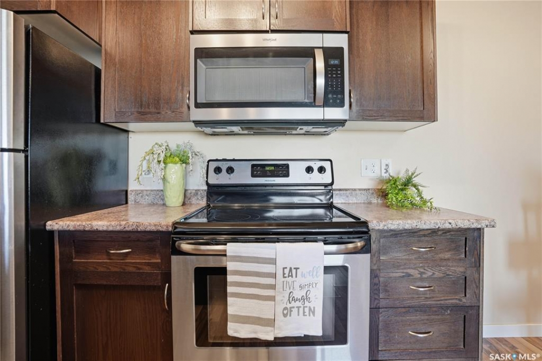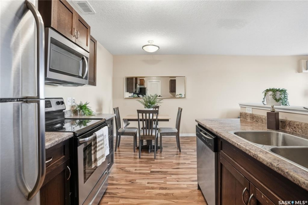Welcome to Unit 116 at 5521 Blake Crescent! This inviting two-storey condo offers comfort, convenience, and a peaceful setting — located on the north side of the complex with a private view of the green space. As you approach, you'll appreciate the charming front patio area — the perfect spot to unwind and enjoy warm summer evenings. Inside, the open-concept main floor is bright and spacious, featuring a large living area, a modern kitchen with a full stainless steel appliance package, a generous pantry, and a dedicated dining space that easily accommodates family gatherings or entertaining friends. Upstairs, you'll find two north-facing bedrooms, including a primary suite with a walk-in closet, a full 4-piece bathroom, and a conveniently located laundry area. This well-kept home is efficiently heated with in-floor heating to help keep utility costs low, and also includes a recently upgraded wall-mounted A/C unit and window coverings. Located within walking distance to many of Regina's northwest amenities, this condo offers the perfect balance of privacy and accessibility. Whether you're a first-time buyer, downsizing, or looking for a low-maintenance lifestyle — this home checks all the boxes!