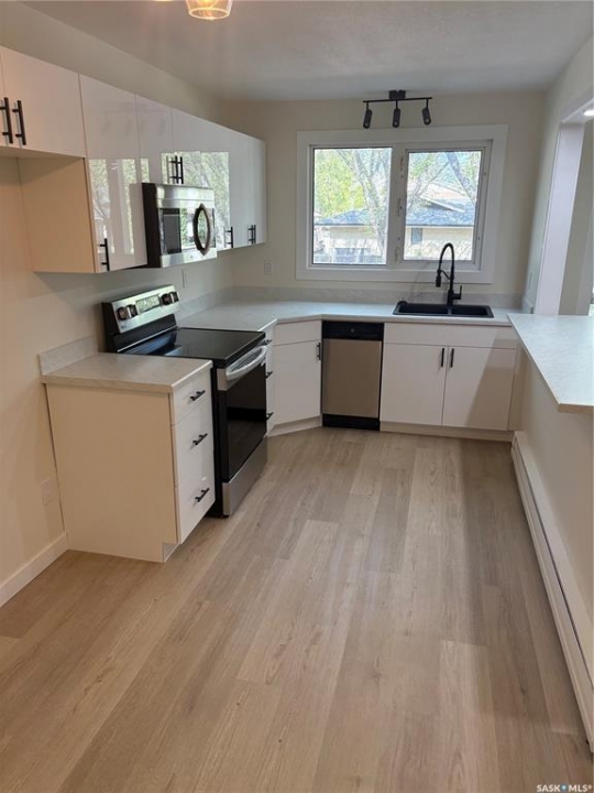 Located in Regina south neighbohood Hillsdale, Walking distance to school, park and all south end amenities. this condominium is completely renovated top to bottom, boasts a comfortable living space with two bedrooms and one bathroom. The residence features a balcony, allowing residents to enjoy outdoor space, and a large front window that floods the interior with natural light, creating a bright and inviting atmosphere. The well-designed kitchen with all stainless steel applies and dining area offer ample space, with plenty of cabinets for storage. This condo combines practicality with a touch of comfort, making it a potential cozy home in a desirable location. The building has been renovated over the years including outside siding, windows,new boiler system and etc.