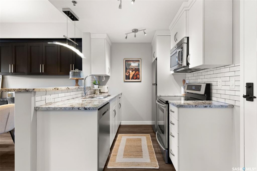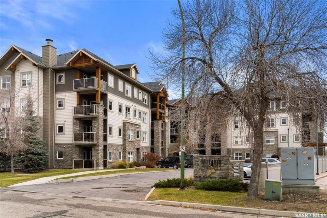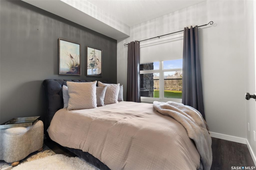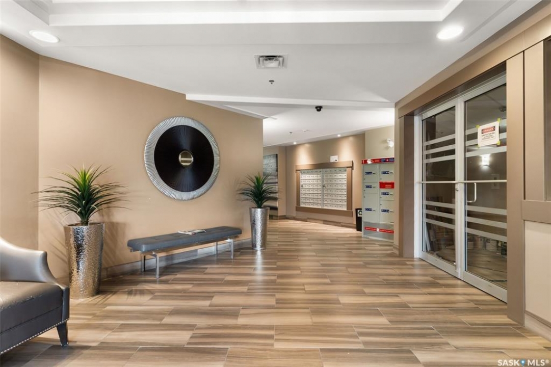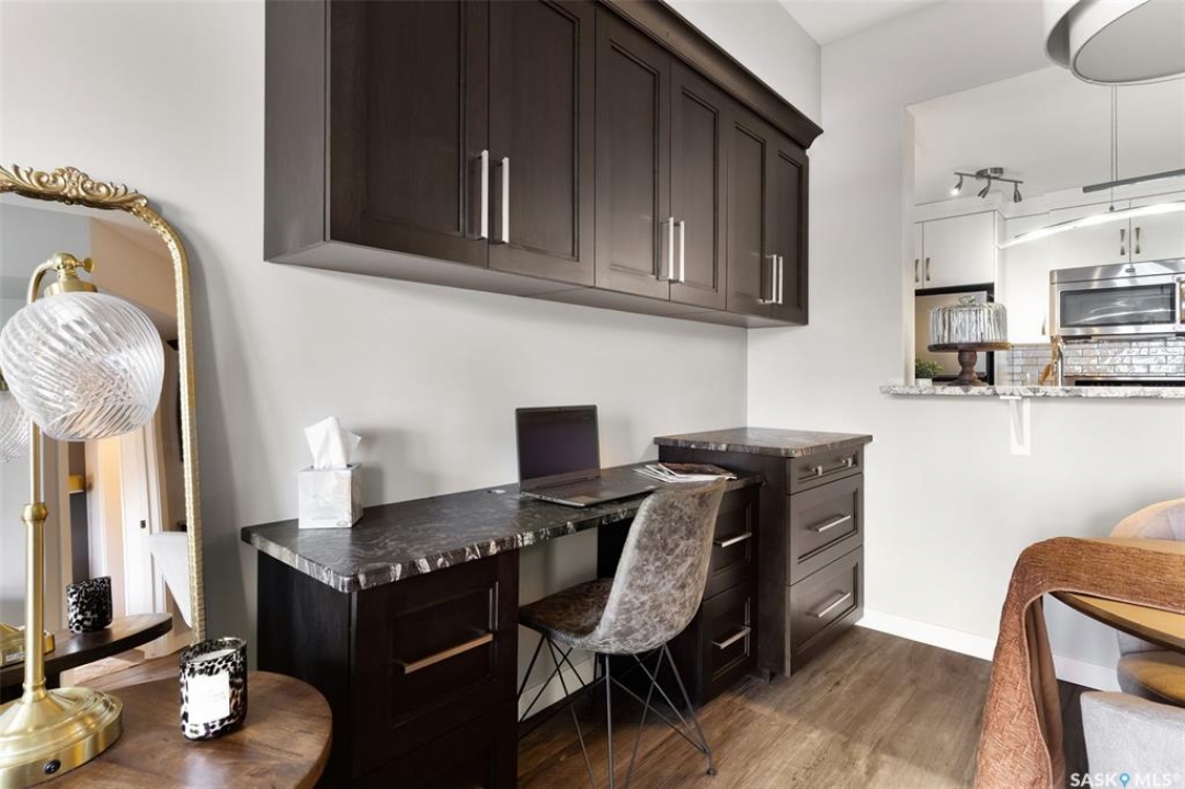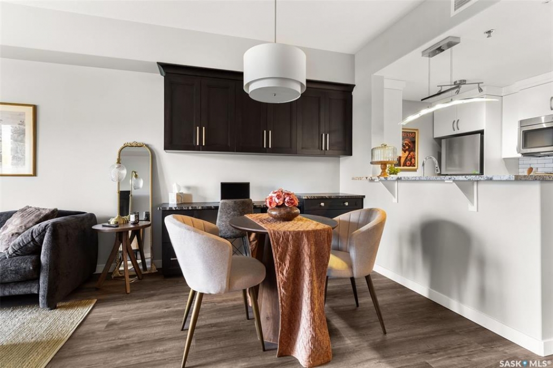 Located in Hillsdale across from Wascana Lake with great access to the U of R, Downtown and all of Regina's South amenities is this modern, upscale one bedroom condo in the Bellagio. Enjoy the sunlit mornings from the comfy living room that overlooks the manicured landscaping surrounding the Bellagio. The dining area has built in cabinetry with quartz counter tops that seamlessly integrates elegant dining area cabinetry for your dinnerware and multipurpose as a workspace desk. The dining room design maximizes space with a luxurious functionality. Opposite is the custom designed wine rack with extra space to display your stemware. The chic, inviting white kitchen will inspire your culinary skills offering pull out drawers, subway tiled backsplash, quartz counter tops, stainless steel appliances and an eating bar for extra seating. The primary bedroom overlooks the front balcony with large east facing windows, vinyl plank flooring that seamlessly runs through the custom designed walk-through closet to the 4-piece bath. The bathroom is a modern luxury retreat. The granite countertop has unique veining patterns to add timeless elegance and a soothing touch to your bathroom. The condo unit is complete with an in suite laundry area & storage space. Capping it all off, the unit comes with a secured underground parking stall with storage cabinets, plus the Bellagio offers an amenities room and a gym.