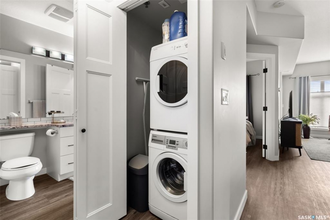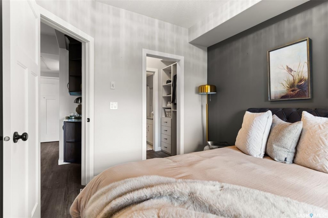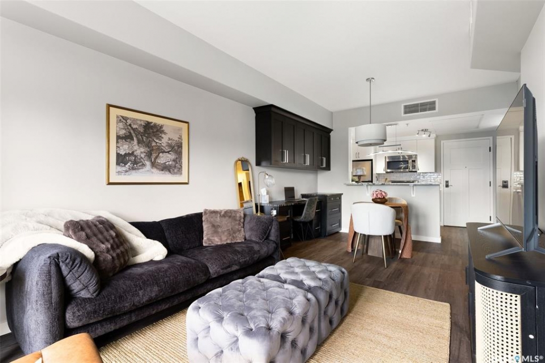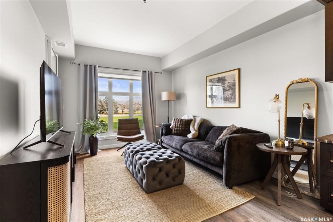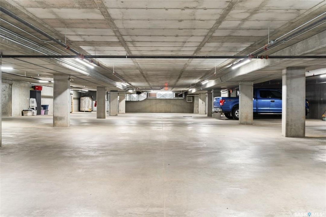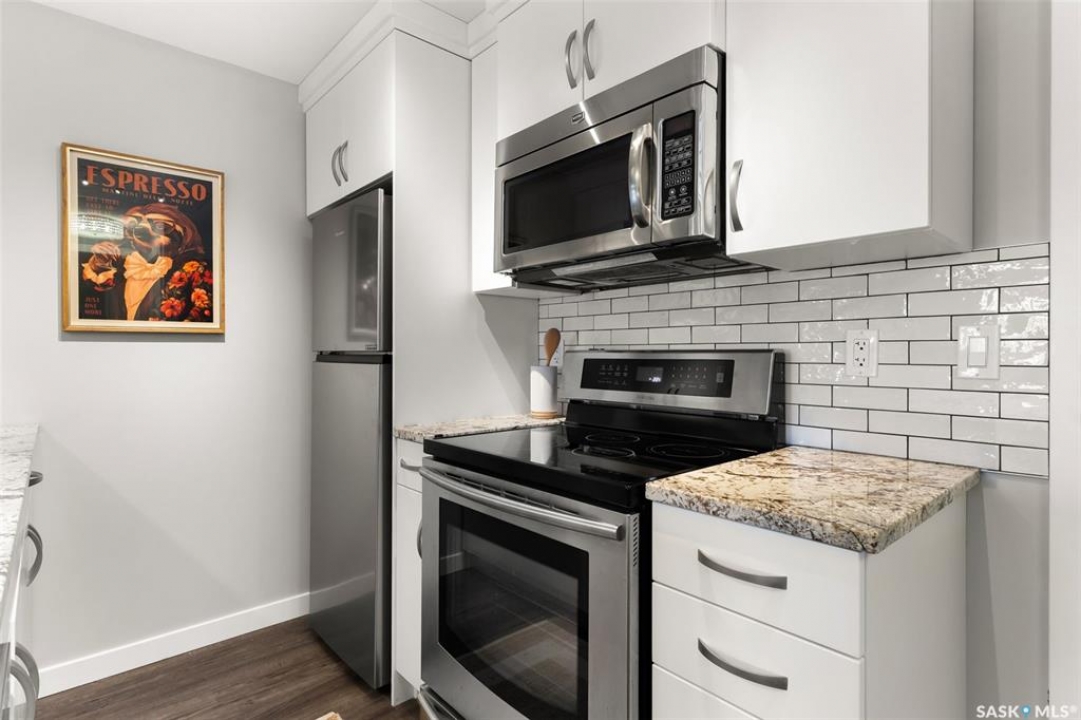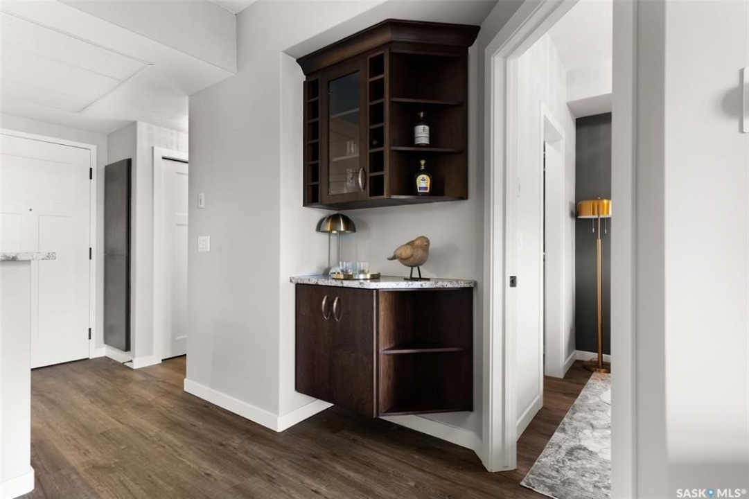 Located in Hillsdale across from Wascana Lake with great access to the U of R, Downtown and all of Regina's South amenities is this modern, upscale one bedroom condo in the Bellagio. Enjoy the sunlit mornings from the comfy living room that overlooks the manicured landscaping surrounding the Bellagio. The dining area has built in cabinetry with quartz counter tops that seamlessly integrates elegant dining area cabinetry for your dinnerware and multipurpose as a workspace desk. The dining room design maximizes space with a luxurious functionality. Opposite is the custom designed wine rack with extra space to display your stemware. The chic, inviting white kitchen will inspire your culinary skills offering pull out drawers, subway tiled backsplash, quartz counter tops, stainless steel appliances and an eating bar for extra seating. The primary bedroom overlooks the front balcony with large east facing windows, vinyl plank flooring that seamlessly runs through the custom designed walk-through closet to the 4-piece bath. The bathroom is a modern luxury retreat. The granite countertop has unique veining patterns to add timeless elegance and a soothing touch to your bathroom. The condo unit is complete with an in suite laundry area & storage space. Capping it all off, the unit comes with a secured underground parking stall with storage cabinets, plus the Bellagio offers an amenities room and a gym.