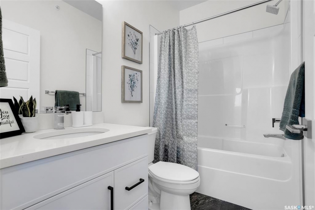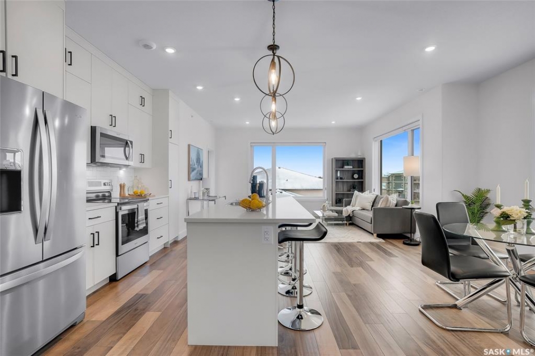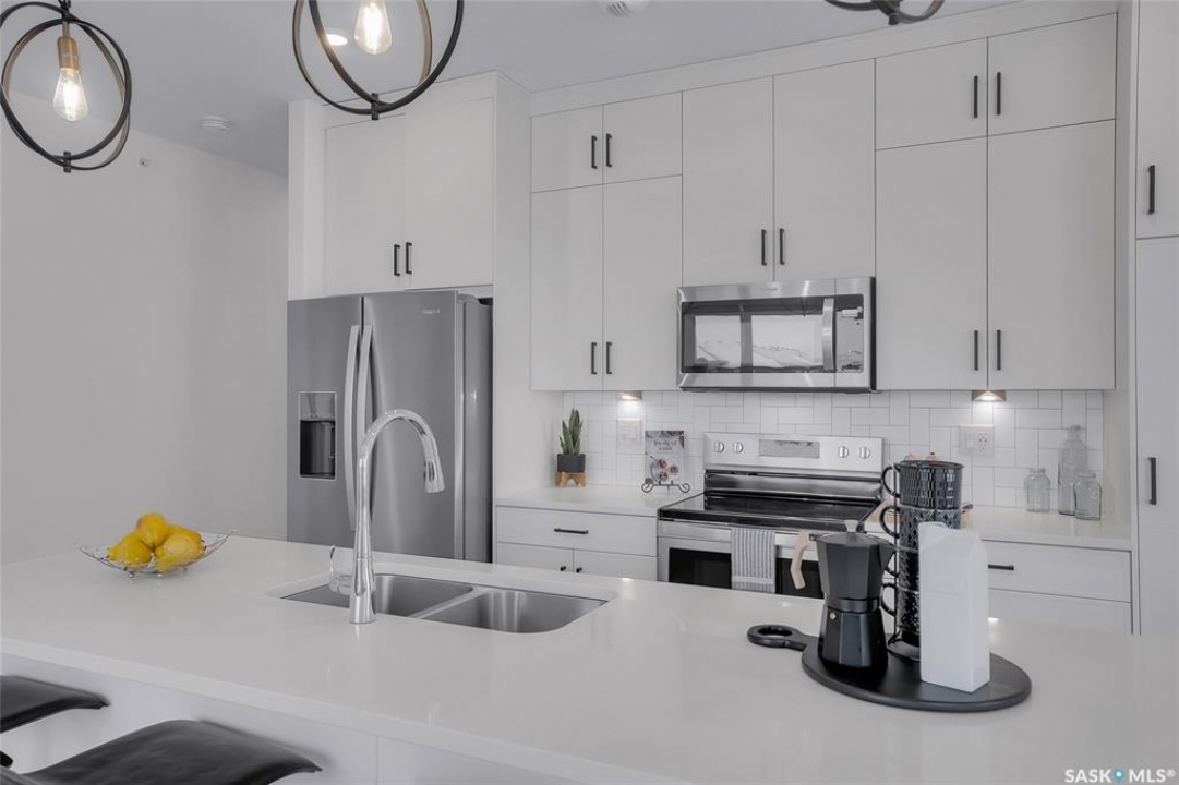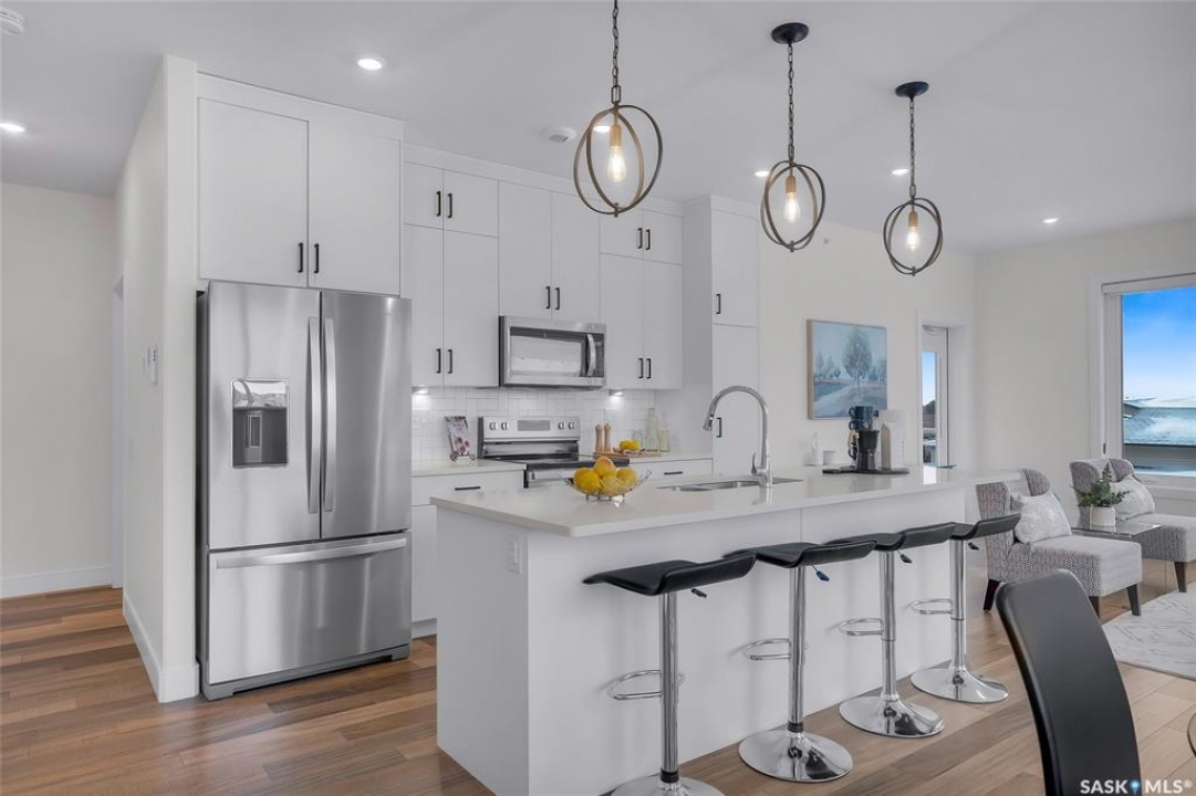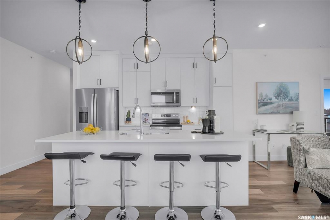 Welcome to 300-105 Willis Crescent, a bright and inviting top floor 2 bedroom, 2 bathroom corner unit offering comfort, convenience, and modern living in desirable Stonebridge. This thoughtfully designed unit faces east, providing peaceful views and beautiful natural light throughout the day. The open-concept layout features a modern kitchen with stainless steel appliances, tile backsplash, ample cabinetry, and an island perfect for entertaining. The living room opens onto a private balcony with natural gas BBQ hookup, perfect for BBQ'ing and relaxing outdoors. The spacious primary bedroom includes a 4-piece ensuite. A second bedroom, 4-piece bathroom and in-suite laundry complete this condo. Additional highlights include Hunter Douglas blinds, central air conditioning, and 2 parking stalls - 1 surface stall and 1 underground stall with a storage unit. Residents enjoy access to excellent building amenities including: Amenities/rec room with outdoor terrace, exercise room and guest suite available to rent for visitors. Located in the vibrant Stonebridge neighbourhood close to shopping, restaurants, parks, and transit. Immediate possession available. Move-in ready, book your private showing today!