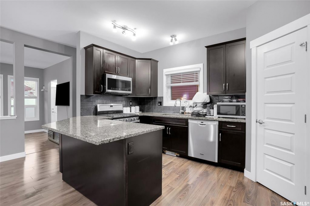 Step into Kensington living at its best with this fully developed two storey that delivers way more than you expect. The upgraded exterior, stone accents, and inviting front porch set the tone immediately, while inside the bright west exposure fills the main floor with natural light. The kitchen hits the right notes with stainless appliances, a gas stove, and a casual breakfast bar that naturally becomes the gathering spot. This unique floor place has a main floor den adding flexibility for work or play, and upstairs keeps life simple with laundry right where you need it along with 3 well planned bedrooms and 2 bathrooms. With a total of 4 bedrooms and 4 baths, everyone gets their own space. The basement is a standout, offering a large L-shaped family room anchored by a cozy gas fireplace, plus a full bath and an extra bedroom. Summer stays comfortable with central air, and the backyard is ready to enjoy with stamped concrete patios and walkways. The 20x20 detached garage with 10-foot ceilings is a huge bonus for storage or projects. All of this is just steps from Ed Jordan Park and close to Father Vachon and Lester B. Pearson Elementary Schools and all of Kensington's amenities making it an easy home to fall into and an even easier one to love.