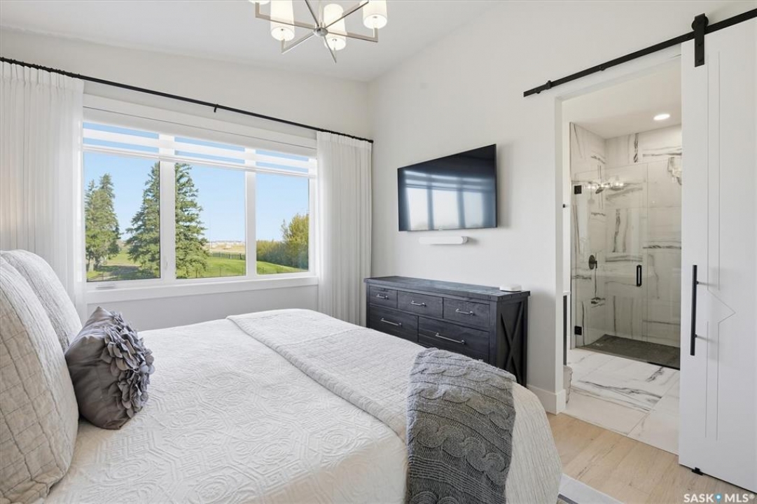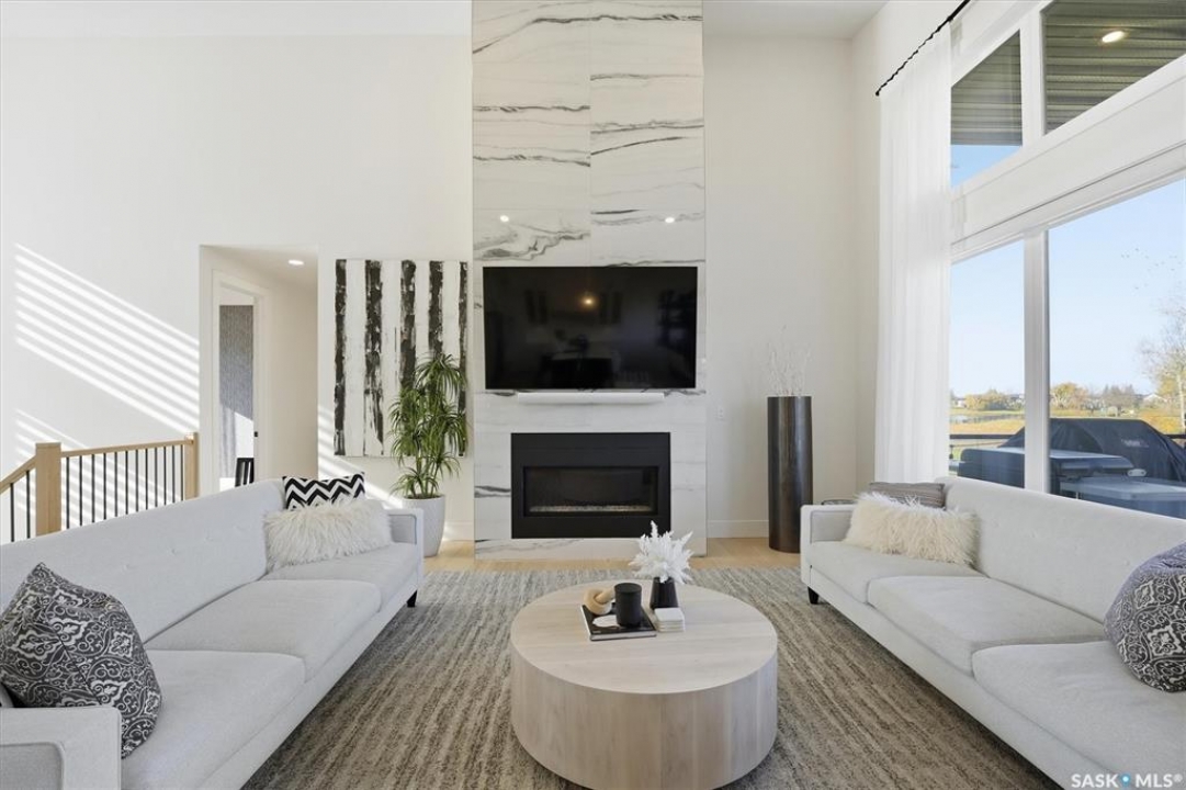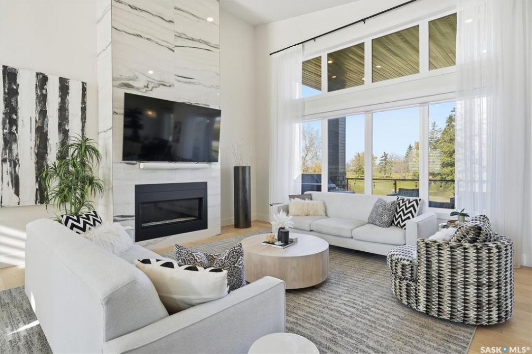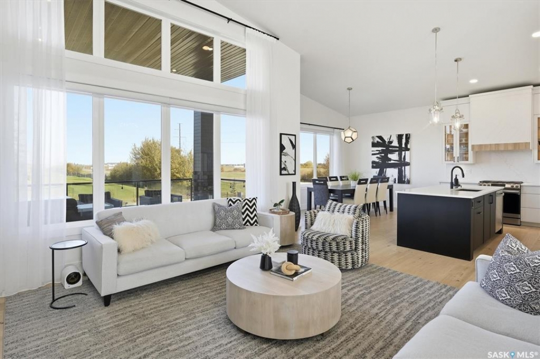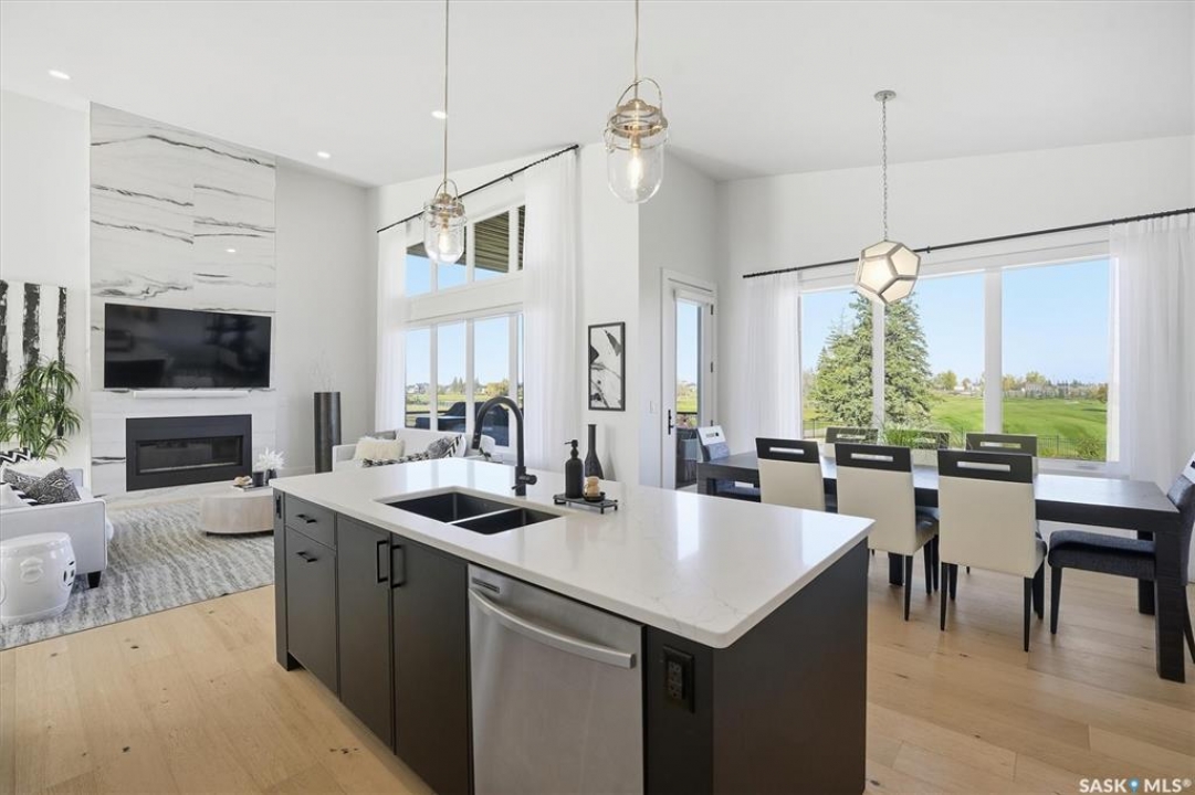 Absolute Stunner! Designer custom D&S Homes walkout bungalow, crafted with precision and showcasing an award-winning floor plan. Offering 1,694 sq ft on main plus a fully dev walkout basement, this 4-bed, 3 bath home is set on an expansive 17,000 sq ft lot backing the Greenbryre Golf Course — with no neighbouring homes in sight, only serene views of the course, a landscaped side buffer and open prairie fields. The entry opens into a breathtaking, light-filled great room with ultra-high soaring ceilings and a dramatic feature fireplace. The open-concept living, kitchen, and dining area is an entertainer's dream, wrapped in oversized windows overlooking the course. The chef's kitchen features soft-toned lacquer cabinetry with double-height uppers, quartz counters, full-height quartz backsplash, 5-burner gas range, walk thru pantry, a coffee bar, and a massive central island. The connected dining area is spacious enough for large gatherings and opens to a private covered deck for seamless indoor-outdoor entertaining.The main floor also includes a large boot room, a bright office, outfitted laundry room, and a luxurious primary suite complete with a fully tiled spa-style ensuite, walk-in shower, dual vanity, and walk-in. A striking custom staircase leads to the fully dev walkout level, which mirrors the quality of the main floor. This level offers a sprawling family room with a 2nd fireplace, floor to ceiling windows overlooking the show-stopping backyard, a wet bar with wine storage and seating area, and a dramatic full height glass-walled gym. 2 large bedrooms and a full bathroom complete this level. Additional highlights: • Professionally landscaped grounds • Heated double garage • Zoned in-floor boiler plus forced-air furnace • Instant hot water • Central air • Wired for a hot tub • Underground sprinklers, oversized concrete drive A tasteful masterpiece in design and function — this Greenbryre walkout is spectacular in every detail.