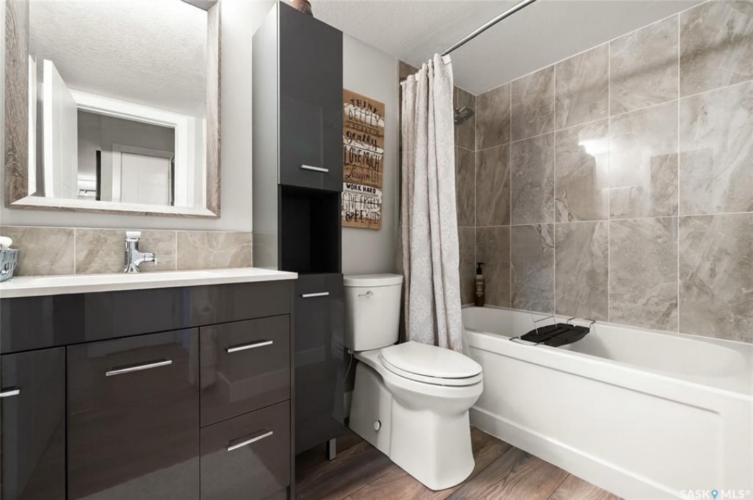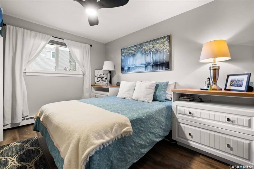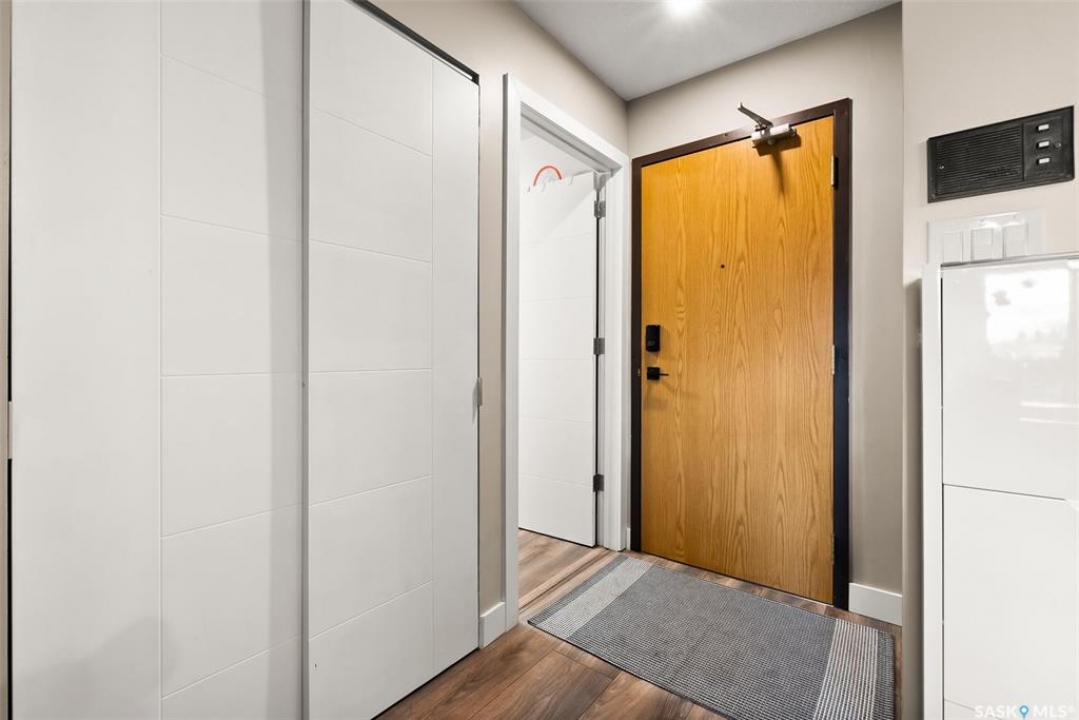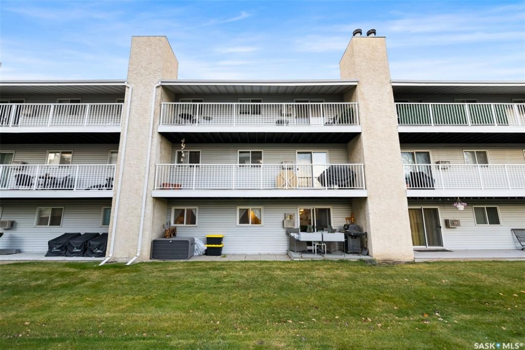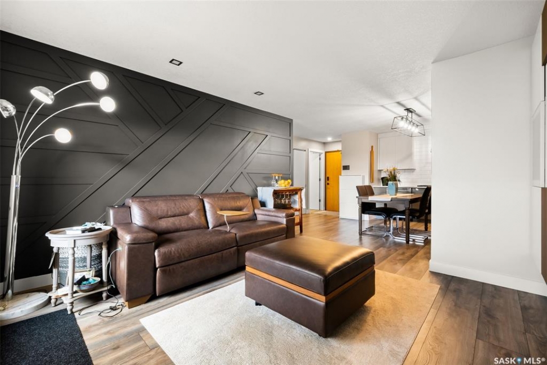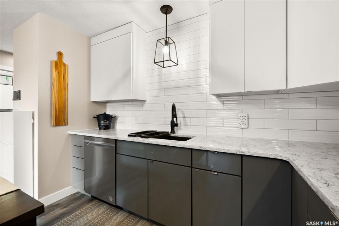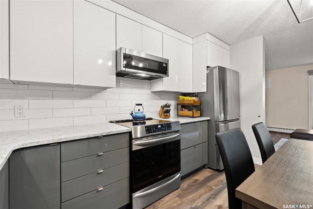 Beautifully renovated main-floor condo with thoughtful updates throughout. The 2020 renovation opened up the front entry, creating a bright, welcoming, and spacious feel. The custom kitchen was redesigned and reconfigured to maximize both function and storage, featuring thermafoil cabinetry with solid wood bases, large pot drawers, pull-out garbage bins, quartz countertops, a tile backsplash, and an undermount sink. Additional updates include plumbing fixtures, new light fixtures, added pot lights, updated interior doors and trim, fresh paint throughout, and a stylish feature wall. The removal of the corner fireplace opened up the living room and allowed for the addition of a built-in wall unit. For a seamless aesthetic, the bathroom includes the same thermafoil cabinets as the kitchen. During the renovation, the soaker tub and tile surround were widened to fit a larger tub. No detail was overlooked including upgraded baseboard heater covers and retextured ceilings further enhance the space. The condo features locking PVC windows, upgraded stainless steel appliances including an induction stove, and upgraded laminate flooring throughout. The primary bedroom offers built-in cabinetry and a walk-through closet with direct access to the bathroom. This well-designed unit includes 2 bedrooms, 1 bathroom, smart storage solutions, and an in-suite laundry room. The patio door opens to a quiet outdoor space that extends onto the lawn and does not overlook the parking lot. One electrified parking stall is included. The complex also provides an outdoor pool for residents to enjoy and has also undergone some improvements to the common areas including paint and carpet. A truly move-in-ready home showcasing exceptional style and attention to detail.