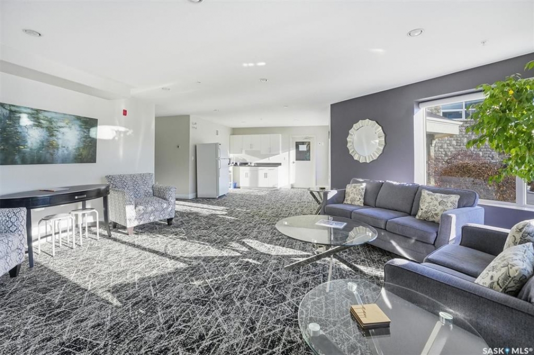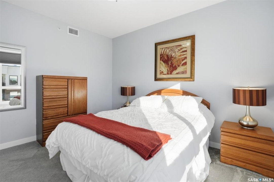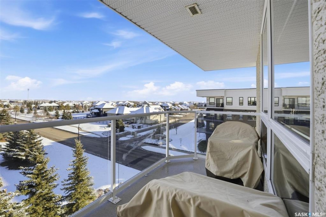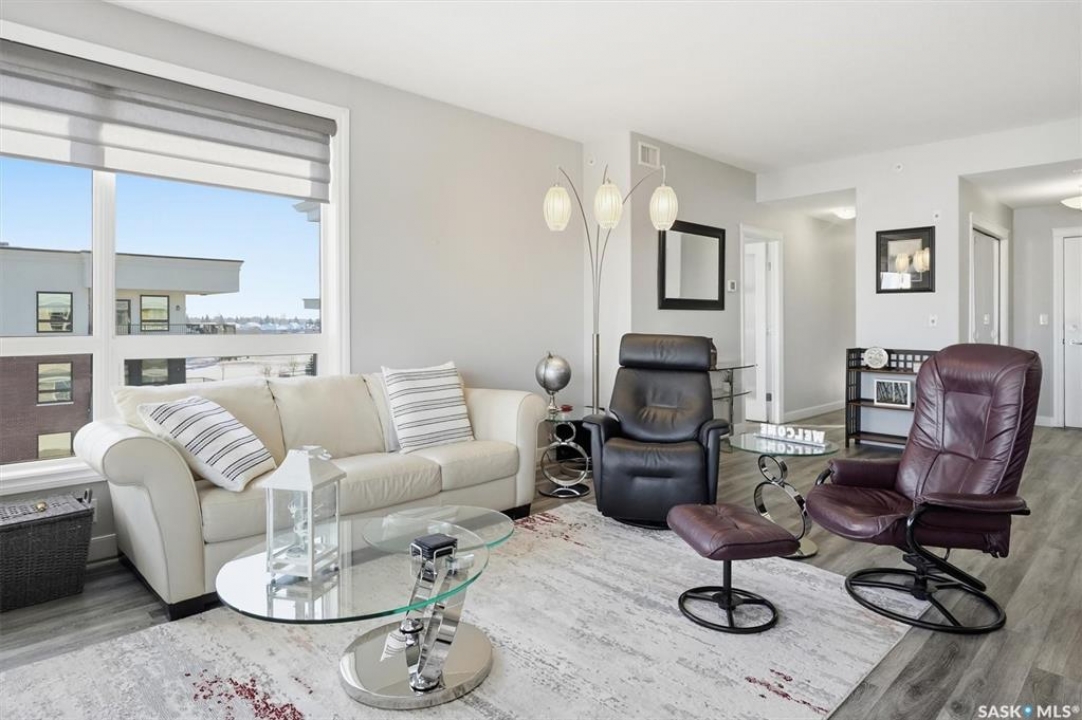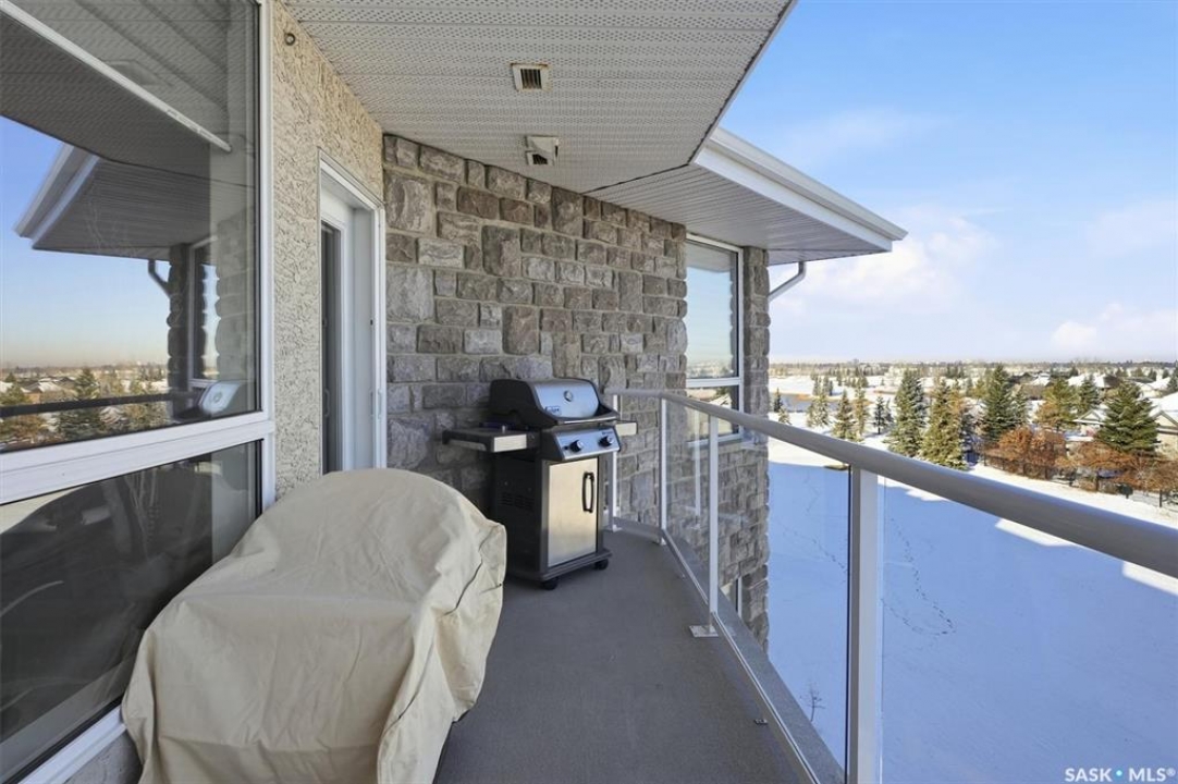 Discover this beautifully upgraded top-floor corner unit in Woodbridge II, a premier luxury condo building in The Willows by Valentino Homes. Enjoy spectacular views of The Willows Golf Course and the surrounding community, enhanced by abundant natural light from the south, east, and west exposures. With 1,565sqft �of living space, large windows, and 9-ft ceilings create a bright, open atmosphere throughout. The living room, dining area, kitchen, and den all feature upgraded luxury vinyl plank flooring and fresh paint. The stylish kitchen showcases refaced cabinets, quartz countertops and backsplash, a spacious island with a quartz waterfall feature, and stainless steel appliances—all seamlessly connected to the main living space. This unit includes two bedrooms plus a den, providing flexibility for work or guests. Both bathrooms are updated with ceramic tile flooring, new lighting, and quartz countertops. The primary suite stands out with upgraded built-in cabinetry, dual sinks with prep area, a full-sized shower, and a generous walk-in closet. Additional high-end upgrades include Hunter Douglas remote-controlled blinds—plus blackout blinds in the bedrooms—and a newer central air conditioning system. The laundry/storage room offers a newer washer and dryer and a custom cabinet with slide-out shelving. Step onto the deck to enjoy the views, complete with a natural gas BBQ hookup. Convenience continues with one underground parking stall, one surface stall, and an impressive two-level storage room offering nearly 100 sq. ft. of space. Pets are welcome with board approval. This exceptional unit delivers comfort, style, and an unbeatable location in one of Saskatoon's most desirable communities.
