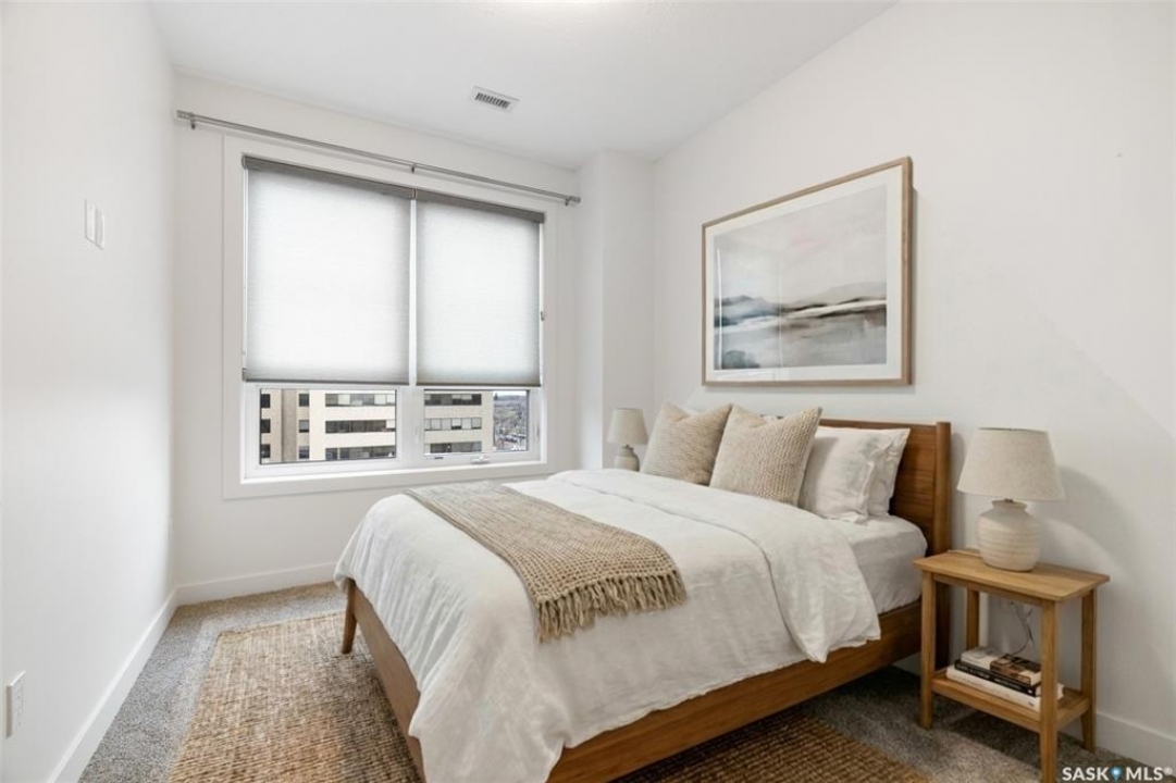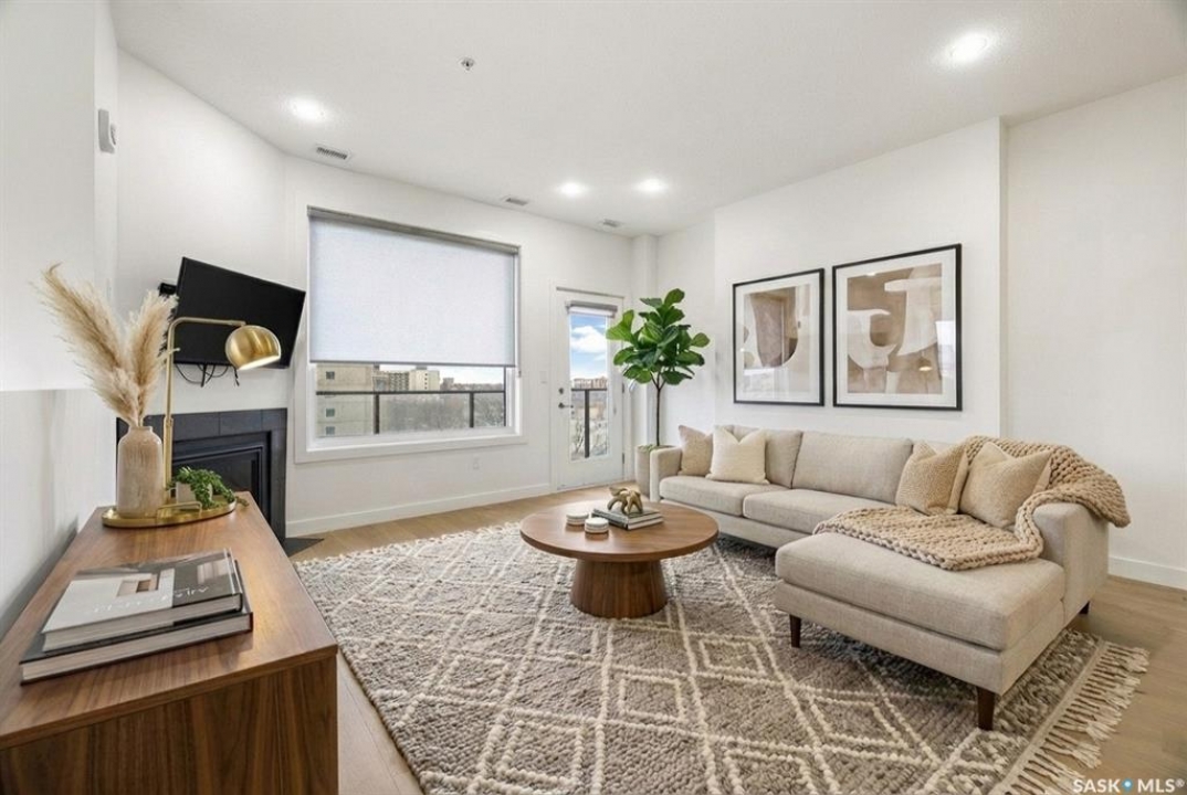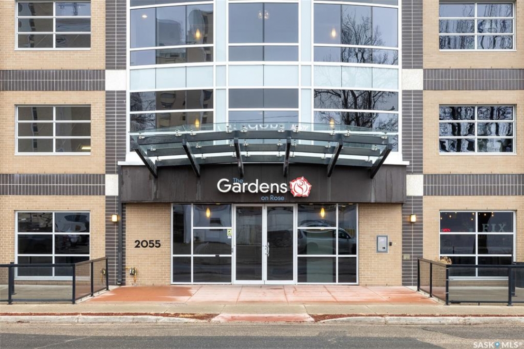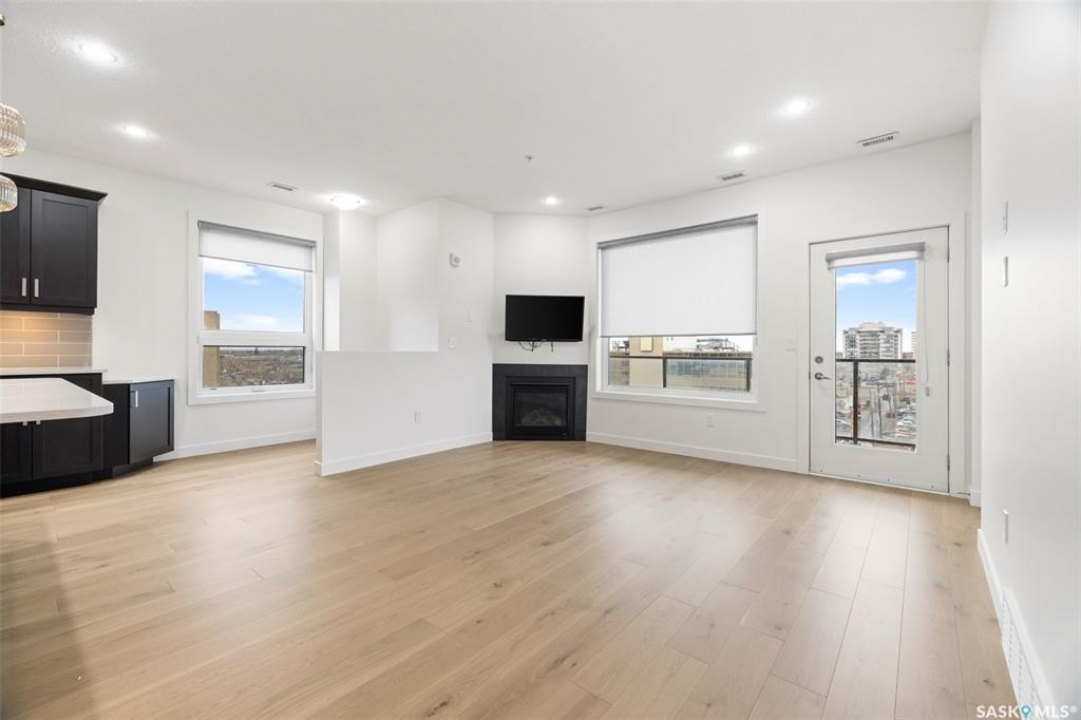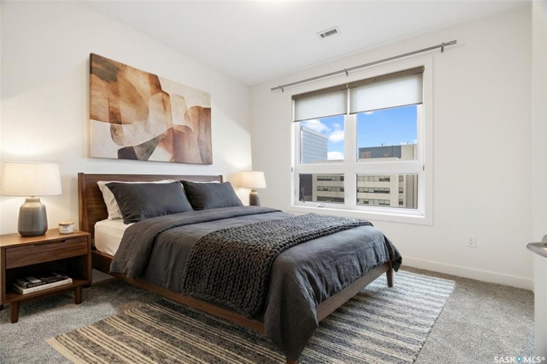 Welcome to The Gardens on Rose, where luxury meets convenience in the heart of downtown. This beautifully renovated 2-bedroom, 2-bathroom condo sits on the 6th floor with impressive city skyline views and a bright, open-concept layout. A major renovation completed in September 2025 brings a fresh, modern feel throughout the home. Updates include engineered hardwood flooring, plush carpet in the bedrooms, new paint and baseboards, countertop adjustments, new stainless-steel stove and dishwasher with fridge only 2 years old. The kitchen features rich cabinetry, stone counters, a large island, and stylish pendant lighting, opening seamlessly to the living and dining areas. A cozy gas fireplace, oversized windows, and access to the private balcony make the main living space both warm and inviting. A dedicated office nook is ideal for working from home. The spacious primary suite offers a generous walk-through closet and 4-piece ensuite. The second bedroom is perfect for guests or a roommate, with a full bathroom nearby. Enjoy the convenience of in-suite laundry. A rare offering downtown, this unit includes TWO underground parking (heated) stalls, adding exceptional value and peace of mind. Residents enjoy premier amenities: a rooftop fireplace lounge, rooftop gardens, a spa-inspired hot tub area, fitness centre, and a main-floor coffee and pastry bar. The building is secure and fully equipped with elevators. Move-in ready and thoughtfully upgraded, this condo delivers modern living, urban comfort, and amenities you won't find anywhere else downtown. Some Virtually Staged Photos are labeled.