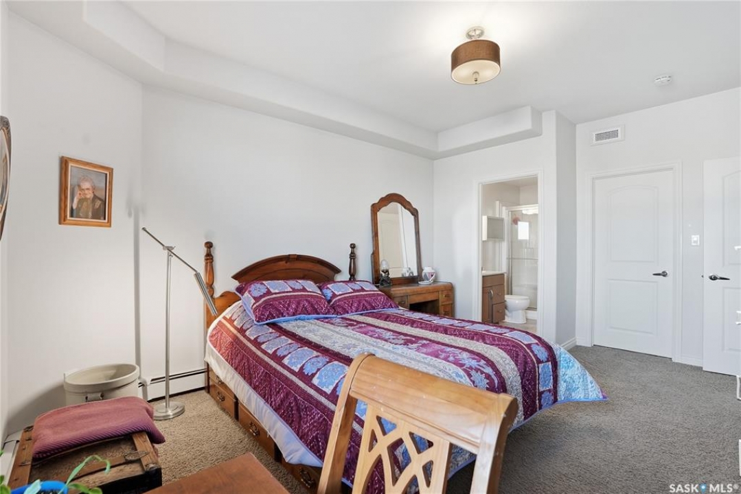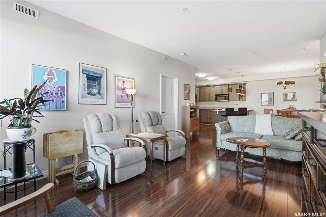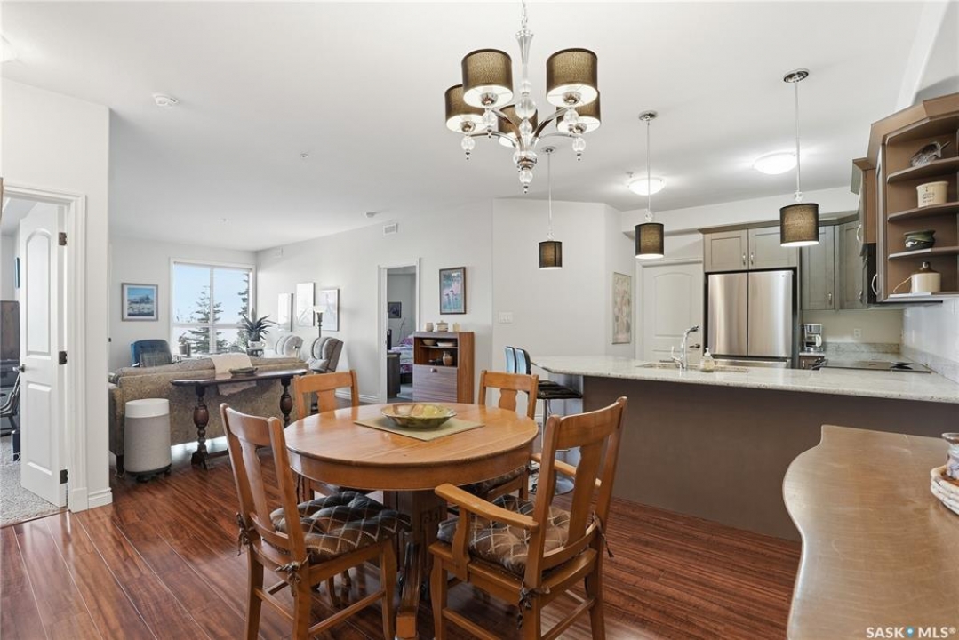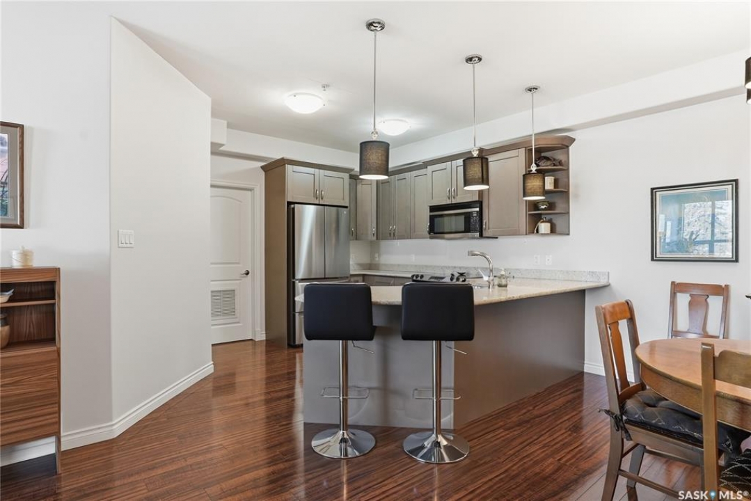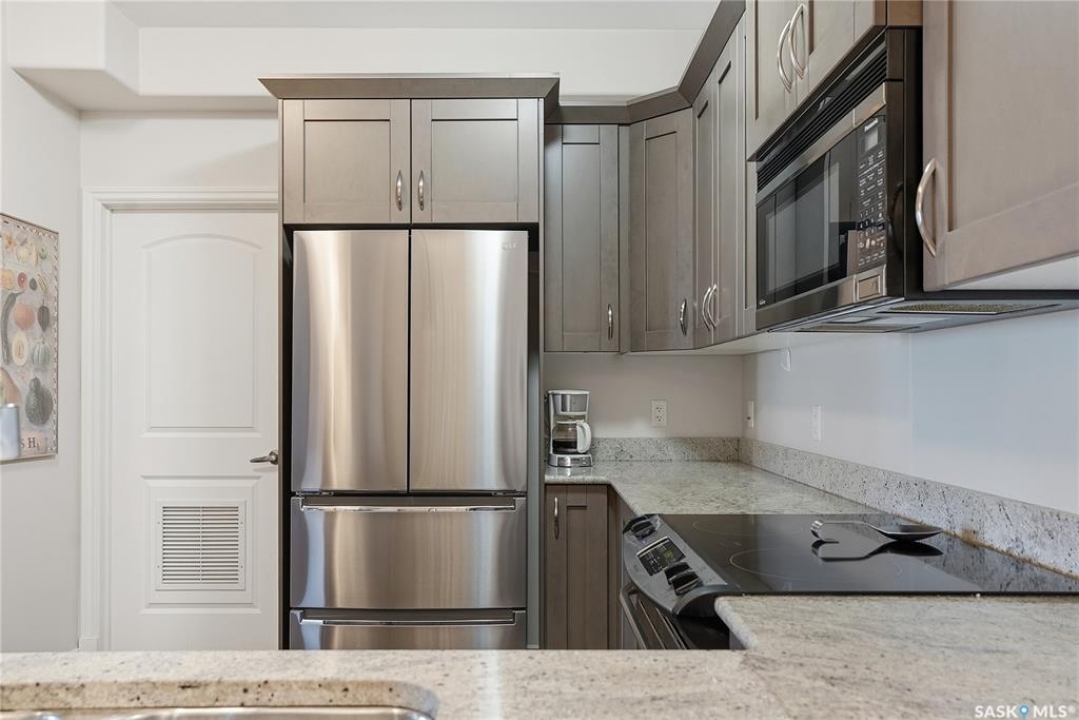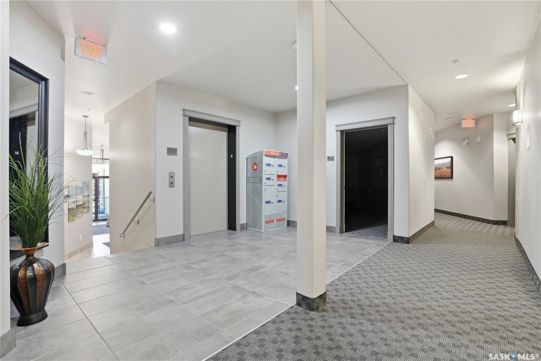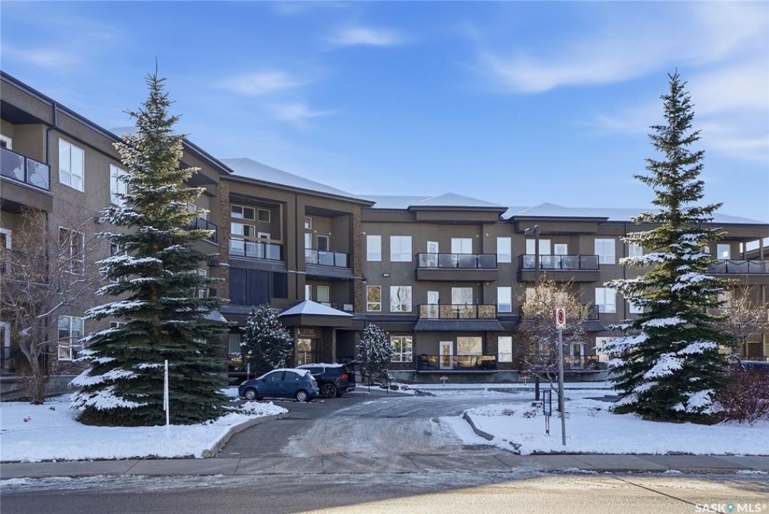 Experience upscale modern living at the Silverleaf: Linden collection of condominiums in Saskatoon's Greystone Heights. Its quiet yet connected setting offers everyday access to some of the best spots in Saskatoon by foot, bike, car, or bus, from a peaceful park-side location. A neighbourhood known for its quiet crescents, majestic evergreens, and charming mid-century architecture, is also less than a 15min cycle to Broadway Avenue shopping, cafés and eateries, 8th Street conveniences, downtown Saskatoon, the University of Saskatchewan, RUH and the Meewasin River Valley, via the nearby 14th Street walking & cycling paths. Designed and built by award-winning Riverbend Developments, the Silverleaf community features approx. 45 thoughtfully designed contemporary residences, beautiful Apline-inspired exteriors, large balconies, with comfortable interiors and generous building amenities. Inside suite 214, this extremely well maintained home offers high-quality details such as nine-foot ceilings, high-grade flooring, granite counter surfaces in both kitchens and baths, Superior Cabinets millwork and cabinetry, and oversized windows. The excellent floor plan model relies little on hallways, giving you expansive views through the suite's window wall from the living room to the kitchen, and includes two large bedrooms, two full bathrooms, a spacious living room, and an incredible kitchen with island seating for 4. The Silverleaf: Linden offers heated underground parking, central air conditioning, heated storage lockers, amenities room, fitness area, and an attractive front lobby and interior common areas. Suite 214 comes complete with a full appliance package, large balcony, in-suite laundry, and custom blinds. You are invited to inquire on this fine home to schedule your personal viewing today.