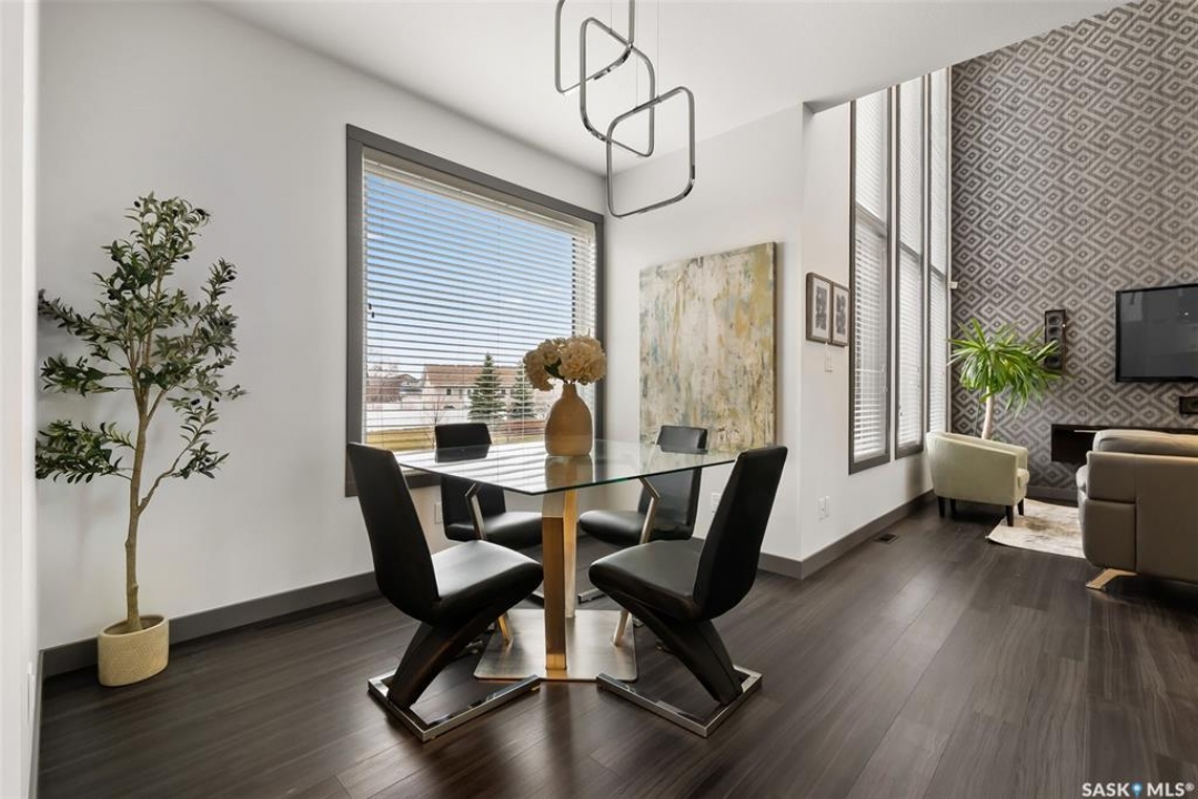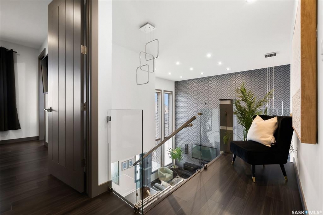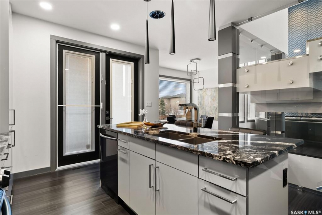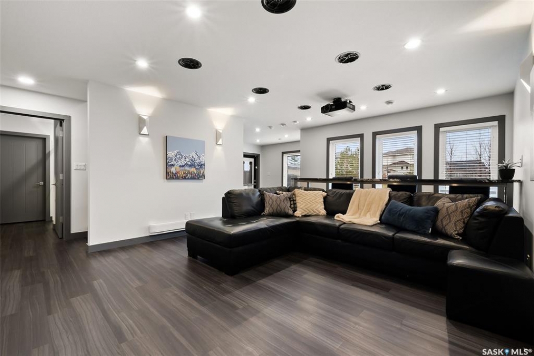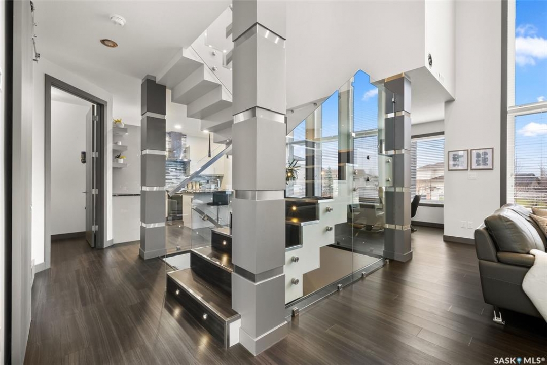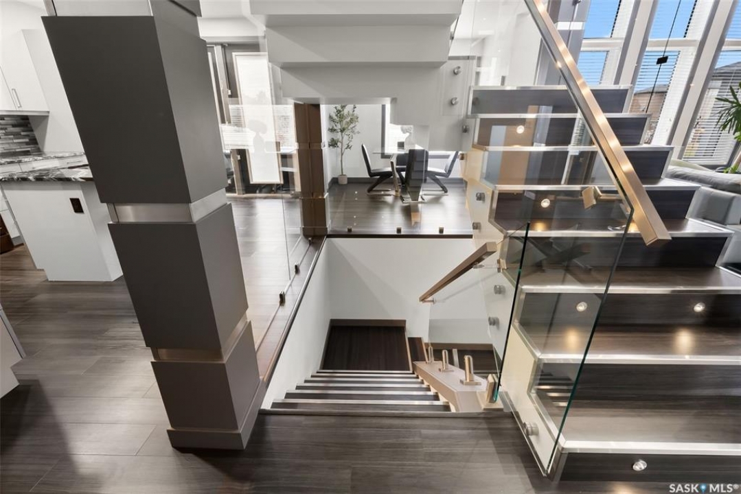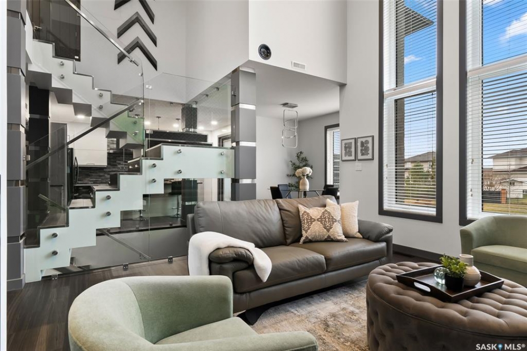 Welcome to this stunning custom-built walkout in Fairways West! This home is in a prime location and backs the beautiful walking path leading to the Goulet Golf Course. The moment you step inside, 19-foot ceilings and floor-to-ceiling windows create a dramatic sense of space and light. A striking glass-and-stainless steel staircase, accented with subtle stair lighting, introduces the home's modern, refined style. The kitchen is both beautiful and practical, featuring custom white cabinetry, a generous sit-up island, granite countertops and premium stainless-steel appliances. There is garden door access from the kitchen which opens onto a private west-facing deck—ideal for morning coffee or evening entertaining while taking in the peaceful green space. Upstairs you'll find the primary retreat, complete with a walk-in closet and a luxurious five-piece ensuite featuring dual vanities, a stand-alone soaker tub and a custom-tiled shower. Two additional bedrooms, a four-piece bath, and a convenient laundry room complete this level. The fully developed walkout basement is built for entertaining or unwinding after a long day. The rec room is set up as a perfect home theatre complete with a projector screen and built-in sound system! A sleek wet bar adds style and convenience, while the fourth bedroom doubles as a guest room, office, or home gym. Expansive windows keep the space bright and welcoming. The oversized double attached garage is a standout—heated, drywalled and equipped with 12-foot ceilings, a floor drain, and water taps. There are built-in speakers throughout the house and receivers are all included. Every detail in this home combines contemporary design with practical luxury. Discover a residence where craftsmanship and lifestyle meet in one exceptional property. This Fairways West show piece is one you do not want to miss out on!