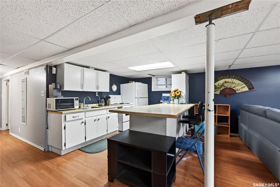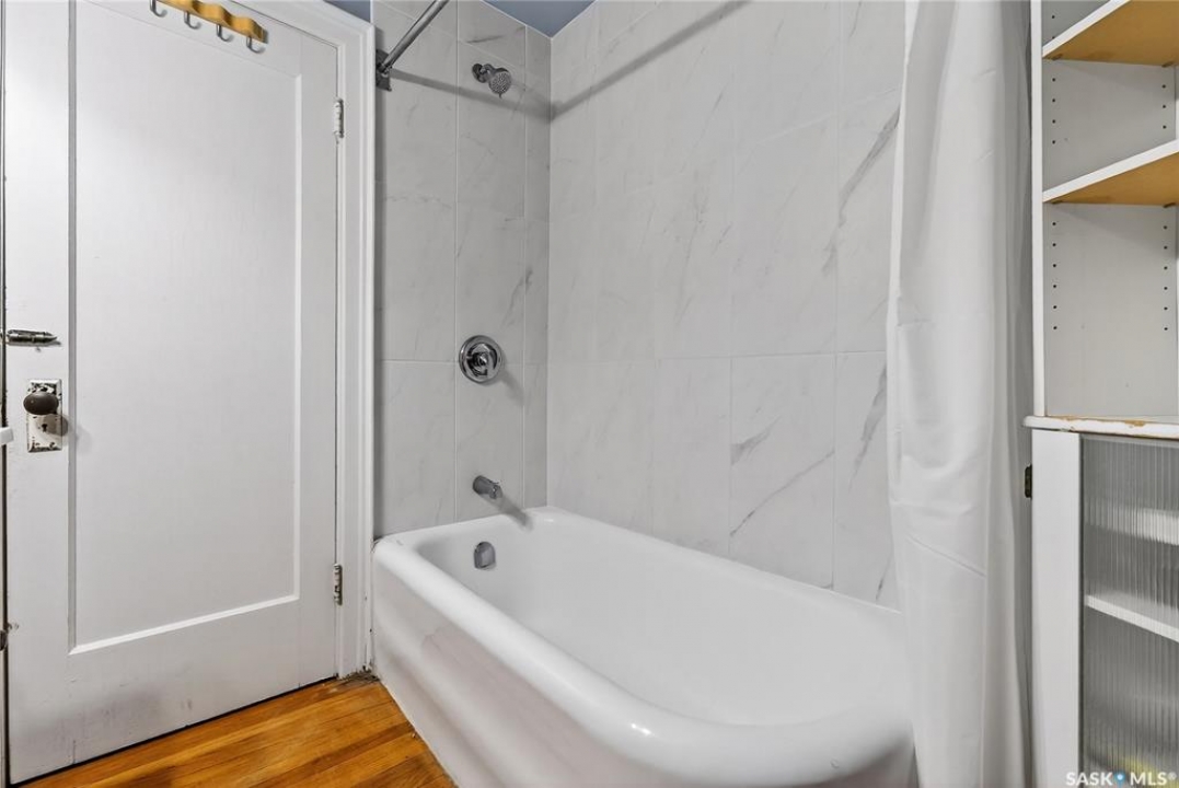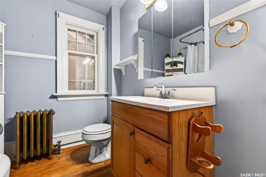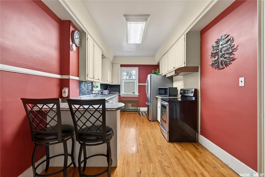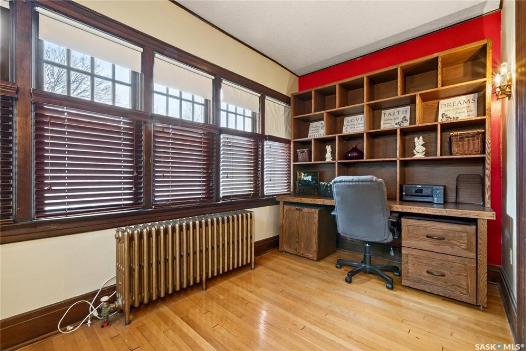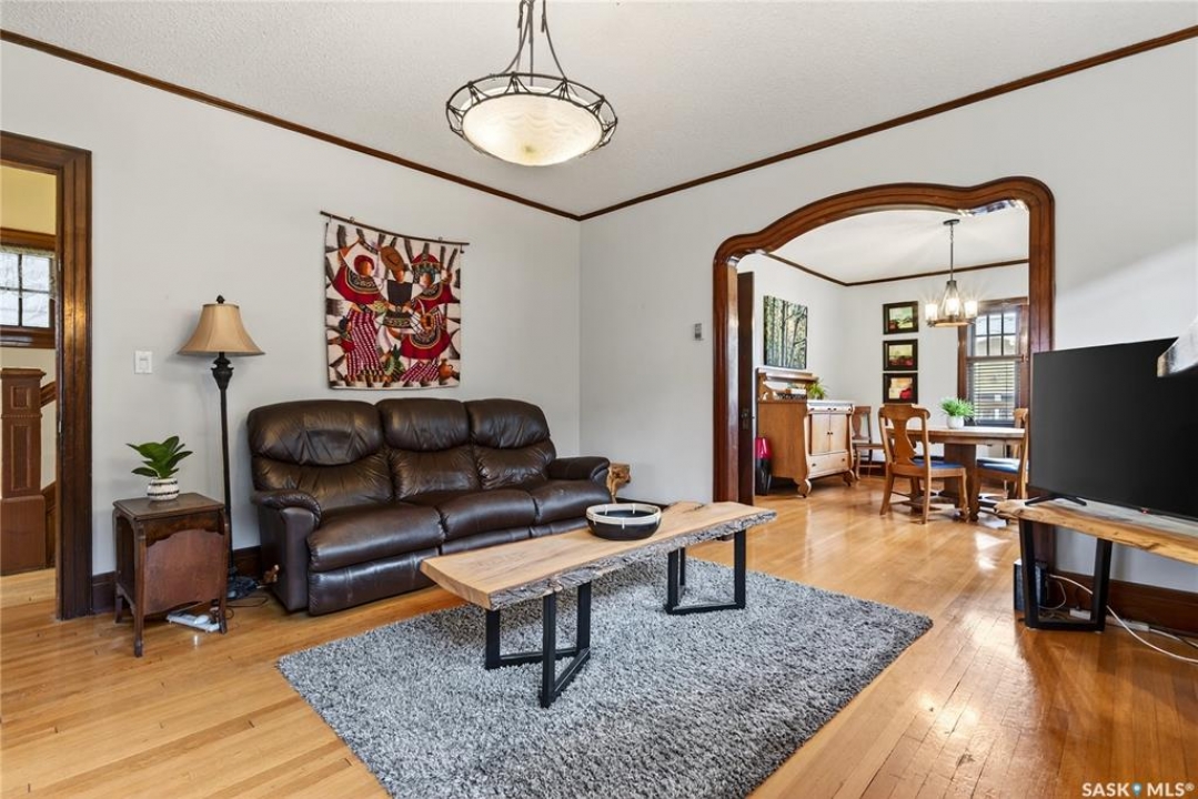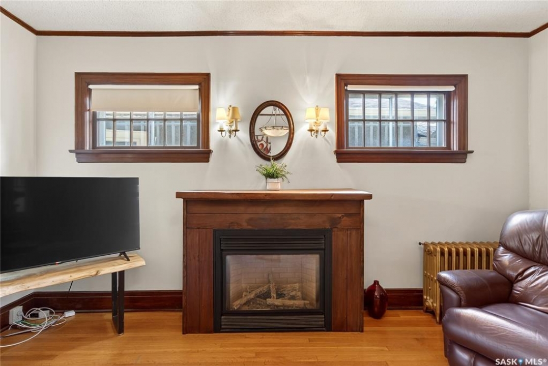 Welcome to this beautiful 1,675 sq. ft. well cared for character home, where charm and warmth meets thoughtful upgrades. Step into the generous entryway, a welcoming space for guests to shed coats and shoes before moving into the heart of this stunning residence. Original hardwood floors flow gracefully across both levels, complemented by bevelled glass doors, rich wood trim, and elegant archways that highlight the home's craftsmanship. The main living room is anchored by a unique gas fireplace, crafted with reclaimed wood from the historic Lumsden elevator—a great conversation piece for cozy nights. Just beyond, the bright south-facing office offers an inspiring workspace and the perfect haven for your indoor greenery. Gatherings are effortless in the spacious dining room, ideal for holiday feasts or casual weekly entertaining. The kitchen features white cabinetry, stainless steel appliances, a double oven, and ample counter space. An eat-up breakfast bar invites conversation and connection while meals are prepared. Upstairs, the expansive primary bedroom includes a walk-in closet, while two additional bedrooms and a 4-piece bath with cast iron tub and updated tiles complete the second floor. The fully finished basement is a true bonus, warmed with in-floor radiant heat. With a kitchen area, family room, fourth bedroom, 4-piece bath, and laundry, it offers excellent potential as a roommate suite or guest retreat. Notable updates to the home include a durable metal roof and a high-quality Viessmann boiler , electric panel. Outdoors, the private backyard is perfect for summer relaxation on the low-maintenance deck. An oversized single garage adds even more value to this rare find. If you're seeking a well-maintained character home close to downtown, this gem may be for you!