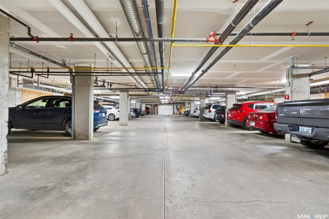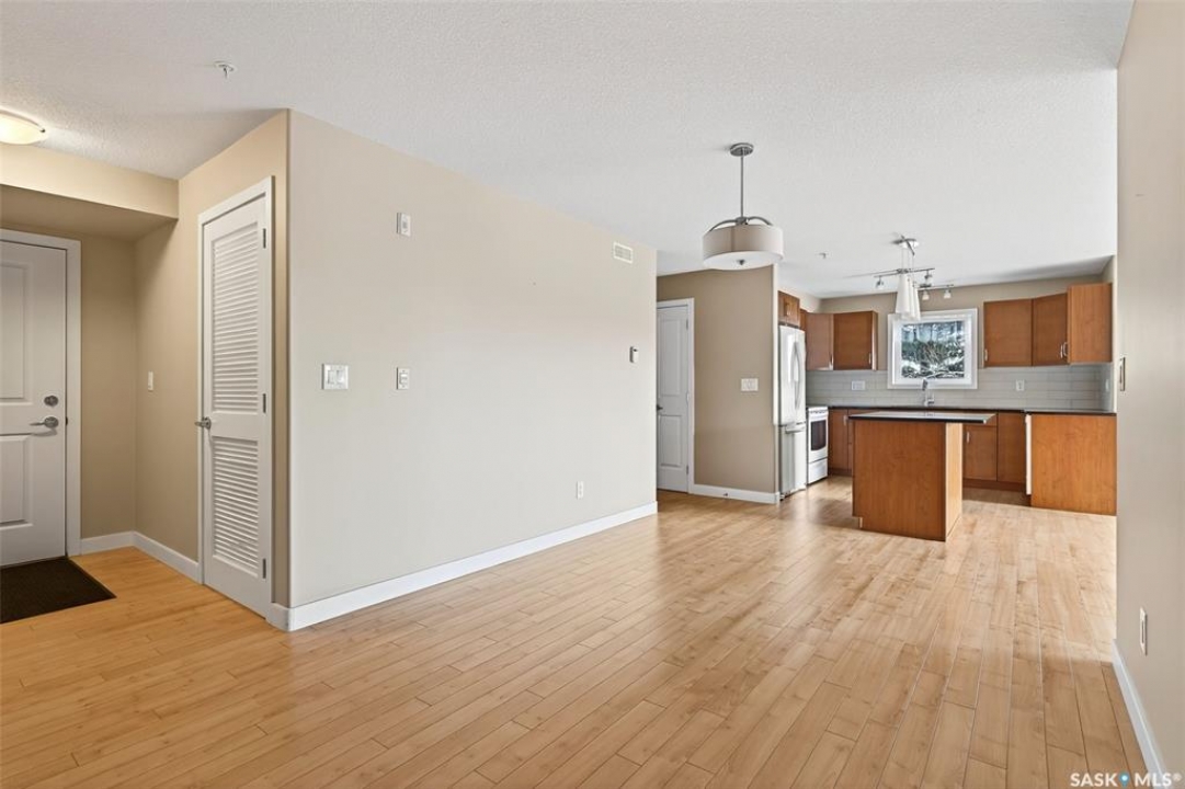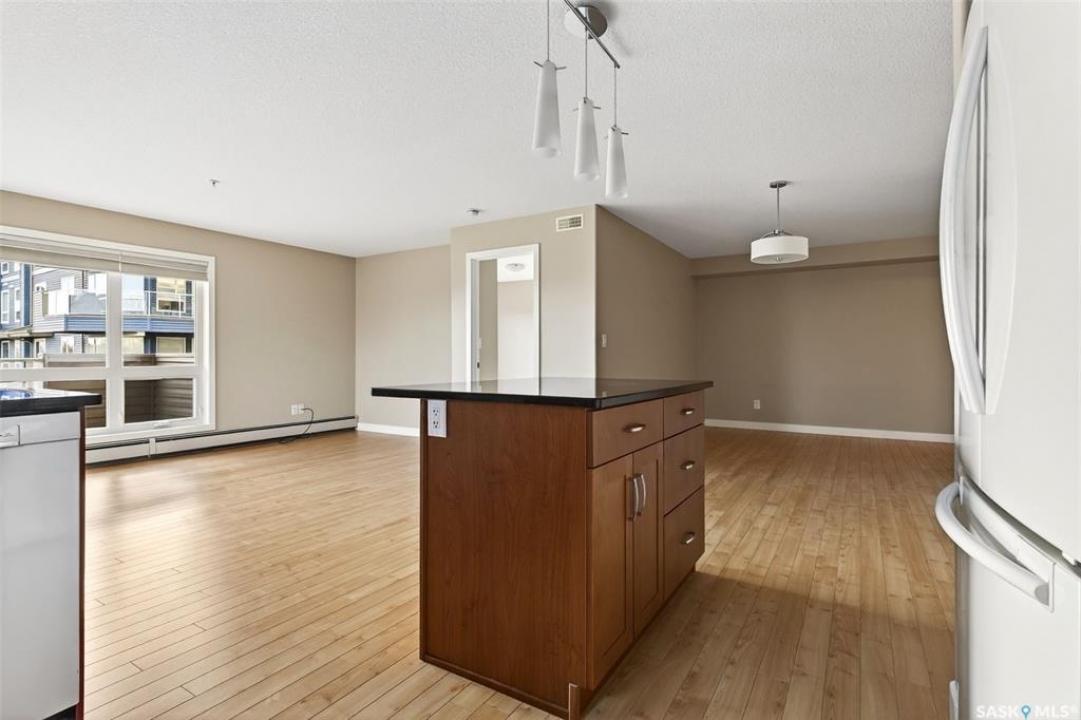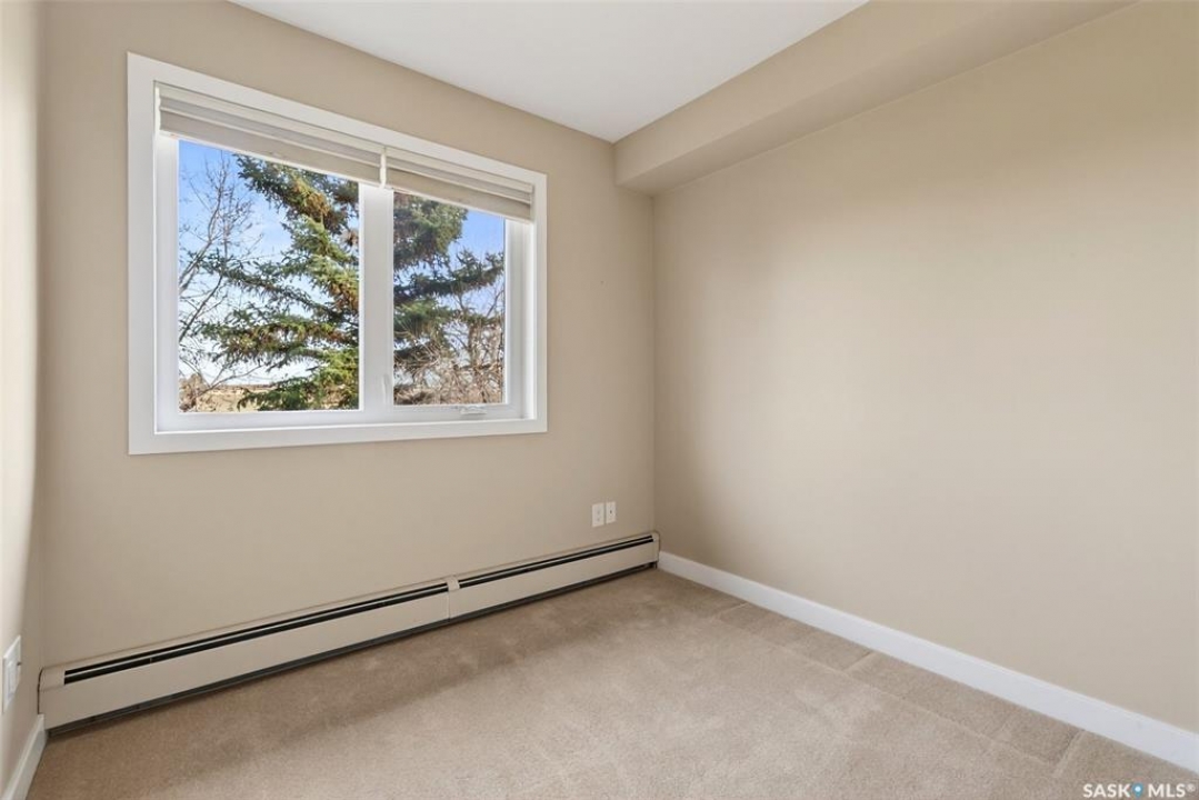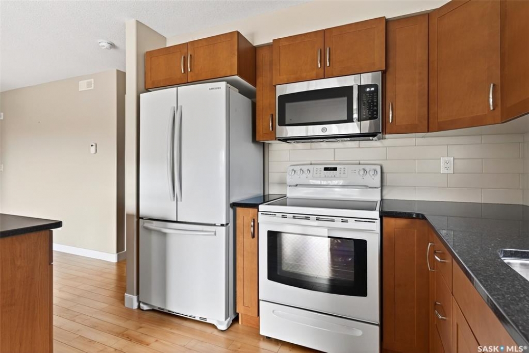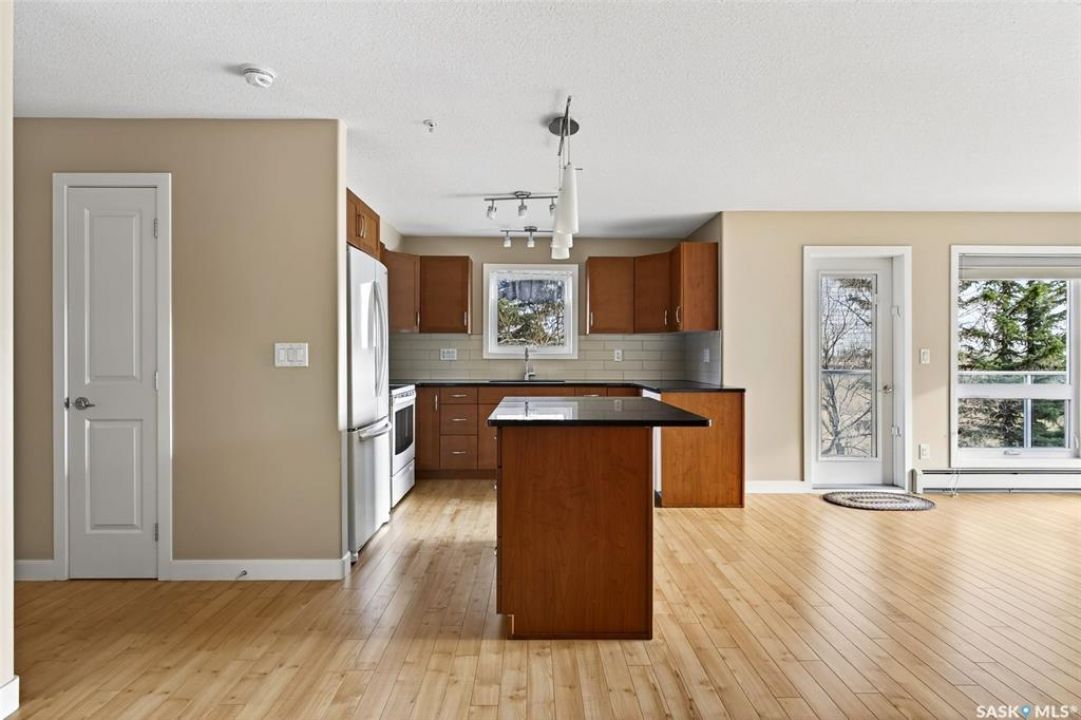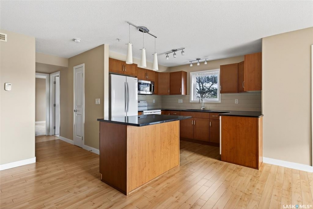 Beautifully maintained South- and East-facing corner unit with an open floor plan and an abundance of natural light. This 2 bedroom + den, 2 bathroom condo offers in-suite laundry, underground parking, and exceptional views of green space in an extremely quiet setting. Large windows maximize the wrap-around exposure, bathing the living areas in natural light. The kitchen features a new microwave hood fan, along with fridge, stove, and dishwasher; dark maple cabinetry with soft-close drawers, granite countertops, a centre island with bistro seating, and laminate flooring throughout. The dining area is conveniently situated off the kitchen and flows nicely into the spacious living room. A garden door opens to the wrap-around balcony with glass panels and natural gas BBQ hookup, overlooking wide open fields and tranquil natural green space — a peaceful outdoor extension of your living area. The generous primary bedroom features a walk-in closet and a private ensuite complete with a two-seat shower. The second bedroom is also spacious, and the den is ideal for an office or cozy reading room. The in-suite laundry/storage room includes washer, dryer, and freezer for added convenience. Additional features include underground parking (included in the condo fees), and ample visitor parking. Residents also enjoy access to the building's amenities room, exercise room, and elevator. Condo fees include: heat, water/sewer, garbage removal, snow removal, lawn care, reserve fund contribution, common insurance, and exterior building maintenance
