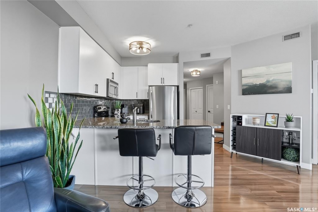 Don't miss out on this beautifully appointed condo located in the desirable east end of Saskatoon. This 2 bedroom, 2 bathroom corner unit features an open concept layout with beautiful modern finishes and plenty of natural light. As you step into the unit, you are greeted by a spacious foyer with a large coat closet and convenient in-suite laundry. The open-concept living and dining area is perfect for entertaining guests, with views overlooking the green space across the road and patio doors leading out to a private corner balcony (storage room on the balcony). The modern kitchen boasts a timeless appearance with stainless steel appliances, sleek but classy cabinetry, and a nicely sized island for casual dining. The primary bedroom features a walk-in closet and a 3-piece ensuite bathroom with a walk-in shower. The second bedroom is also a good size and is serviced by a 4-piece bathroom. Additional features of this unit include air conditioning, underground parking, and a bonus above-ground stall as well. Located just steps away from shopping, restaurants, and public transportation, this stunning condo offers a convenient, low-maintenance lifestyle for those looking to downsize or enter the property market. Don't miss out on this fantastic opportunity to own a beautiful condo in a sought-after location.