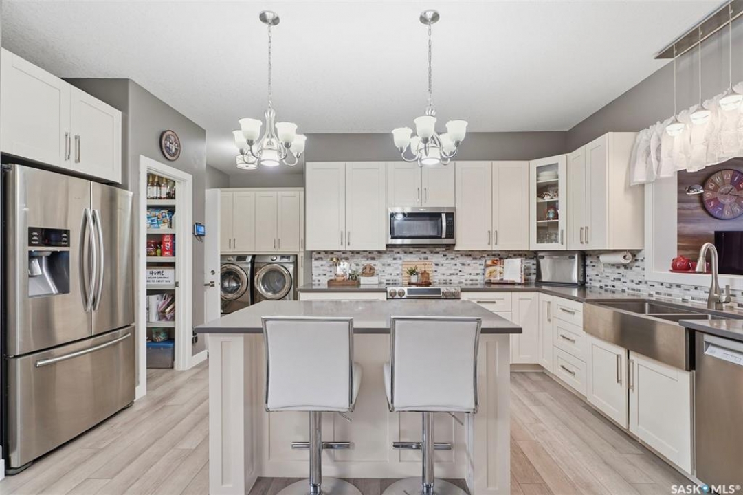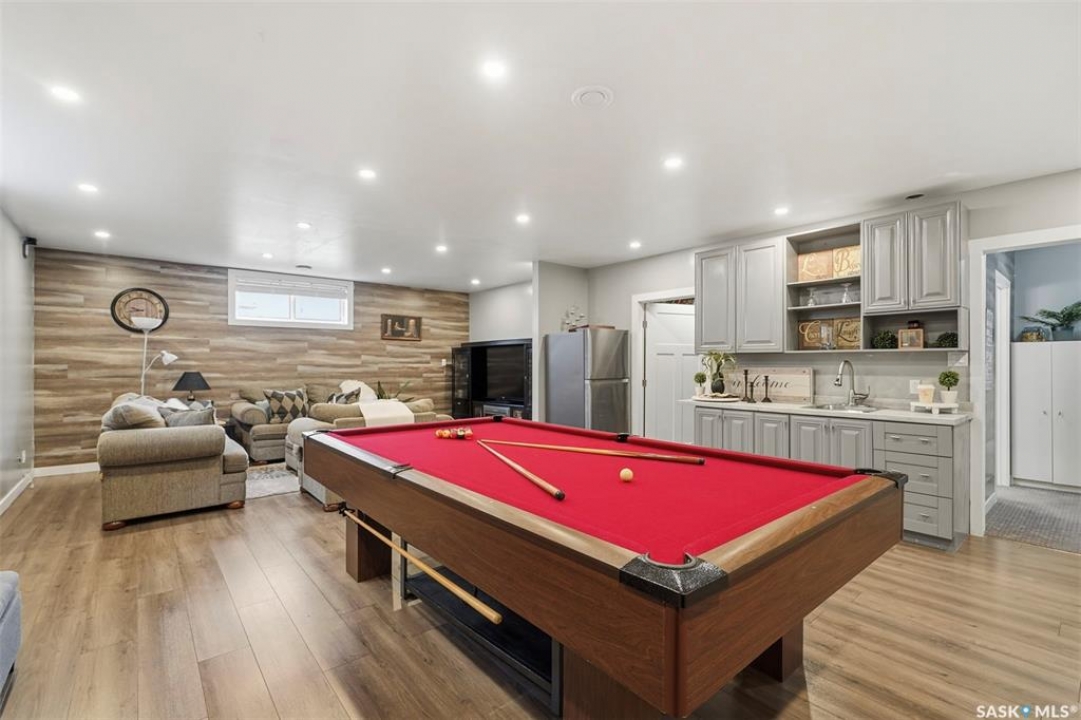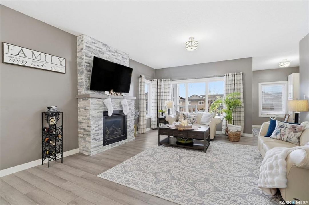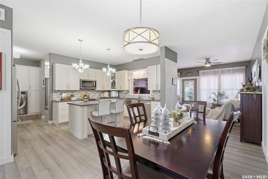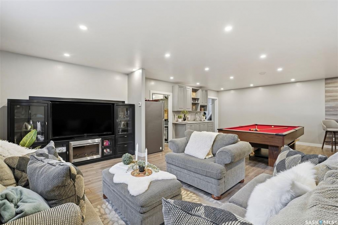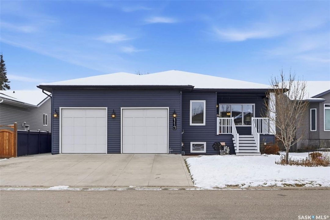 Welcome to 113 Olauson Crescent, where comfort, space, and everyday luxury meet. This rare bungalow offers 2824 sq ft of living space , with 5 bedrooms, 3 bathrooms, multiple living spaces, and a fully finished basement. Inside, the airy 9-foot ceilings and sun-filled windows set the tone. The main floor is designed with real life in mind: a formal living room with a cozy fireplace, a separate family room, and an additional sitting area that invites morning coffee, quiet conversations, or curling up with a book. The flow feels natural, open, and incredibly comfortable — the kind of layout that makes hosting or unwinding effortless. The kitchen is the heartbeat of the home. Featuring a walk-in pantry, an oversized island, and tons of cabinetry, it's built for busy households, big holiday meals, and everyday cooking that doesn't feel cramped or cluttered. From here, step right into your private outdoor retreat — a spacious deck and patio with a gas BBQ hookup, perfect for crisp fall grilling, warm summer nights. The lower level opens up into a massive, beautifully finished basement built for fun and relaxation. A full-size pool table (included!), a bar area with sink, a 4-piece bath, two large bedrooms, and generous storage make this level feel like its own getaway. And with in-floor heat throughout both the basement and the double attached garage, winters become something you barely notice.Work shop area as well in garage. Outside, raised garden beds are ready for your spring planting, and the yard offers plenty of room for pets, play, and quiet evenings outside. The community is welcoming, the school is just a short walk away, and with Saskatoon only minutes down the road, every amenity is within easy reach. This is a home designed for people who want space, comfort, and quality — without giving up the warmth and charm of small-town living. Quick possession is available, you could be settled in before Chrismas,call your favourite REALTOR � to book a showing.