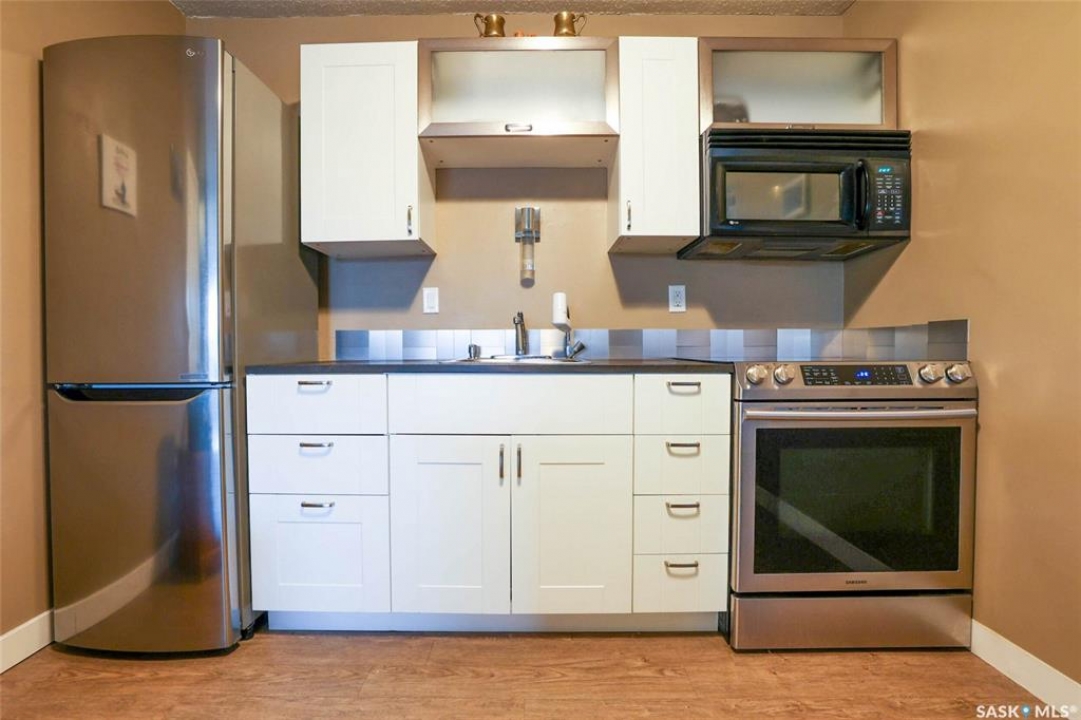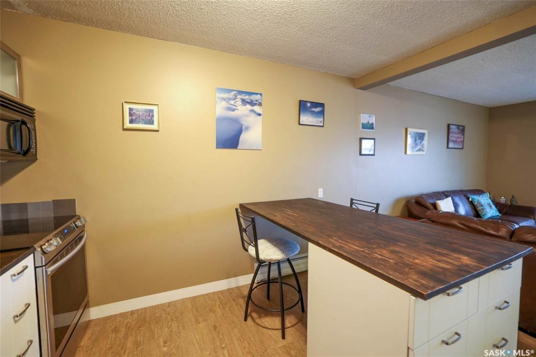 Prime Hillsdale location for this Top Floor Open Concept totally updated 1 bedroom 1 bathroom condo. Newer Vinyl Plank flooring throughout. Kitchen features Modern white cabinetry, handy eating/work island with pot drawers, stainless fridge/stove/microwave included. Kitchen overlooks the spacious livingroom with vinyl plank flooring, patio doors to spacious deck and window air conditioner. Good size bedroom with a large closet. Updated 4 pc bathroom with white vanity and vessel sink, newer fixtures and tub surround. Good size storage room with shelving. One electrified parking stall. There is a shared laundry room in the building. This building is clean and well managed.