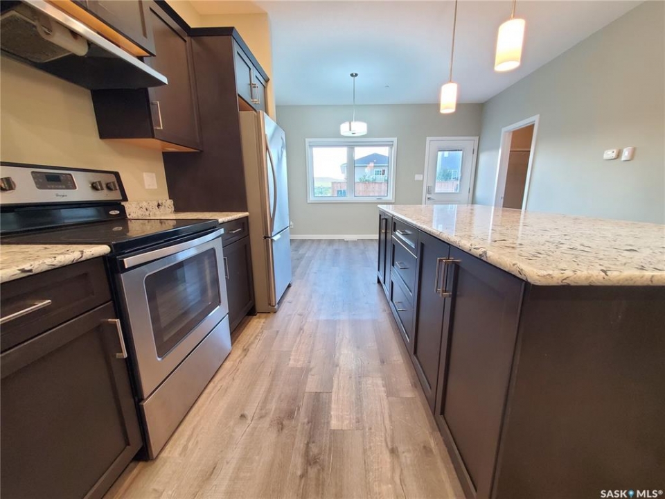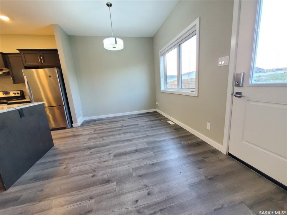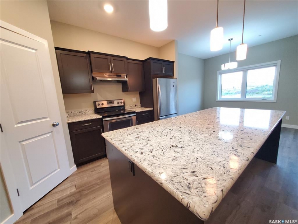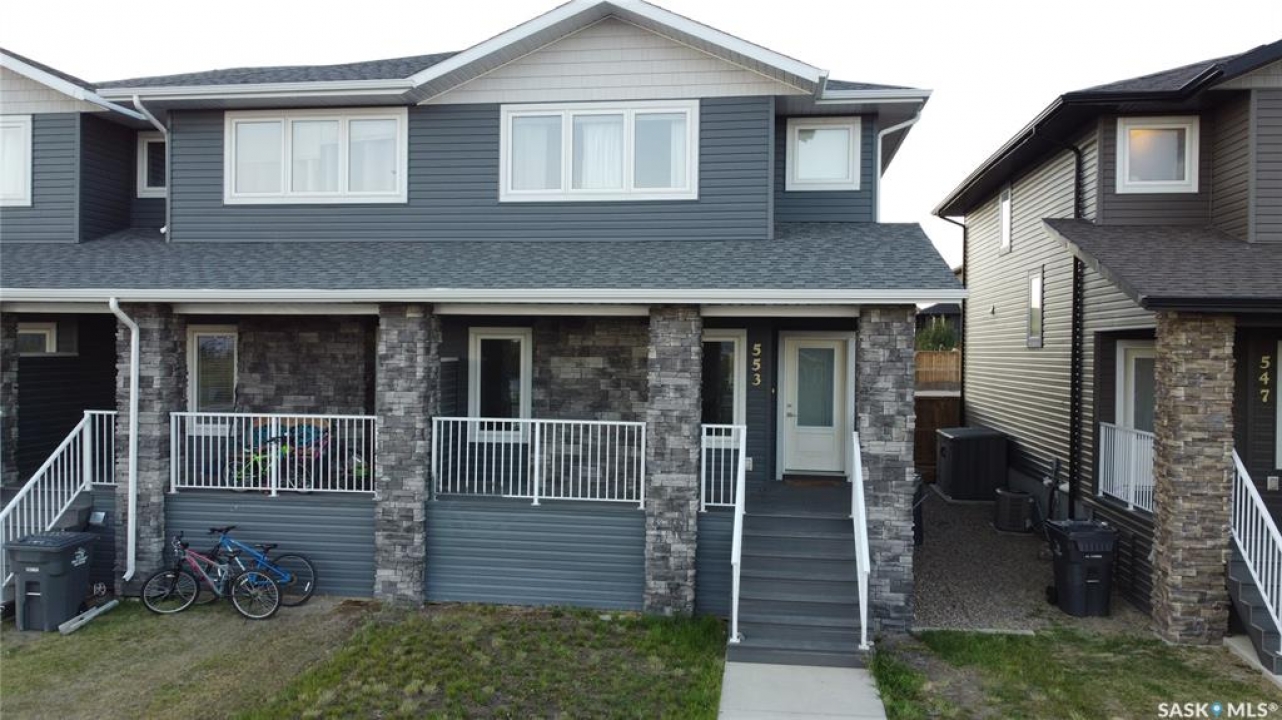 This standout end unit townhome at 553 Douglas Drive, Swift Current, combines quality craftsmanship, a prime Sask Valley location, and a layout designed for everyday ease. The elevated front deck looks out toward Ecole Centennial School, giving you a pleasant view before you even step inside. The main floor offers a smooth, open flow with a welcoming living room leading into a sharp-looking kitchen featuring dark, rich-looking cabinetry, stainless steel appliances, granite counters, a four-seat island, and a built-in desk for quick tasks. The bright dining area opens to a private back deck, fenced yard, and double gravel parking, while the rear entry brings extra storage, a plug-in for your deep freeze, and a handy half bath. Upstairs, you will find two comfortable secondary bedrooms, including one with a walk-in closet, the laundry area, and a full bathroom, followed by a generous primary suite with its own spacious walk-in. The finished basement rec room adds bonus living space with a bathroom already roughed in. The home's mechanicals include a heat recovery unit, a high-efficiency furnace, central air conditioning, underground sprinklers, a fire suppression system, and hard-wired smoke detectors to complete a package that is comfortable, convenient, and safe. If you want a home that performs as well as it looks, this is the one to move on before someone else does.