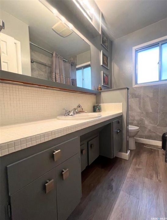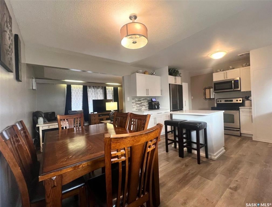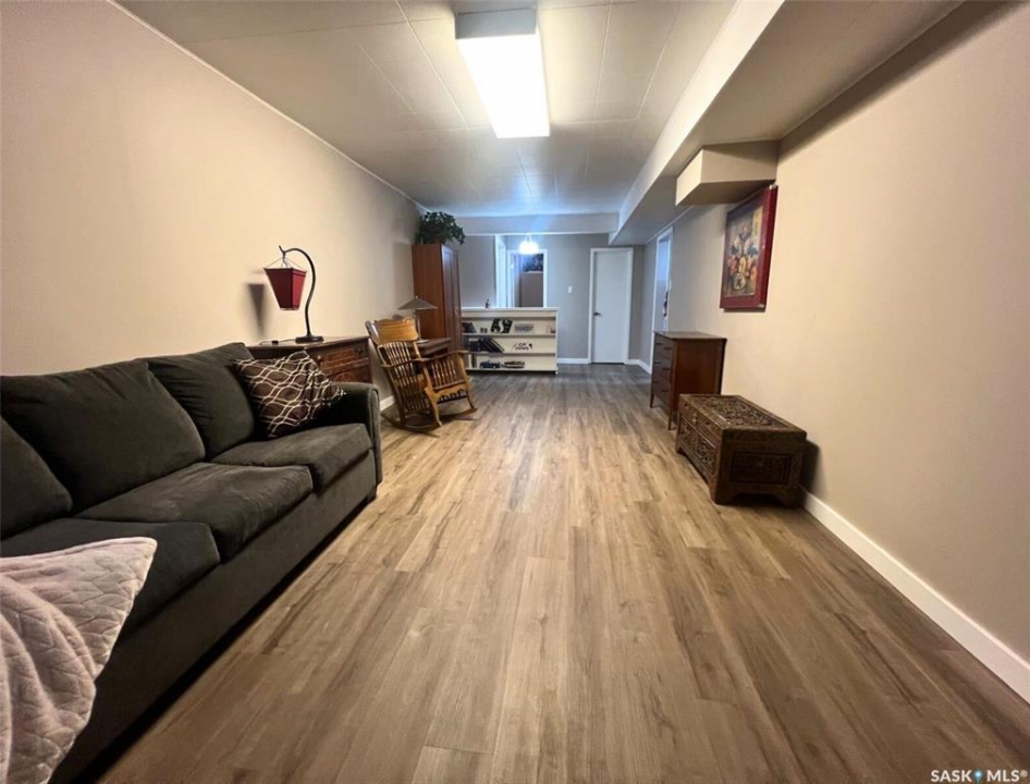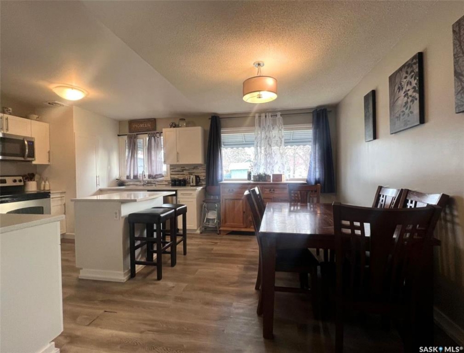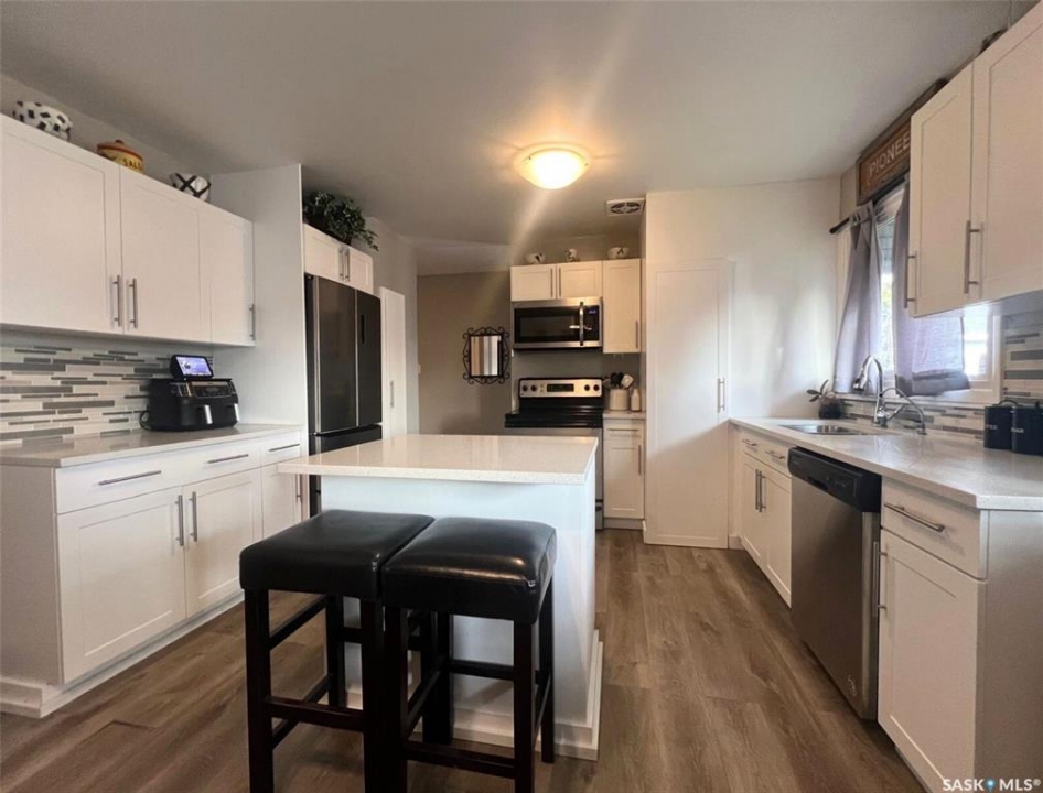 This updated and pleasant four-bedroom, two-bathroom bungalow features a comfortable layout and rests on a lot which hosts a single-car detached garage with a metal roof, a yard with brick patio and it is framed with maintenance-free fencing. Inside the front door the entry has a coat nook to the left, looking straight ahead you will see the back entrance, while to your right the living room features a bright west-facing picture window. Vinyl plank flooring wraps around to the dining room and to the lovely, updated kitchen which features new cabinetry with soft-close drawers, quartz countertops, stainless steel appliances, an island with an overhang for bar-height seating, and a large window looking outside to the backyard. Down the hallway there is a storage closet, and the spacious master bedroom rests across the hall from the other main-floor, comfortable-sized bedroom. The 4-piece bath showcases an elegant marble-like tiled shower and partially tiled walls. Downstairs, the laundry room sits to the left at the bottom of the stairs, and nearby is the family room which is suitable as a TV room or home gym space, there are two additional bedrooms, and a 3-piece bathroom. The basement also features updated vinyl-plank flooring throughout. Other features/updates include a water heater(2021), reverse osmosis water system(2022), a water softener(2022), and central vac. Call for more info or to book your own personal showing!