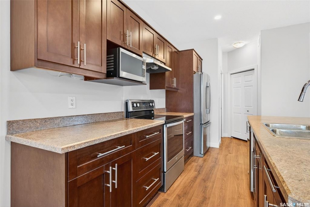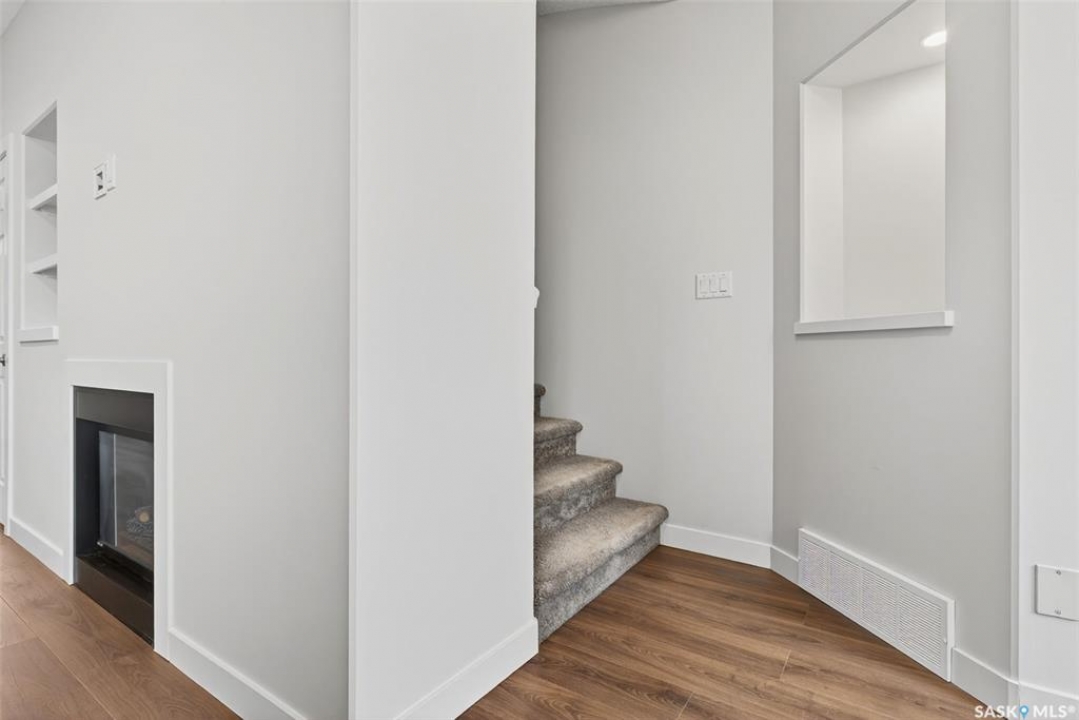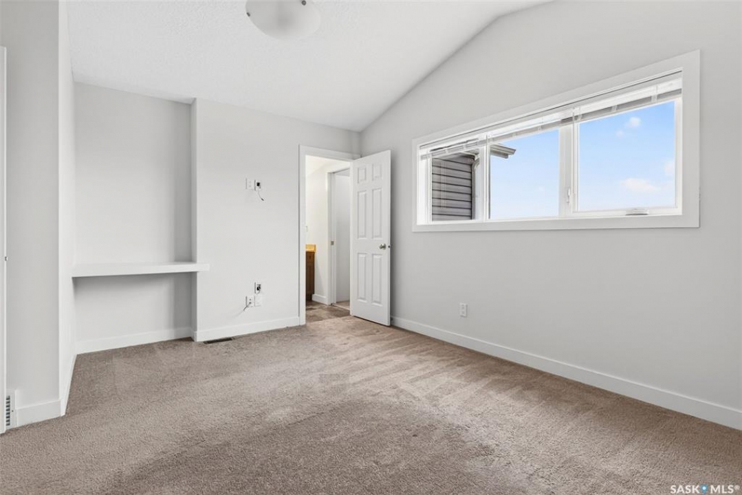 Welcome to 4125 Green Olive Way E, a beautifully maintained two-storey home located in the heart of Regina's sought-after Greens on Gardiner neighbourhood. Built in 2012 and offering 1,468 sq ft of well-designed living space, this property delivers modern comfort, family-friendly function, and excellent curb appeal. The main floor features a bright, open layout with a spacious living room finished in warm laminate flooring and accented by a cozy gas fireplace—perfect for relaxing evenings at home. The kitchen offers great counter space, a central island with an eat-up counter, and a functional layout that flows into the dining area, making everyday meals and entertaining a breeze. A convenient 2-piece bathroom completes the main level. Upstairs you'll find three comfortable bedrooms, including a generous primary suite with a 3-piece ensuite and a walk-in closet. Two additional bedrooms, each finished with soft carpet, share a well-appointed 4-piece bathroom—ideal for children, guests, or a home office setup with 2nd floor laundry for added convenience! The unfinished basement with a separate side entrance provides a blank canvas for your future development plans, offering excellent potential for a future suite (subject to municipal approval). Outside, the property sits on a 3,121 sq ft lot with a fenced backyard, lawn space, and a double detached garage that provides secure parking and extra storage. Located in a vibrant, walkable community close to parks, schools, shopping, restaurants, and all the amenities southeast Regina is known for, this home is an excellent option for families, first-time buyers, or anyone seeking a move-in-ready property in a premium location. Don't miss your chance to make this one yours!