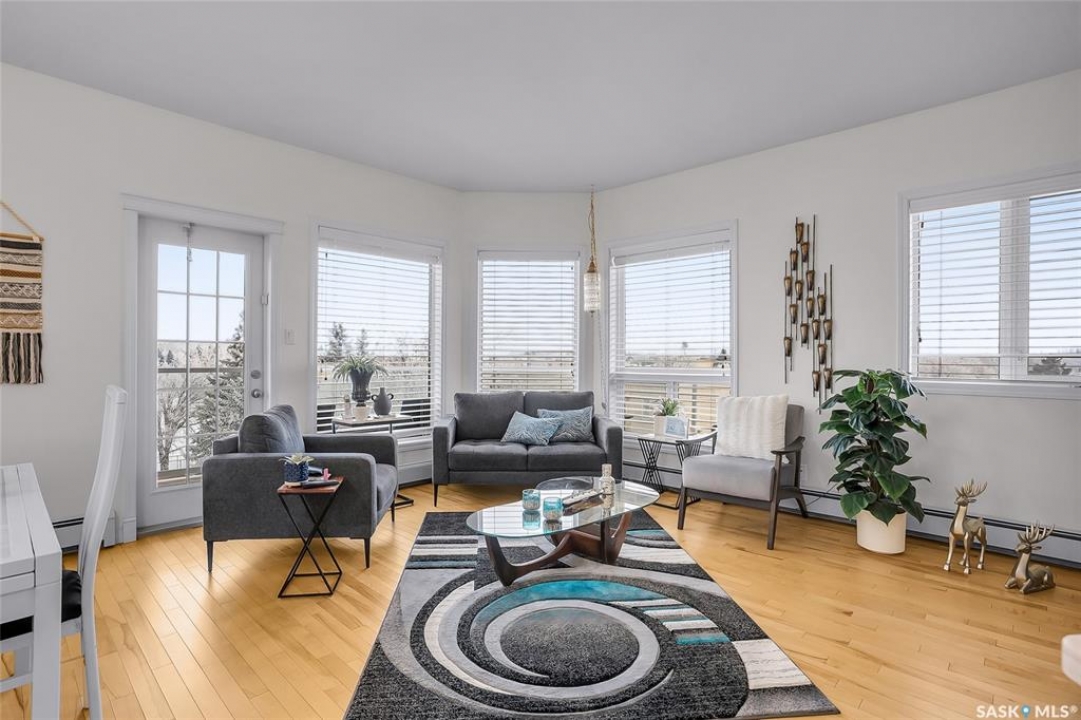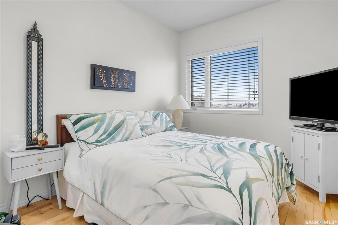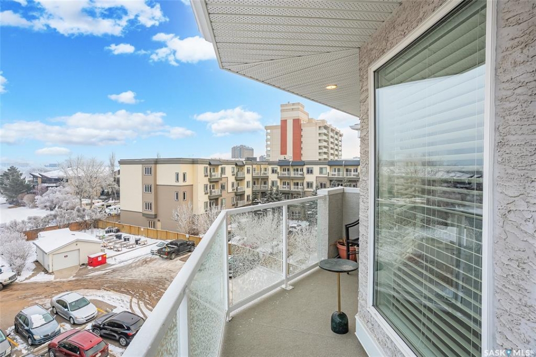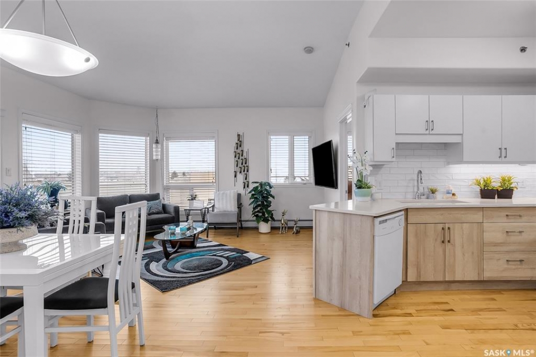 Top floor corner 2 bedroom & den with wrap-around covered balcony; ideal for those looking to simplify without sacrificing space or quality. Welcome to this beautifully bright and thoughtfully updated condo offering an open airy layout, with generous sized rooms, vaulted ceilings, and plenty of natural light with views overlooking the park. The modern kitchen is a standout feature, offering ample storage, updated 2-tone cabinetry, quartz counters, under cabinet lighting & textured subway tile backsplash. Whether you enjoy cooking or prefer easy, low-maintenance meals, this kitchen supports both with ease. The open dining and living areas flow seamlessly together, making it effortless to entertain family and friends or simply enjoy a quiet evening at home. Large windows brighten the space throughout the day, while the private 4'x22' wrap-around covered balcony provides a peaceful spot perfect for morning coffee, fresh air, or relaxing with a book. This home has been meticulously cared for and offers the comfort of hardwood flooring throughout for easy upkeep, a neutral and modern design, and a layout that's highly functional without feeling overwhelming. The building is well maintained, with convenient underground parking (#19 P1 Level with individual storage room), wheelchair accessible with elevator, garbage chute, private fitness room & Recreation room featuring a pool table, shuffle board, reading nook & kitchenette. Prime Saskatoon location in Nutana SC offering easy access to nearby shopping at Market Mall with all your desired amenities including medical services & grocery, parks, and transit—making everyday living simple and stress-free. If you're looking to transition into a more manageable lifestyle while still enjoying style, space, and serenity, this condo is the perfect fit.