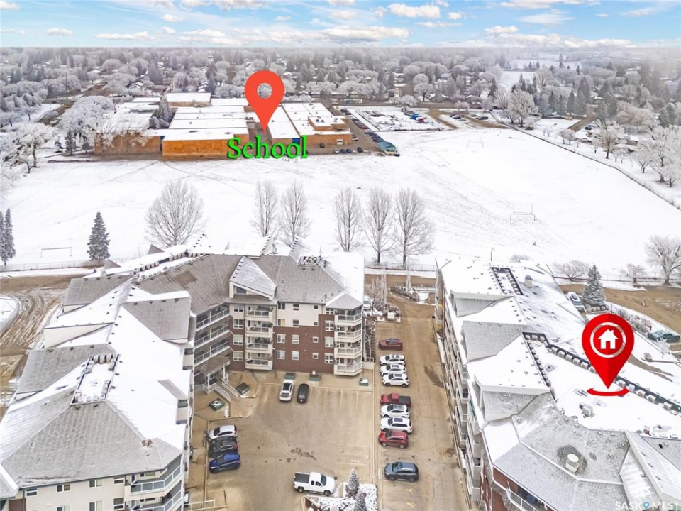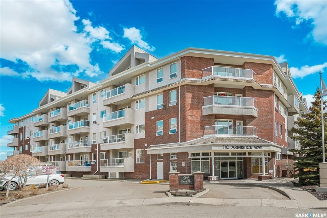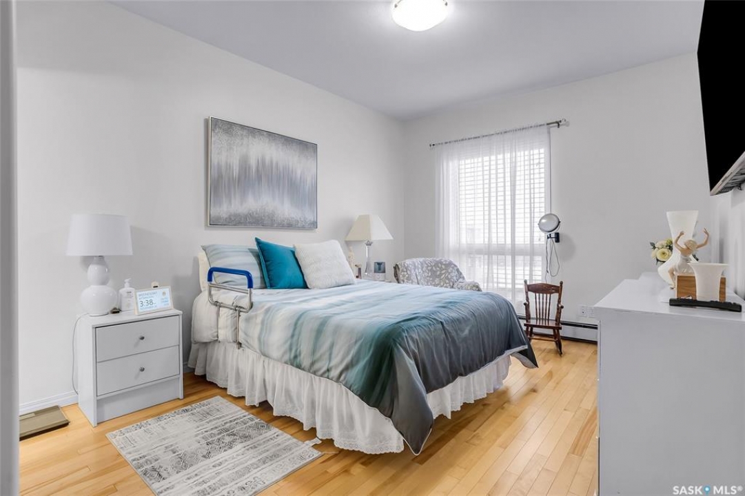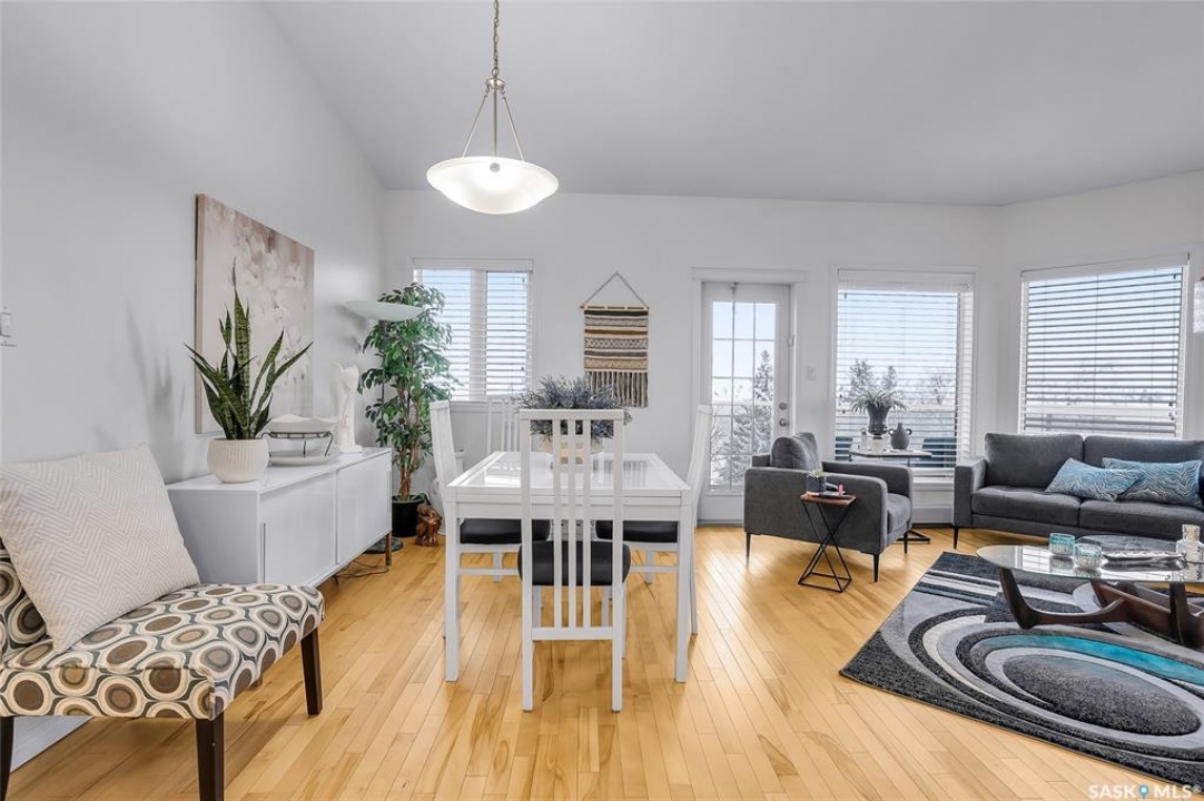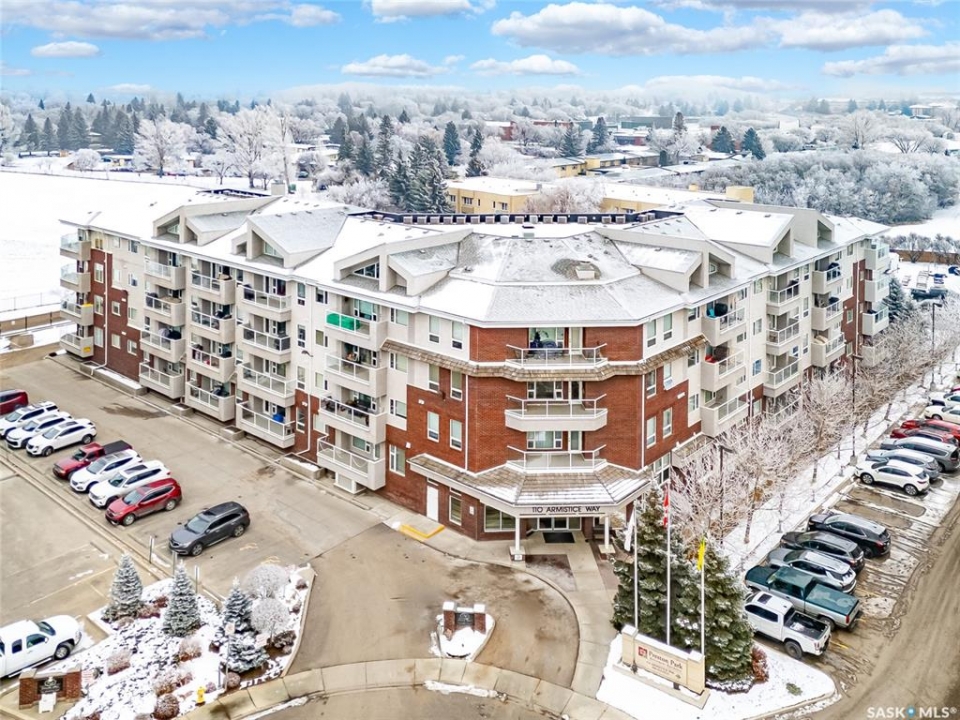 Top floor corner 2 bedroom & den with wrap-around covered balcony; ideal for those looking to simplify without sacrificing space or quality. Welcome to this beautifully bright and thoughtfully updated condo offering an open airy layout, with generous sized rooms, vaulted ceilings, and plenty of natural light with views overlooking the park. The modern kitchen is a standout feature, offering ample storage, updated 2-tone cabinetry, quartz counters, under cabinet lighting & textured subway tile backsplash. Whether you enjoy cooking or prefer easy, low-maintenance meals, this kitchen supports both with ease. The open dining and living areas flow seamlessly together, making it effortless to entertain family and friends or simply enjoy a quiet evening at home. Large windows brighten the space throughout the day, while the private 4'x22' wrap-around covered balcony provides a peaceful spot perfect for morning coffee, fresh air, or relaxing with a book. This home has been meticulously cared for and offers the comfort of hardwood flooring throughout for easy upkeep, a neutral and modern design, and a layout that's highly functional without feeling overwhelming. The building is well maintained, with convenient underground parking (#19 P1 Level with individual storage room), wheelchair accessible with elevator, garbage chute, private fitness room & Recreation room featuring a pool table, shuffle board, reading nook & kitchenette. Prime Saskatoon location in Nutana SC offering easy access to nearby shopping at Market Mall with all your desired amenities including medical services & grocery, parks, and transit—making everyday living simple and stress-free. If you're looking to transition into a more manageable lifestyle while still enjoying style, space, and serenity, this condo is the perfect fit.