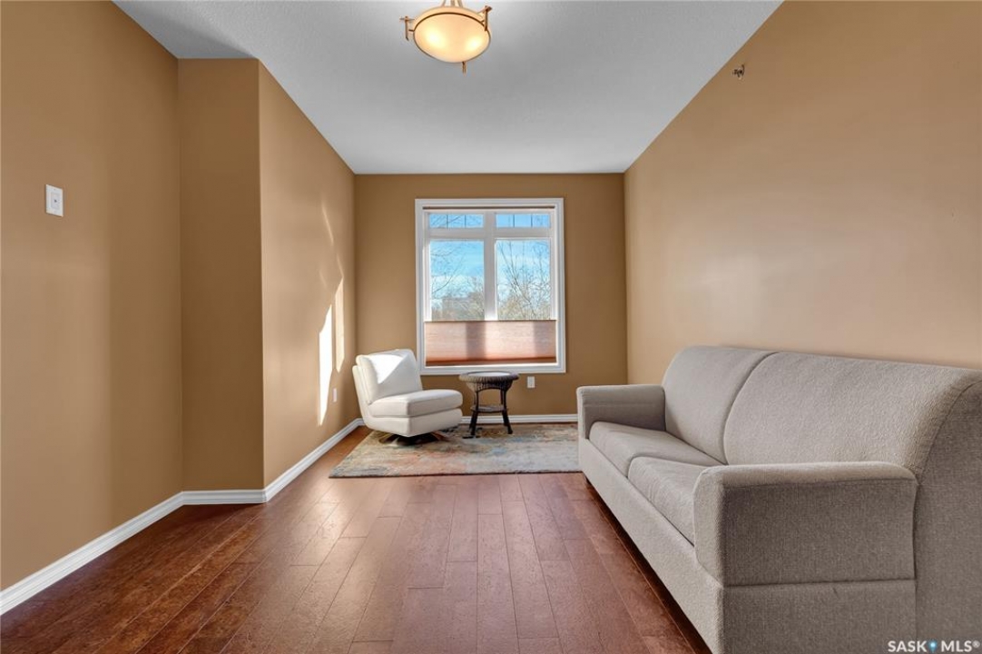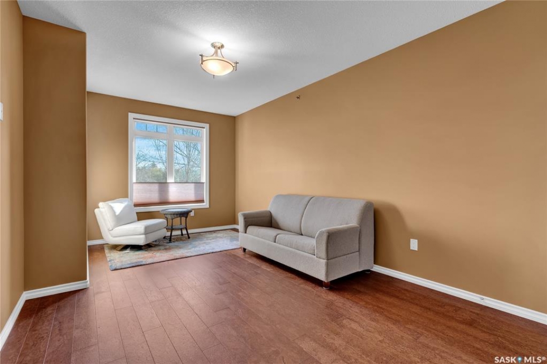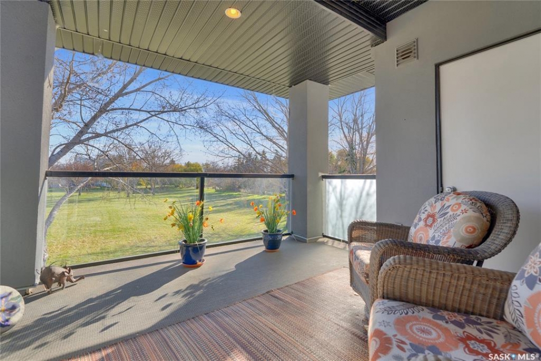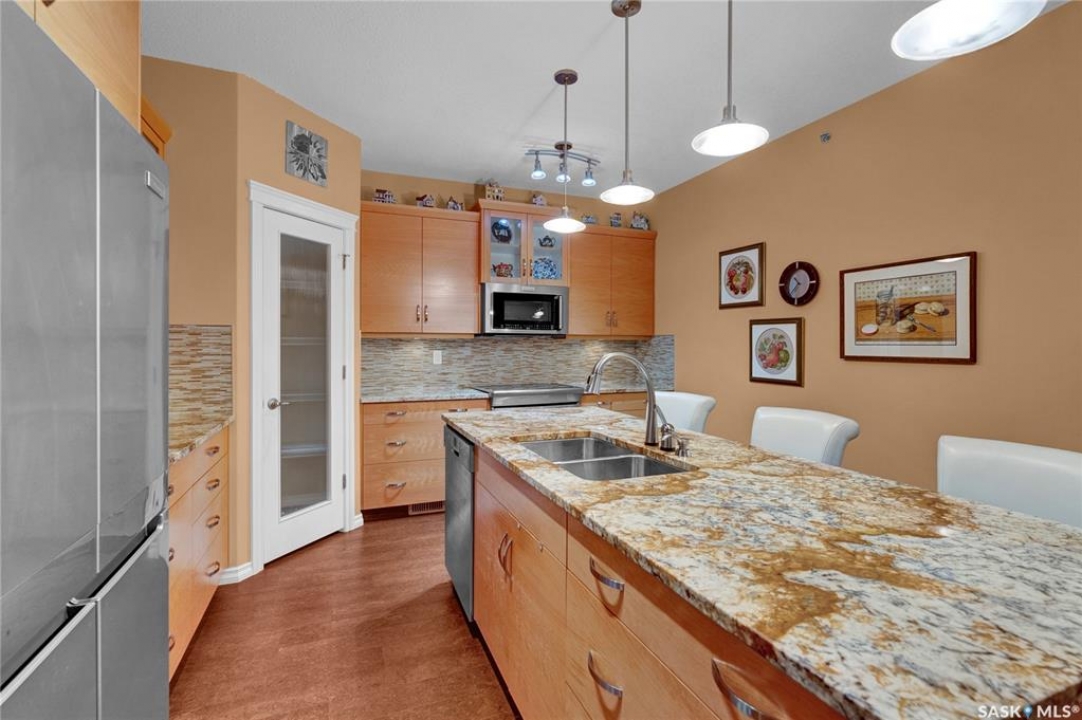 Experience refined condo living in this executive-style 1,475 sq. ft. residence, featuring two bedrooms plus a den and tucked away in a quiet, secluded location on the second floor with serene views of the park. A spacious front foyer welcomes you into the home, showcasing warm cork flooring and an impressive open-concept layout enhanced by nine-foot ceilings. The bright living room offers a garden door with a Phantom screen leading to a large balcony complete with a natural gas BBQ hookup—perfect for relaxing or entertaining while enjoying the park setting. Adjacent is a generous dining area that flows seamlessly into the dream kitchen. This beautifully appointed space features upgraded horizontal-grain cabinetry, granite countertops, a large centre island, glass-panel upper cabinet doors, convenient pull-out drawers, upgraded stainless steel appliances, and a walk-in pantry. The park-facing primary bedroom is a true retreat, complete with a walk-in closet and a spacious 3/4 ensuite featuring built-in cabinetry and an oversized shower. A generous second bedroom is conveniently located near the full main bathroom. A versatile den or office, along with a dedicated laundry room and separate storage room, adds to the home's functionality. Additional highlights include two heated underground parking stalls and a secure storage locker. Residents enjoy a host of exceptional building amenities such as a guest suite, amenities room, exercise area, visitor parking, main-floor lounge, expansive outdoor patio, workshop, and beautifully maintained grounds. This exceptional property offers comfort, privacy, and convenience—truly a wonderful place to call home!