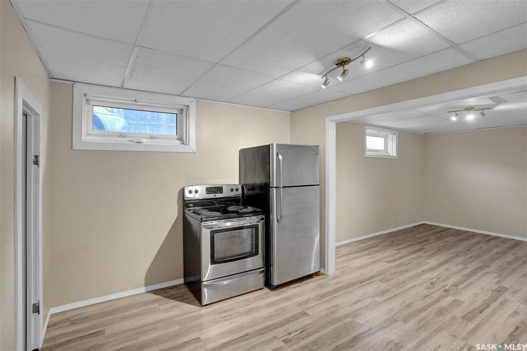 Welcome to 668 Grandview Street West in Moose Jaw. This well-maintained home offers excellent appeal for both homeowners and investors alike. The main level features an inviting open-concept layout that connects the living room and kitchen, creating a bright and functional space for everyday living. Beautiful oak hardwood flooring runs throughout the living areas, hallway, and bedrooms. The kitchen is equipped with a newer stove (2025) and fridge (2021), while two comfortable bedrooms and a full bathroom complete the main floor. The lower level includes a self-contained basement suite that was fully renovated in 2019. It features spray-foam insulated walls, durable vinyl plank flooring, a modern white kitchen, an updated bathroom, and a high-efficiency furnace. The suite also has a private entrance, offering flexibility for rental income or extended family living, and shares a common laundry area located in the basement. Outside, the property boasts a spacious yard and a 12' x 43' detached garage with overhead doors at both ends—ideal for vehicle access, storage, or workshop use. Major exterior improvements include new house shingles and siding (2014), garage shingles (2025), and a sump pump installation (2019). The city side of the sewer line has been replaced, and the front yard was beautifully landscaped in fall 2025, adding to the home's curb appeal.