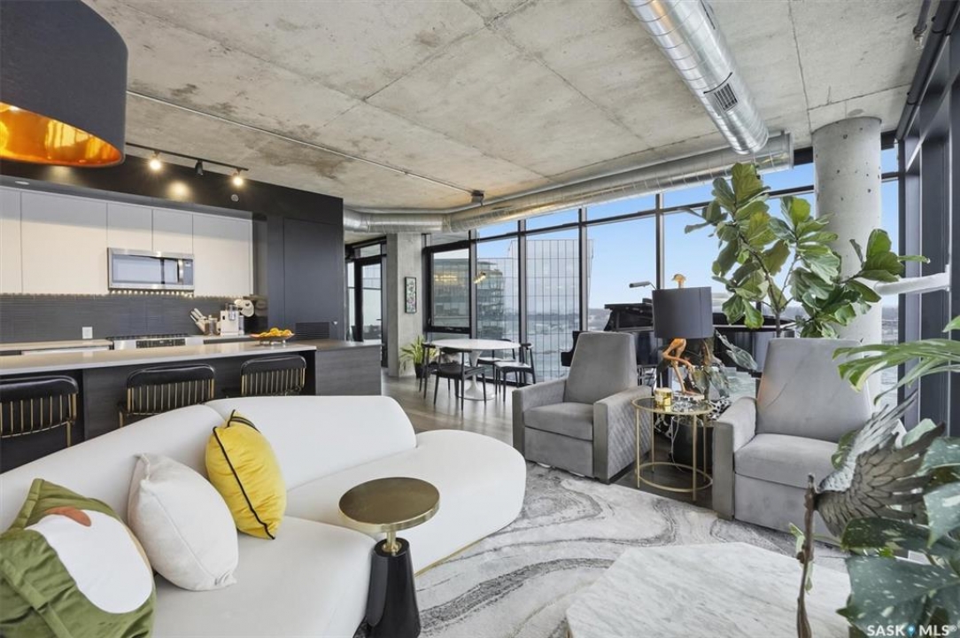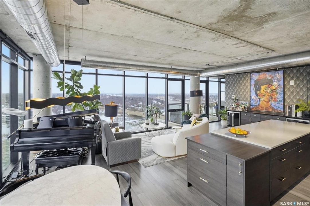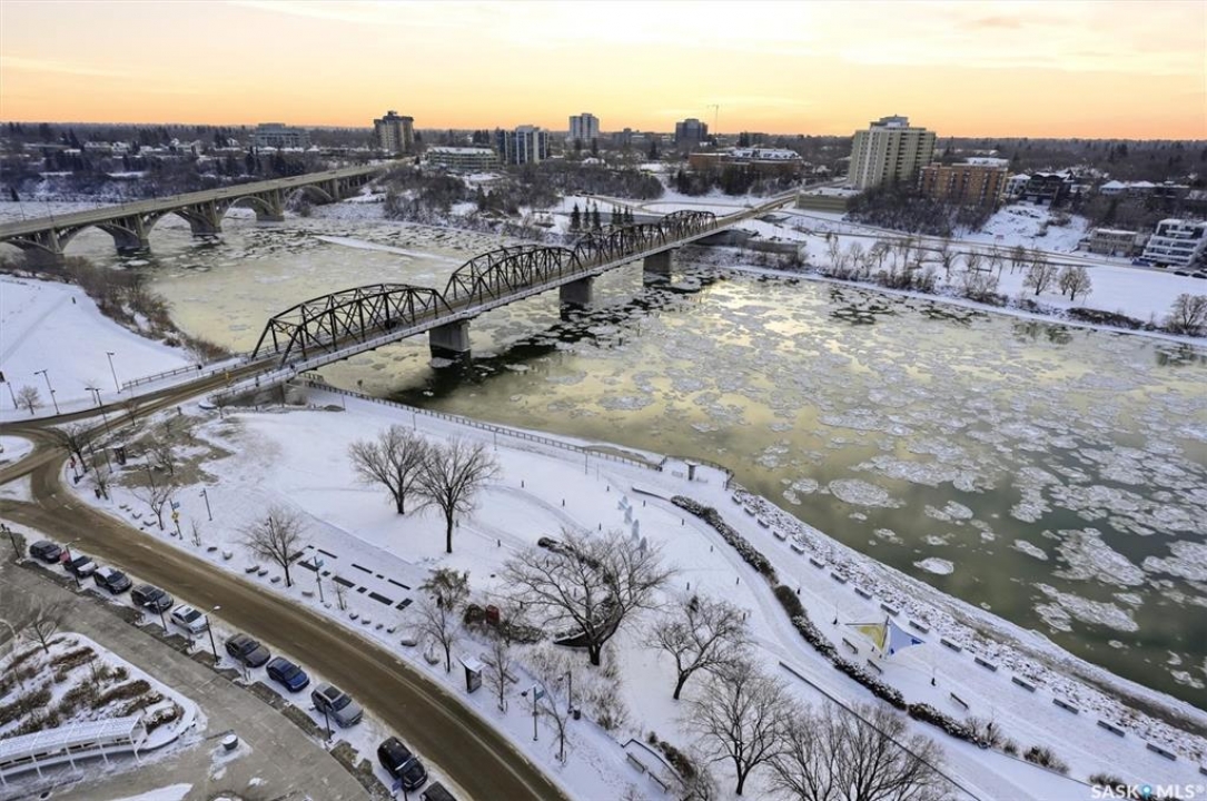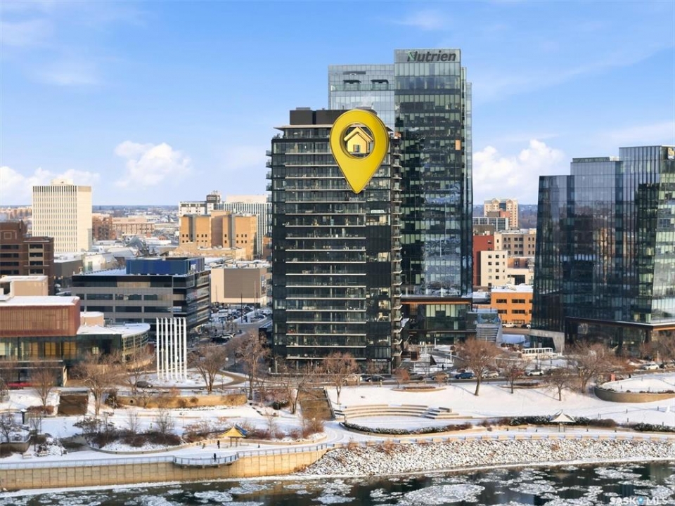 This 15th floor condo has one of the most prime panoramic views in the City. The 9' high floor to ceiling windows wrap around the entire east and south sides of the unit providing breath taking views of the ever changing river view. Two balconies, one off of the master bedroom facing east and another off of the living room facing south. Master ensuite has a large walk-in closet and walk-in shower. Over $80,000 in recent improvements including automatic blinds connected to app. Additional storage in kitchen and dining room custom built with matching cabinetry and 2 small fridges. Overhead light fixtures have been added in key areas. All stainless steel appliances in kitchen, quartz countertops, and a large island with overhang for sitting. Central air, engineered hardwood flooring throughout. Well equipped gym and lounge with pool table on main floor. Titled underground parking stall.