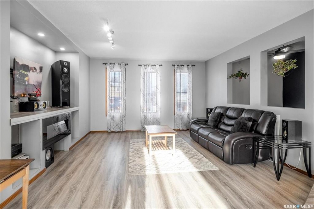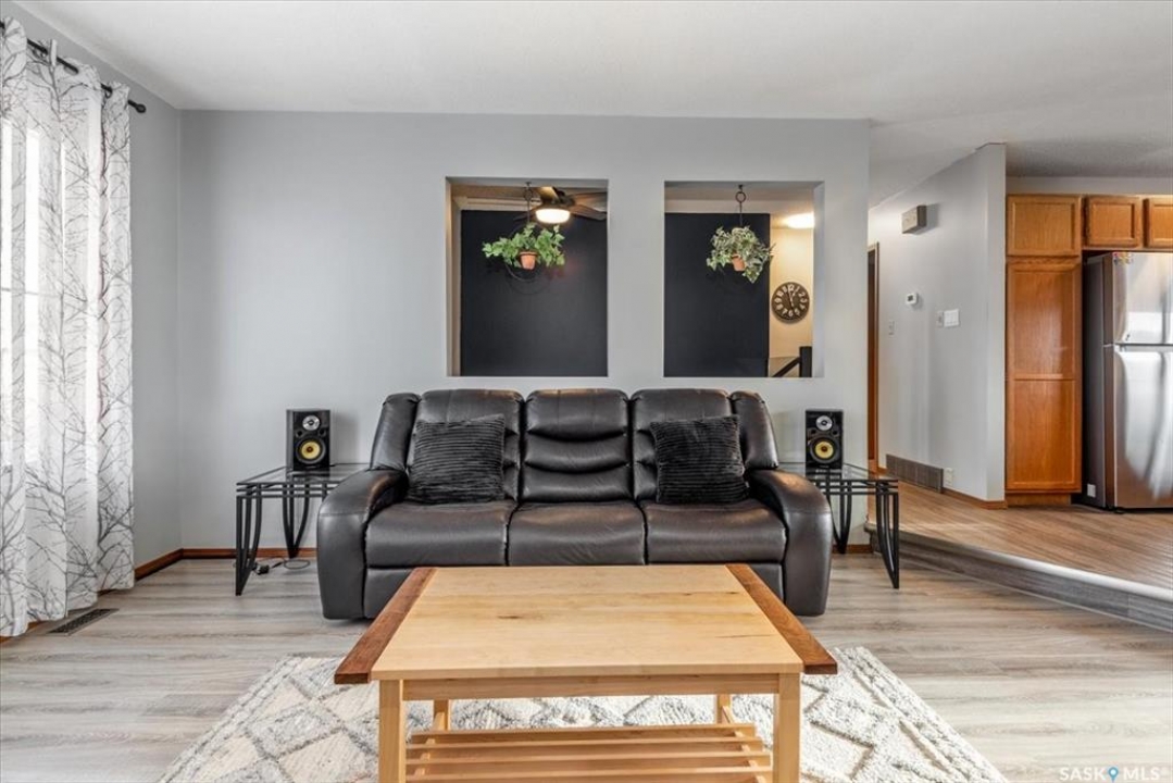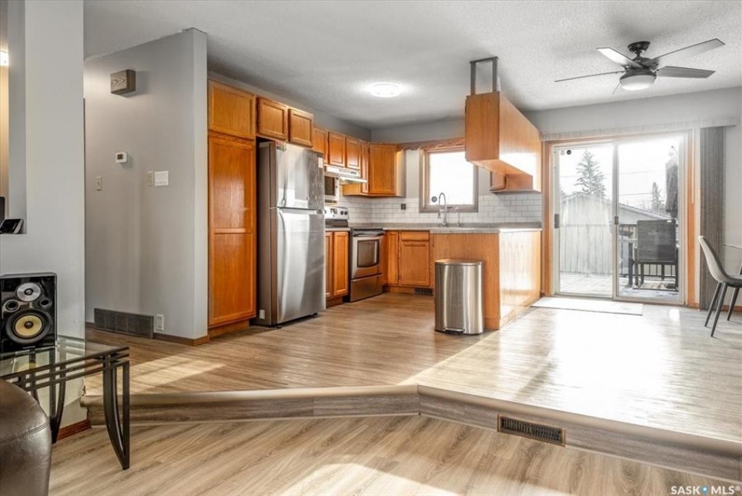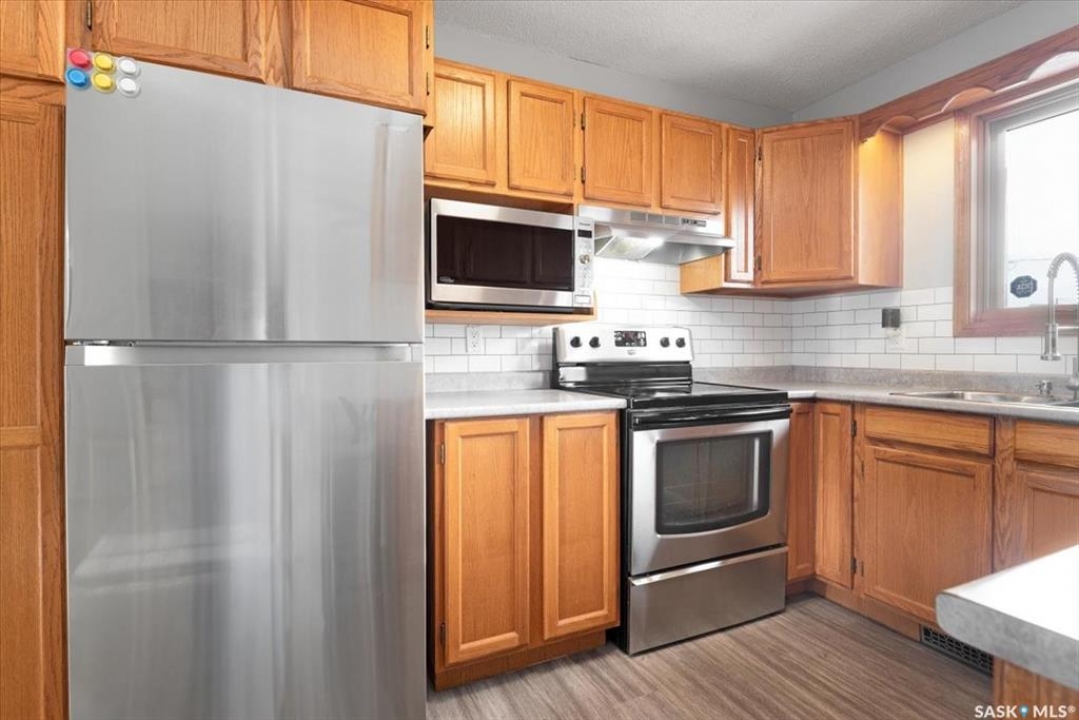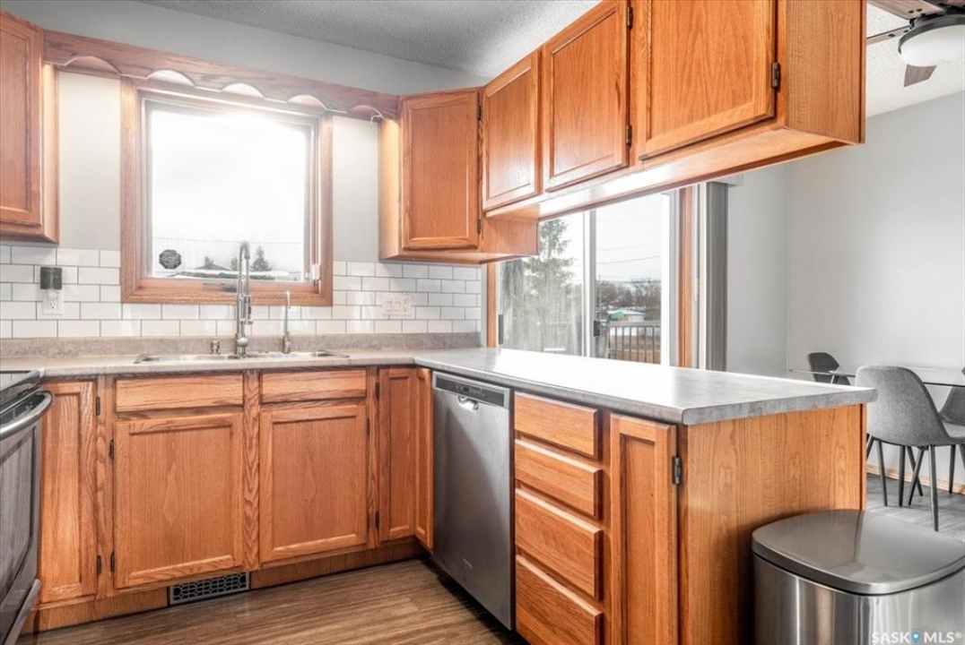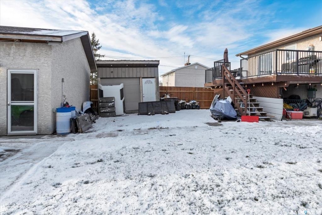 Welcome to a quiet area featuring a well-maintained 2-bedroom Bi-level on a spacious double lot. The property boasts an oversized, insulated, heated detached double garage (26' x 26') with a 10' ceiling, backing onto green space. Enjoy a private fenced yard in this updated home in Regent Park. This property has 50ft of frontage. The well-lit foyer leads to a bright kitchen/dining area opening to a sunken living room with updated flooring and paint. The main floor includes updated appliances in the kitchen, laundry, and bathroom. Downstairs, discover a large master bedroom and a second bedroom with updated flooring, an updated 4-pc bathroom. Garden doors off the kitchen lead to a large deck with new railings, overlooking a fire pit backyard, 25' x 30' concrete pad. This home, located on a quiet cul-de-sac, is ideal for first-time buyers and is close to schools and parks. Recent updates include shingles, garage doors, underground sprinklers, half bath, kitchen countertops, fence, entertainment area, and slag in the west backyard.