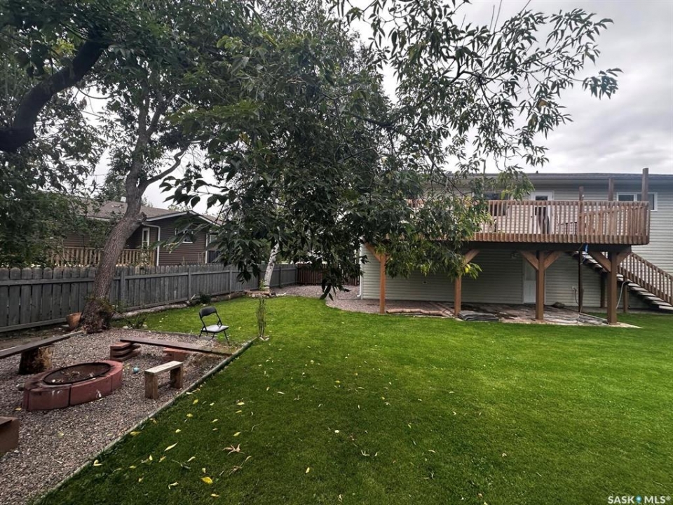 Outdoor: Deck, Fenced, Firepit, Garden Area, Lawn Back, Lawn Front, Trees/shrubs
